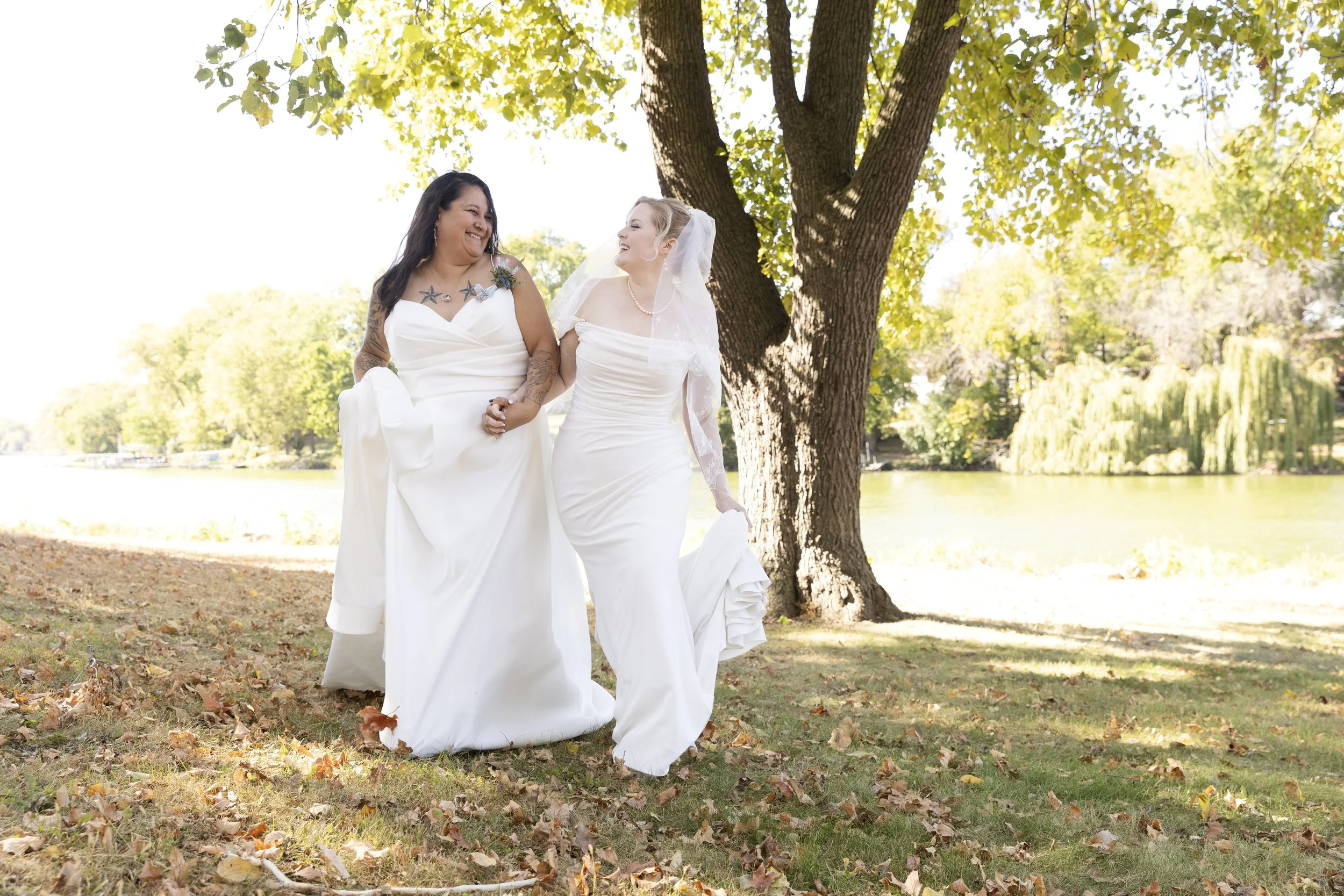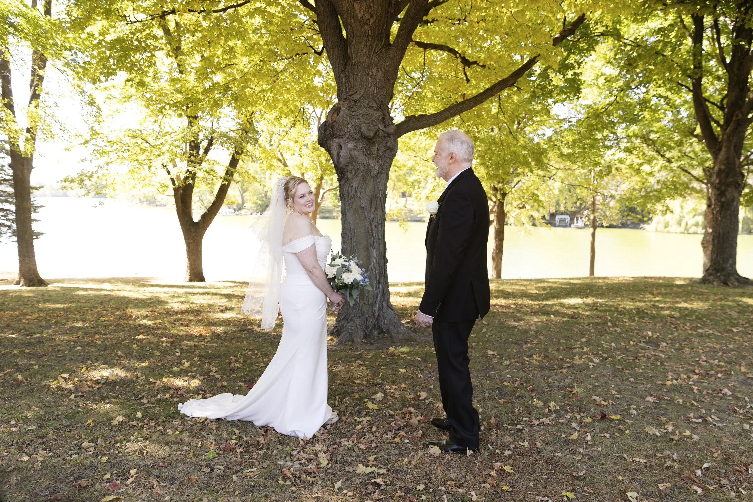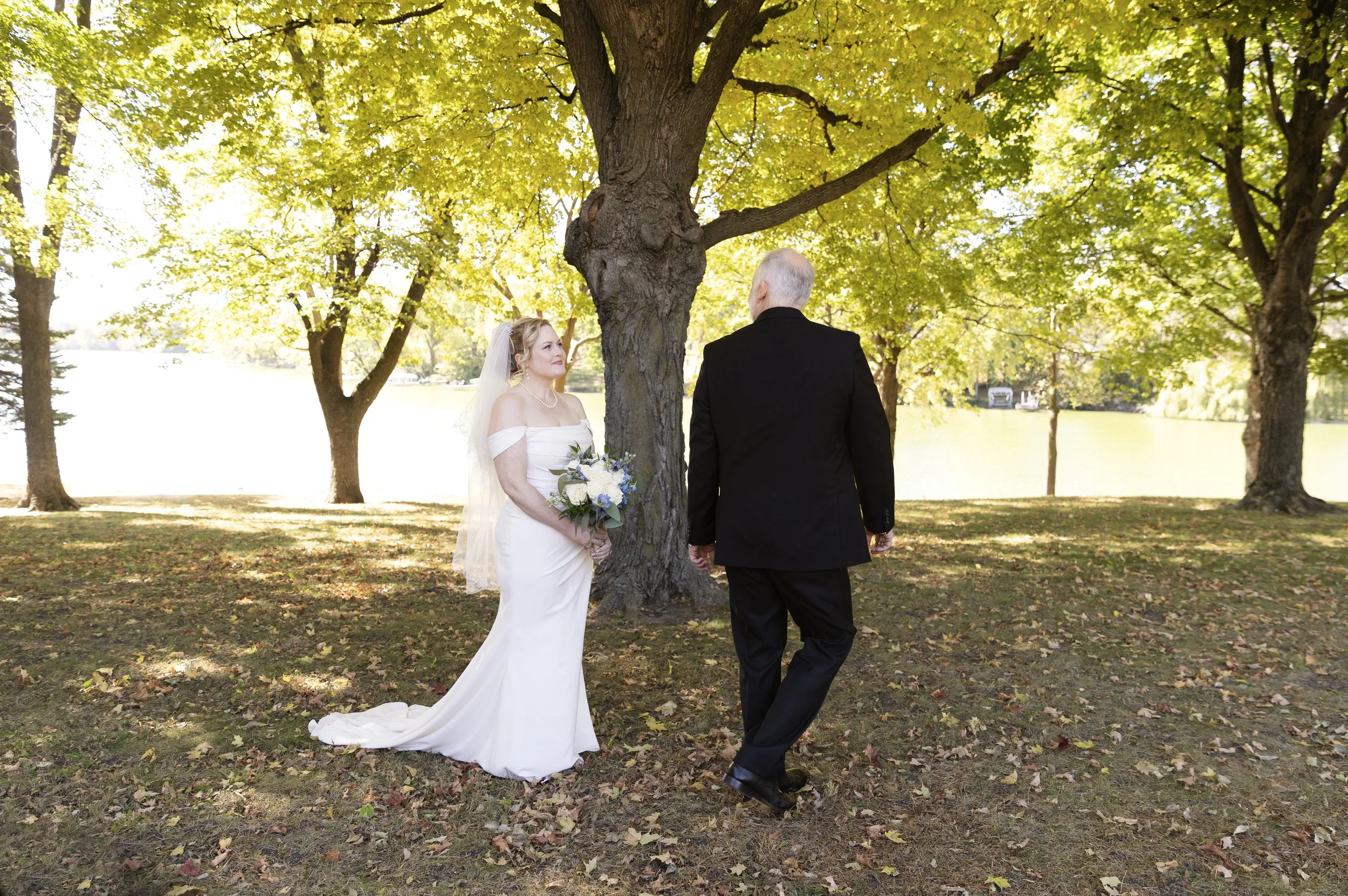 On a beautiful October day, we could not have planned a better location, time and weather for their photoshoot. There is something extra special when everything aligns. Through the golden glow of the sunset through the fall trees, their photographs had an added romantic glow to them. I loved that Jessica waited to show Sam the dress until that day. While they walked through the trails of the Minnesota park, I’d say all the prep was worth while.