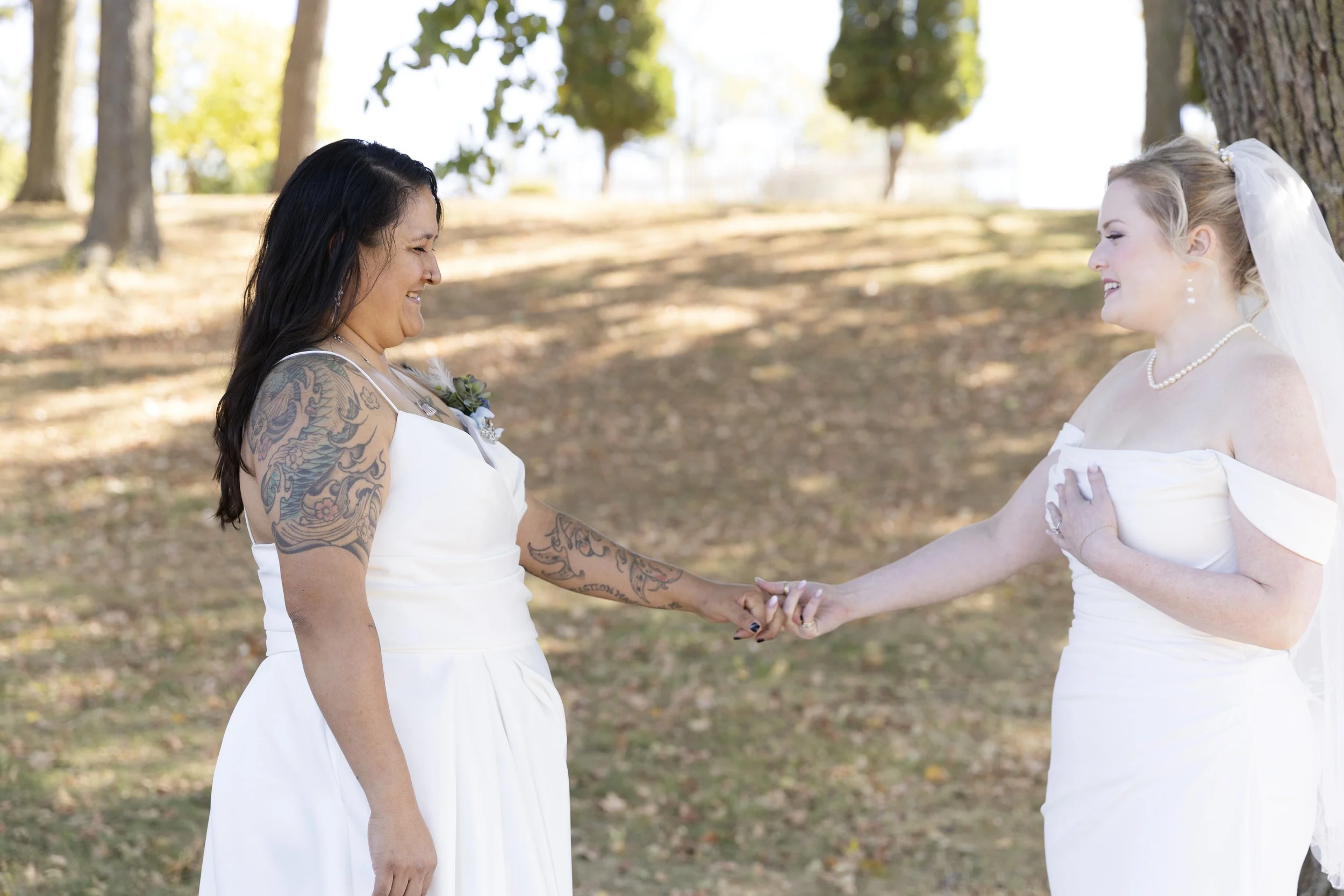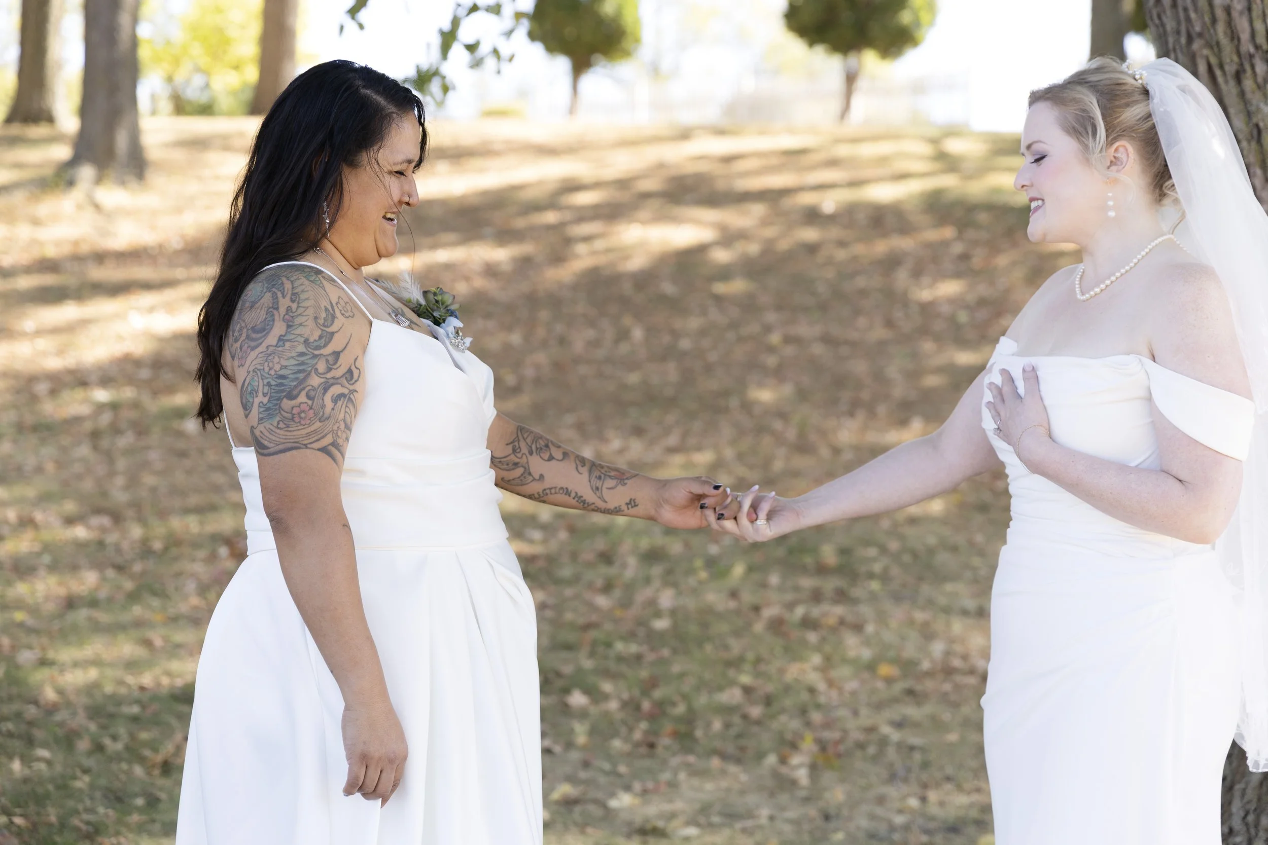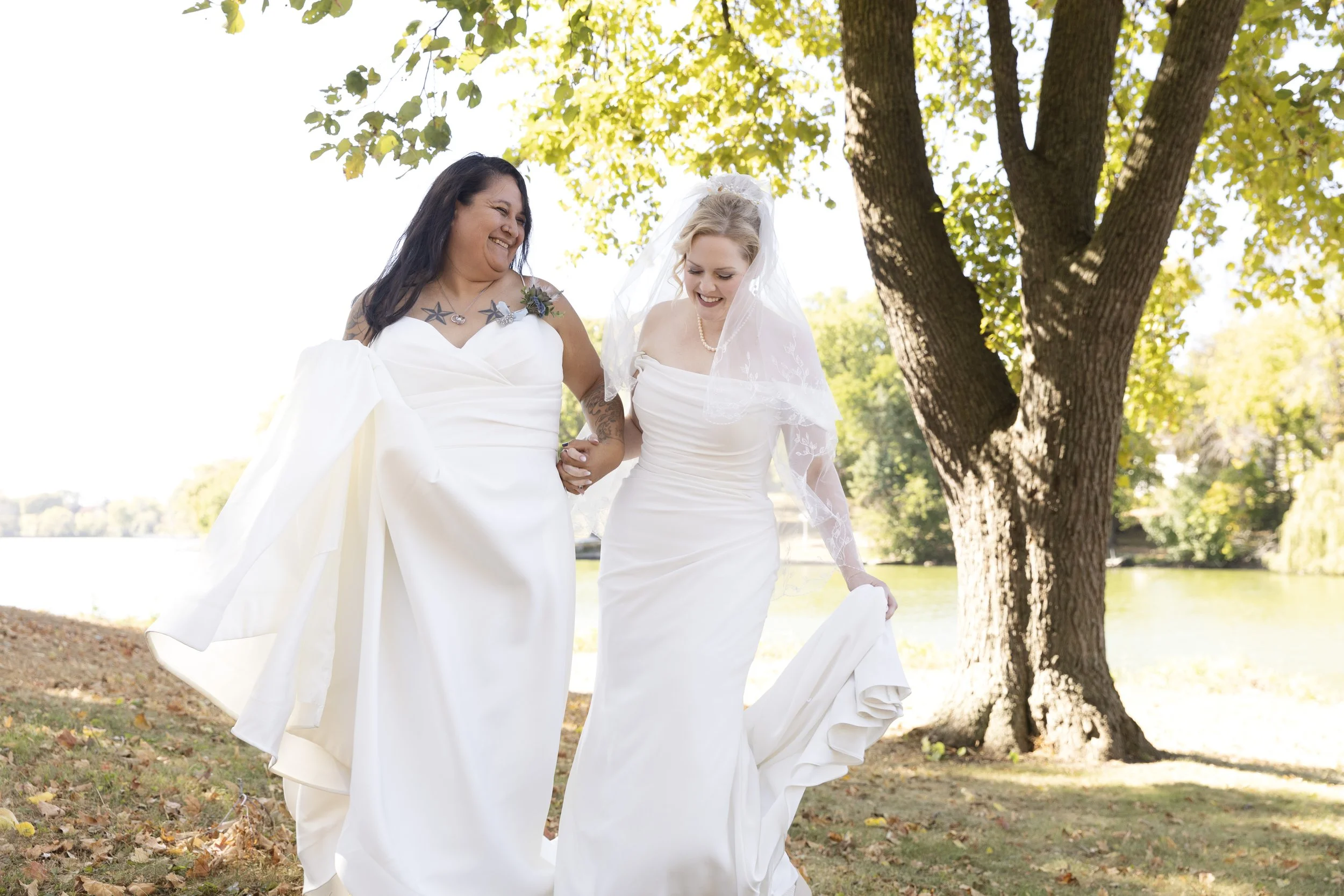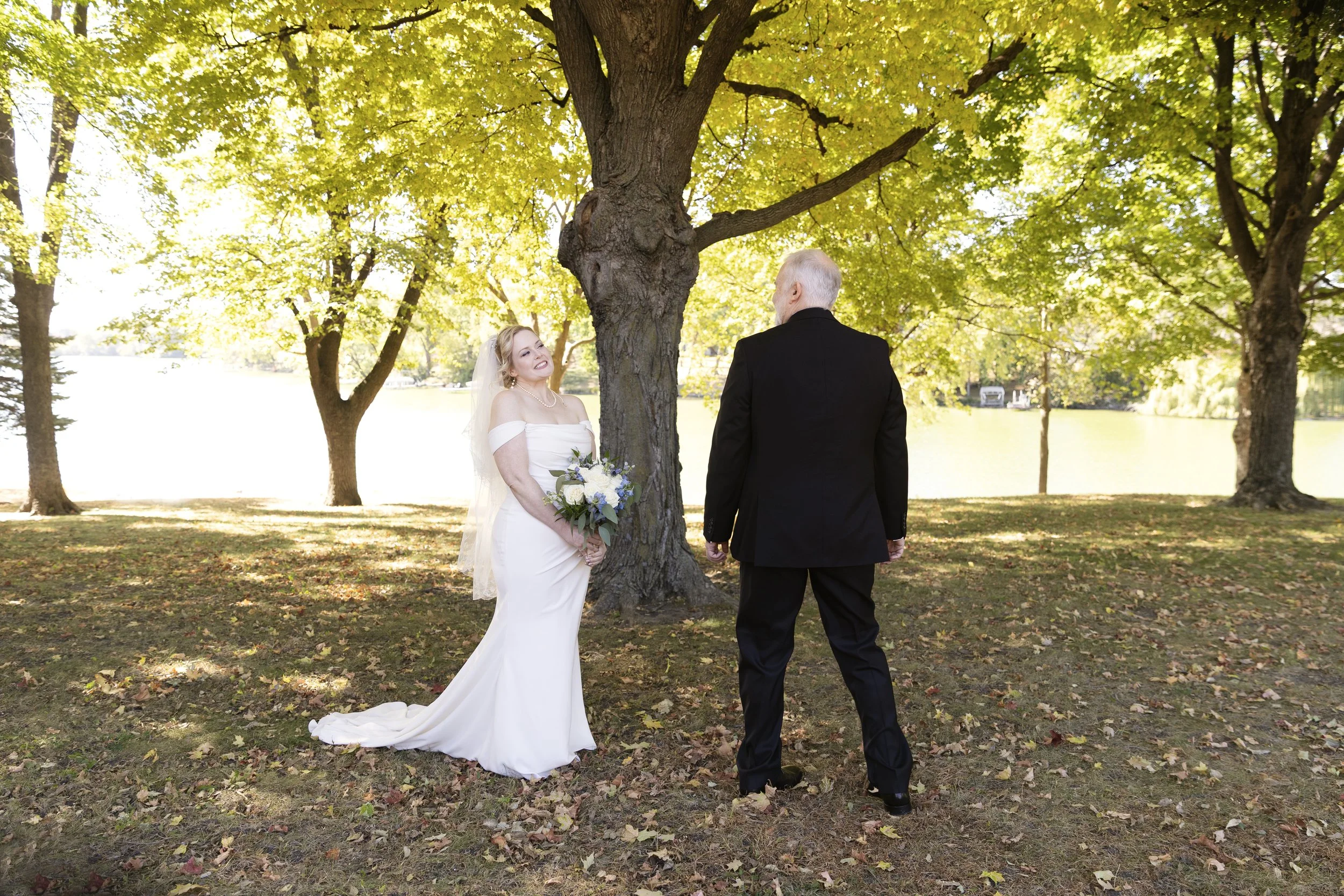 On a beautiful October day, we could not have planned a better location, time and weather for their photoshoot. There is something extra special when everything aligns. Through the golden glow of the sunset through the fall trees, their photographs had an added romantic glow to them. I loved that Jessica waited to show Sam the dress until that day. While they walked through the trails of the Minnesota park, I’d say all the prep was worth while.