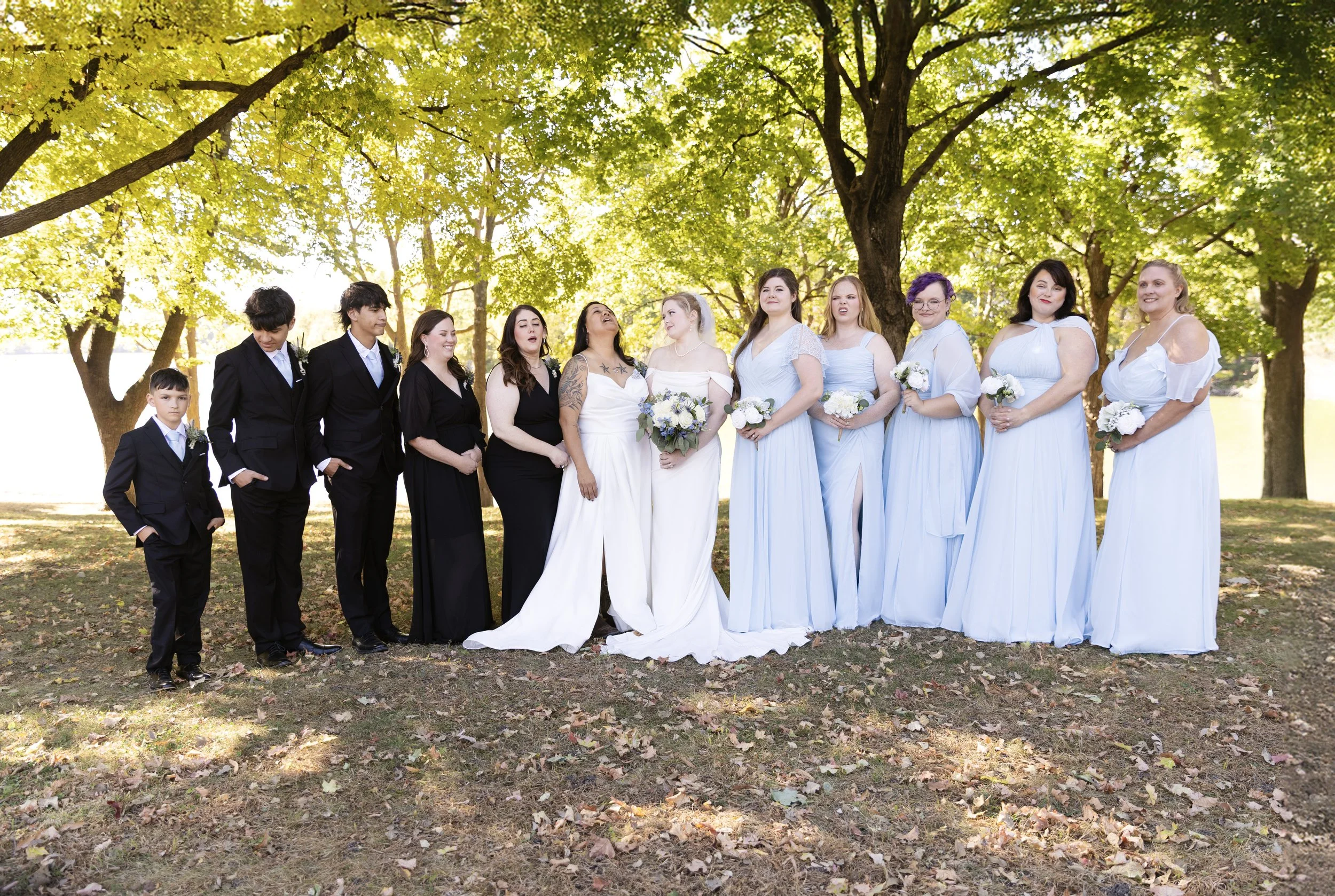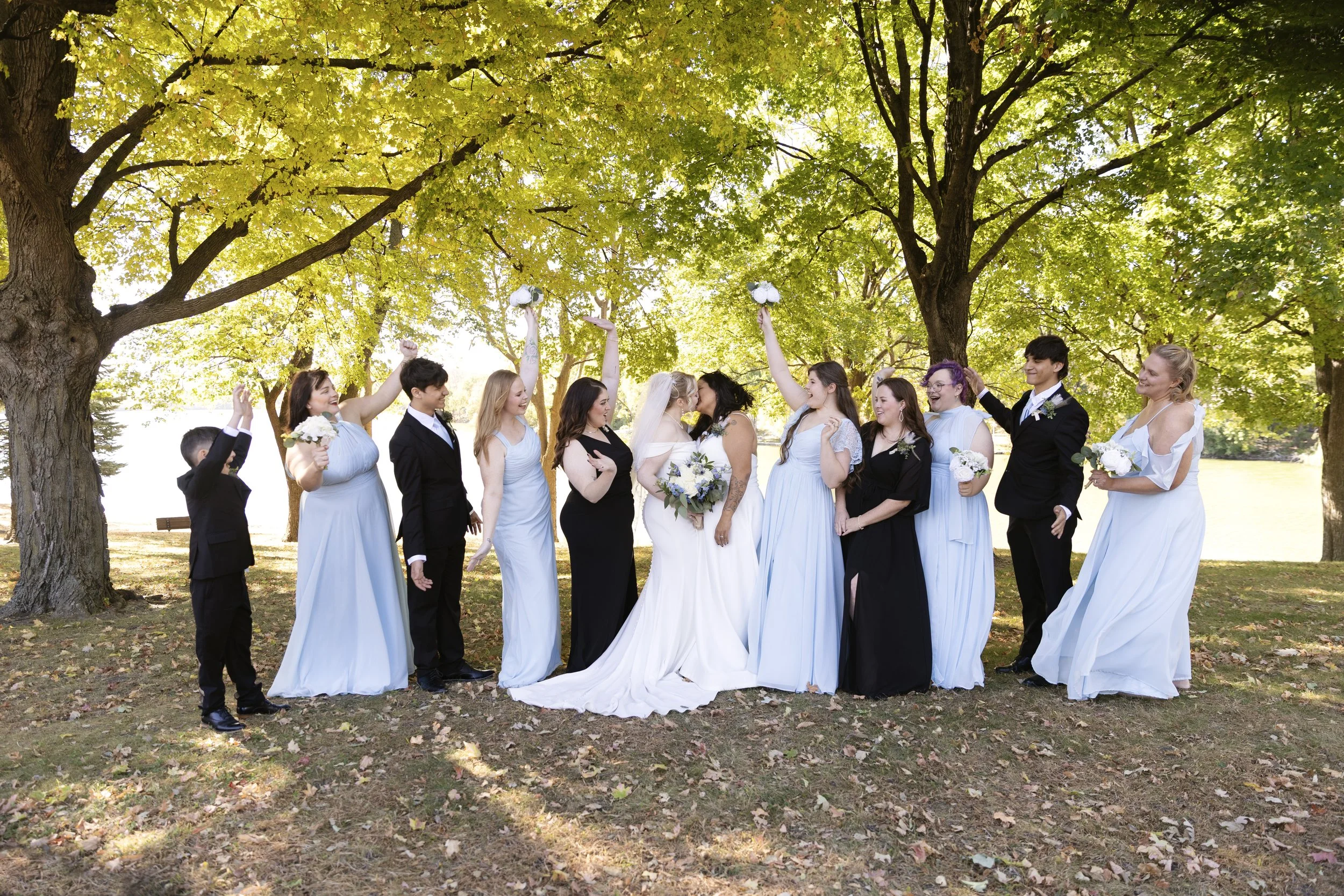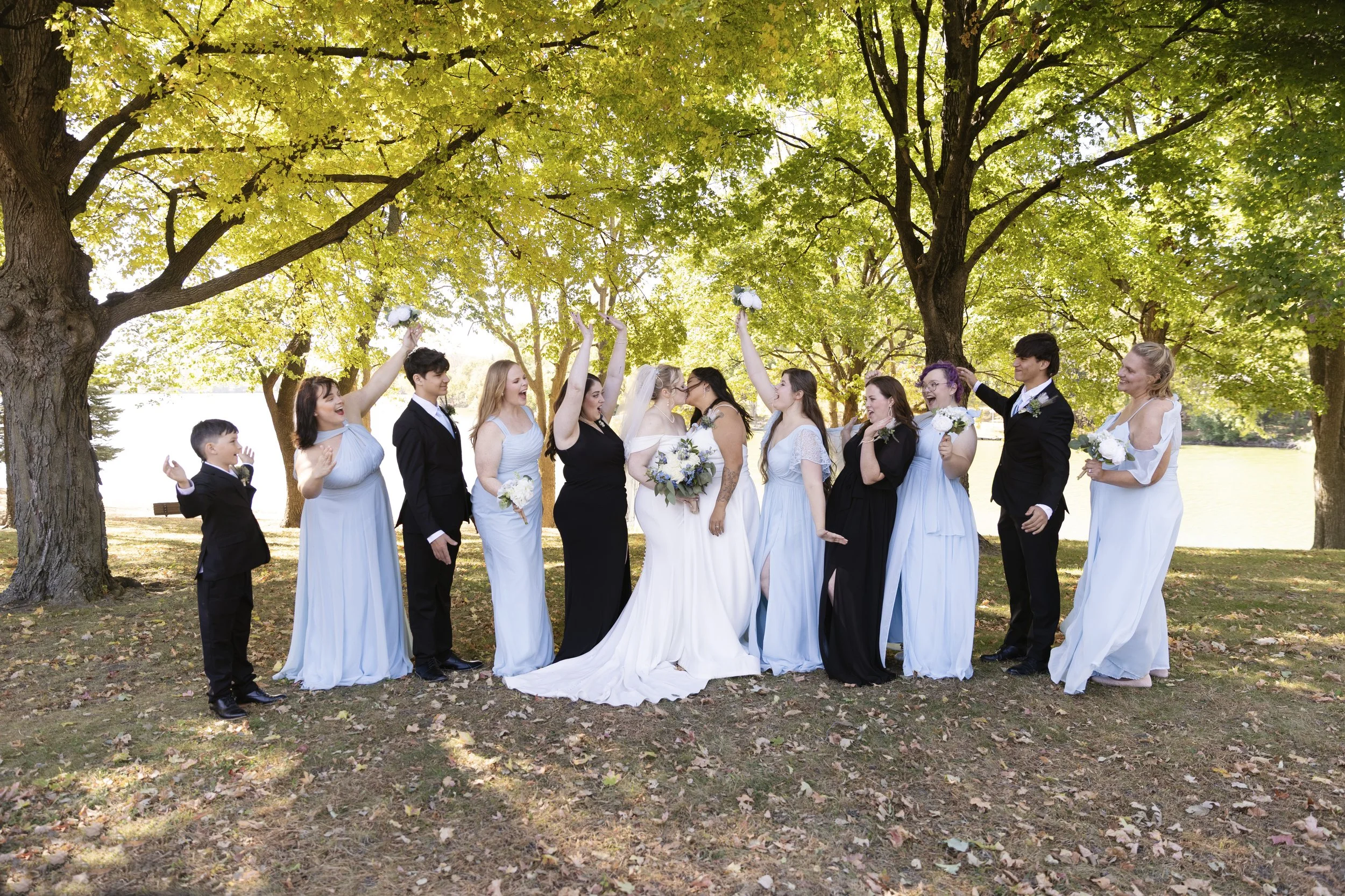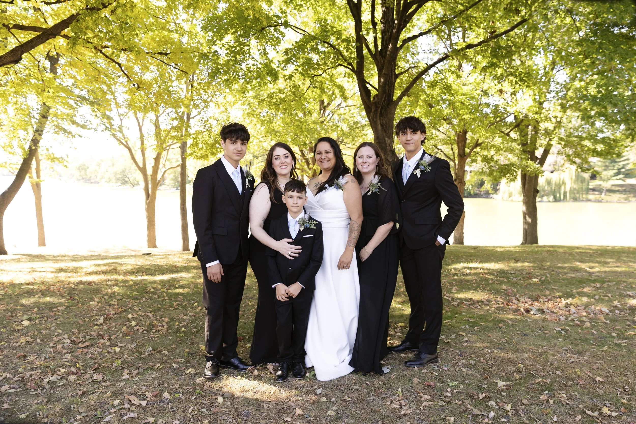 The Texas couple decided to have a beautiful lakeside wedding in Minnesota so their Midwest family could come. The couple included all of their family in the wedding, and close friends to have fun with. We easily came up with fun ideas for posing. Sometimes, large wedding parties have a tough time with posing. Every single person easily got understood how to pose with little coaching.