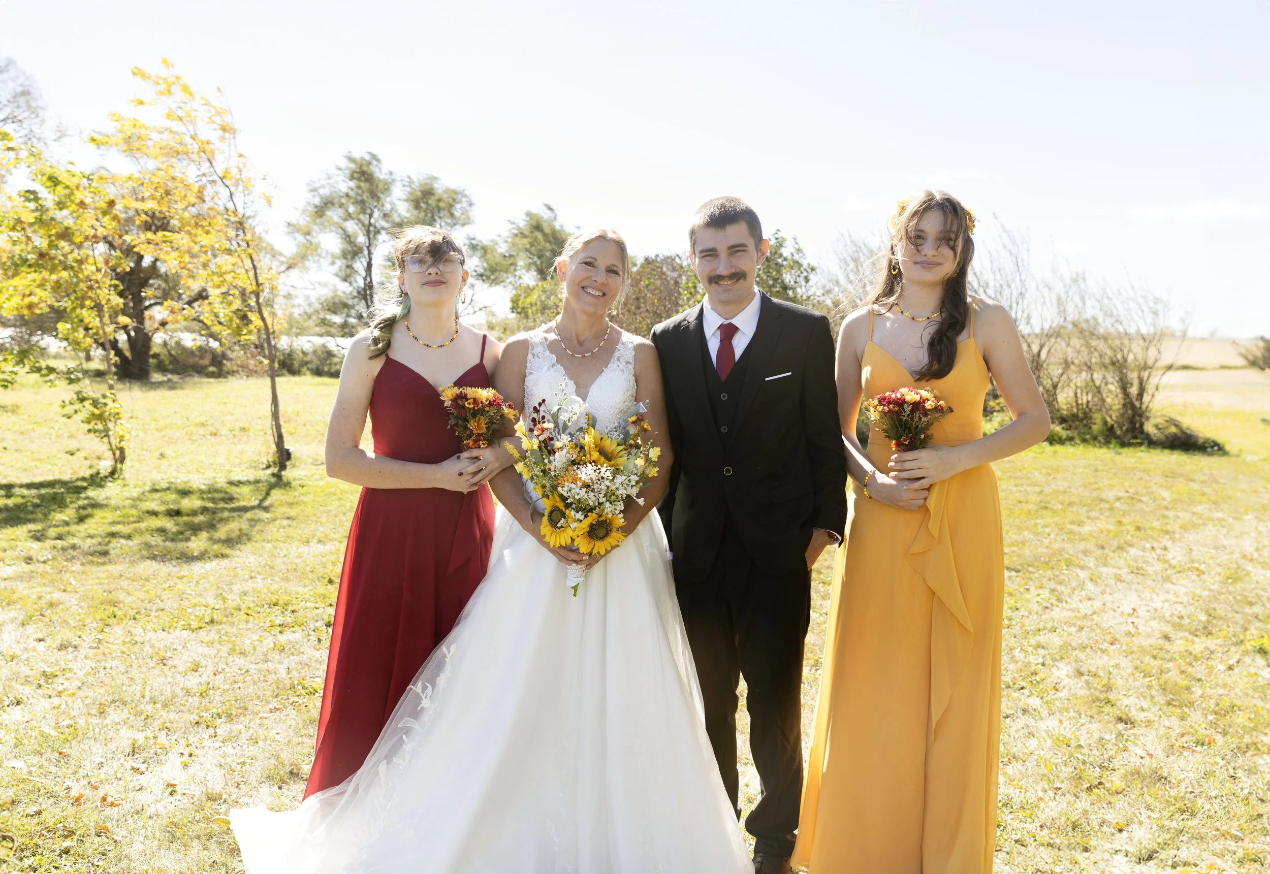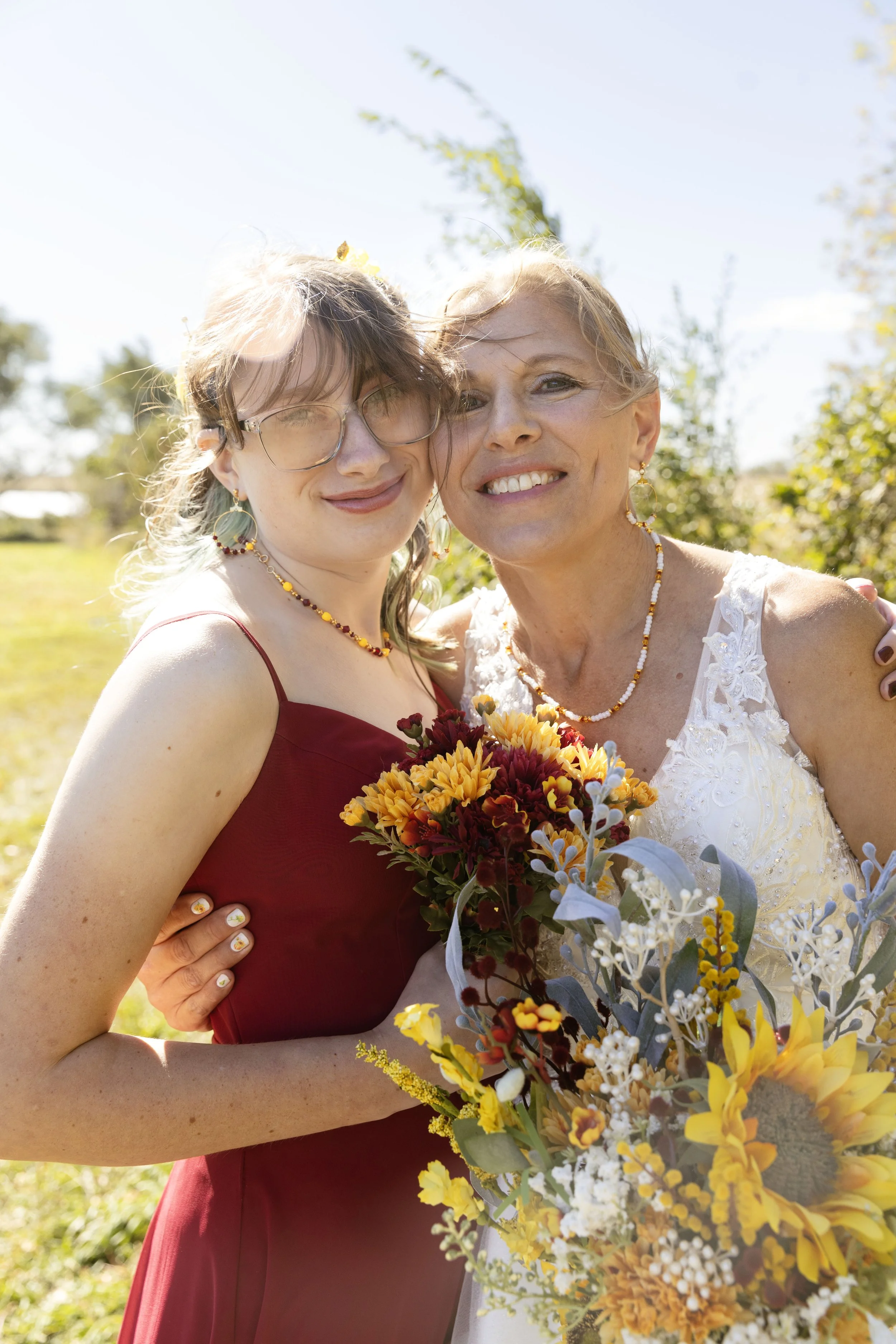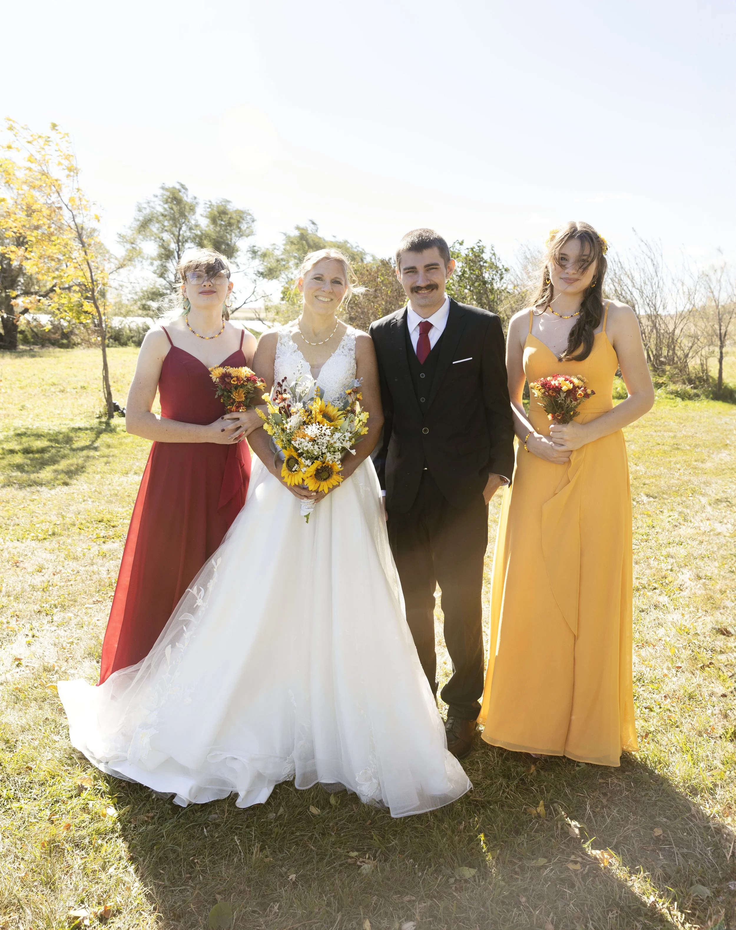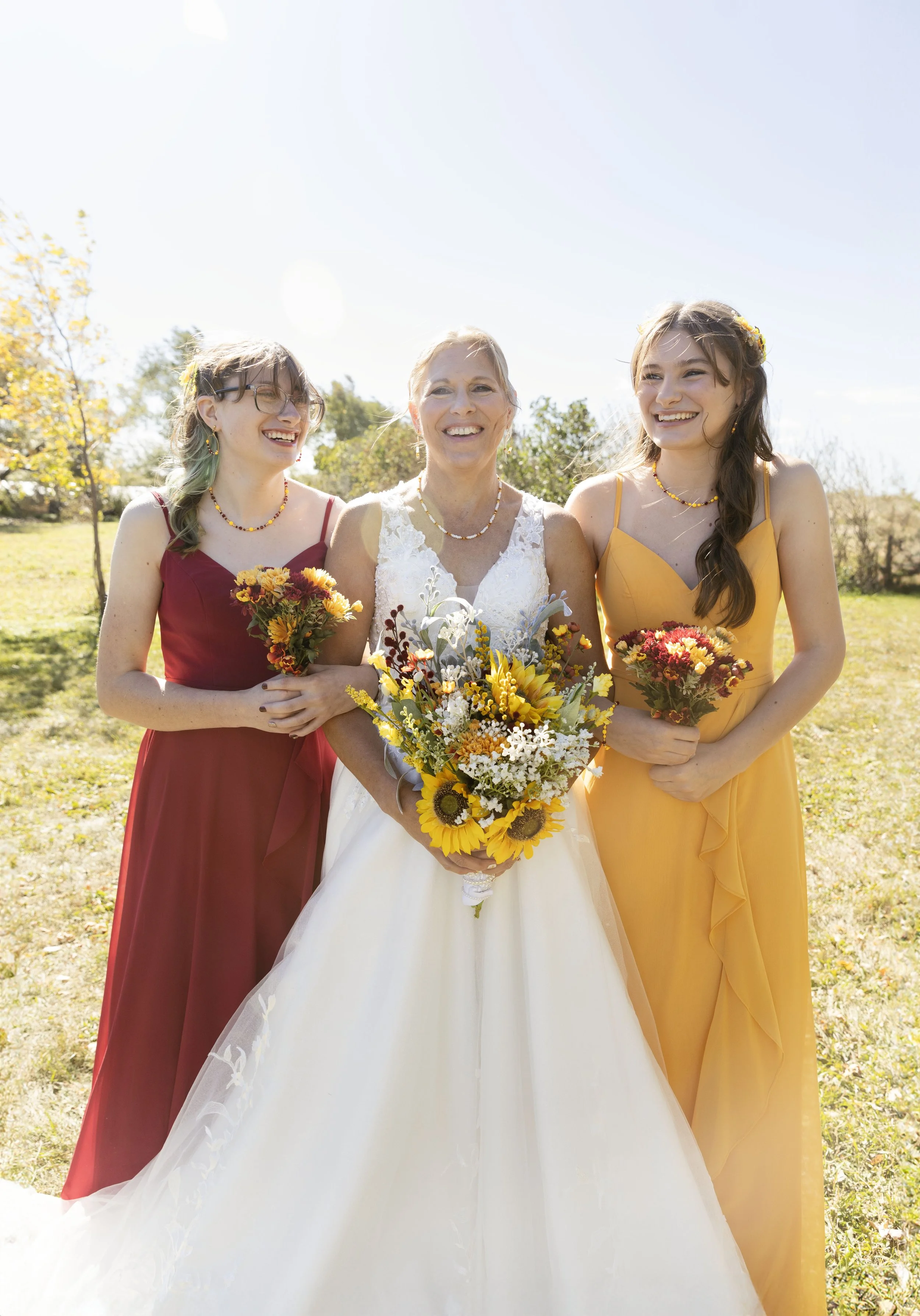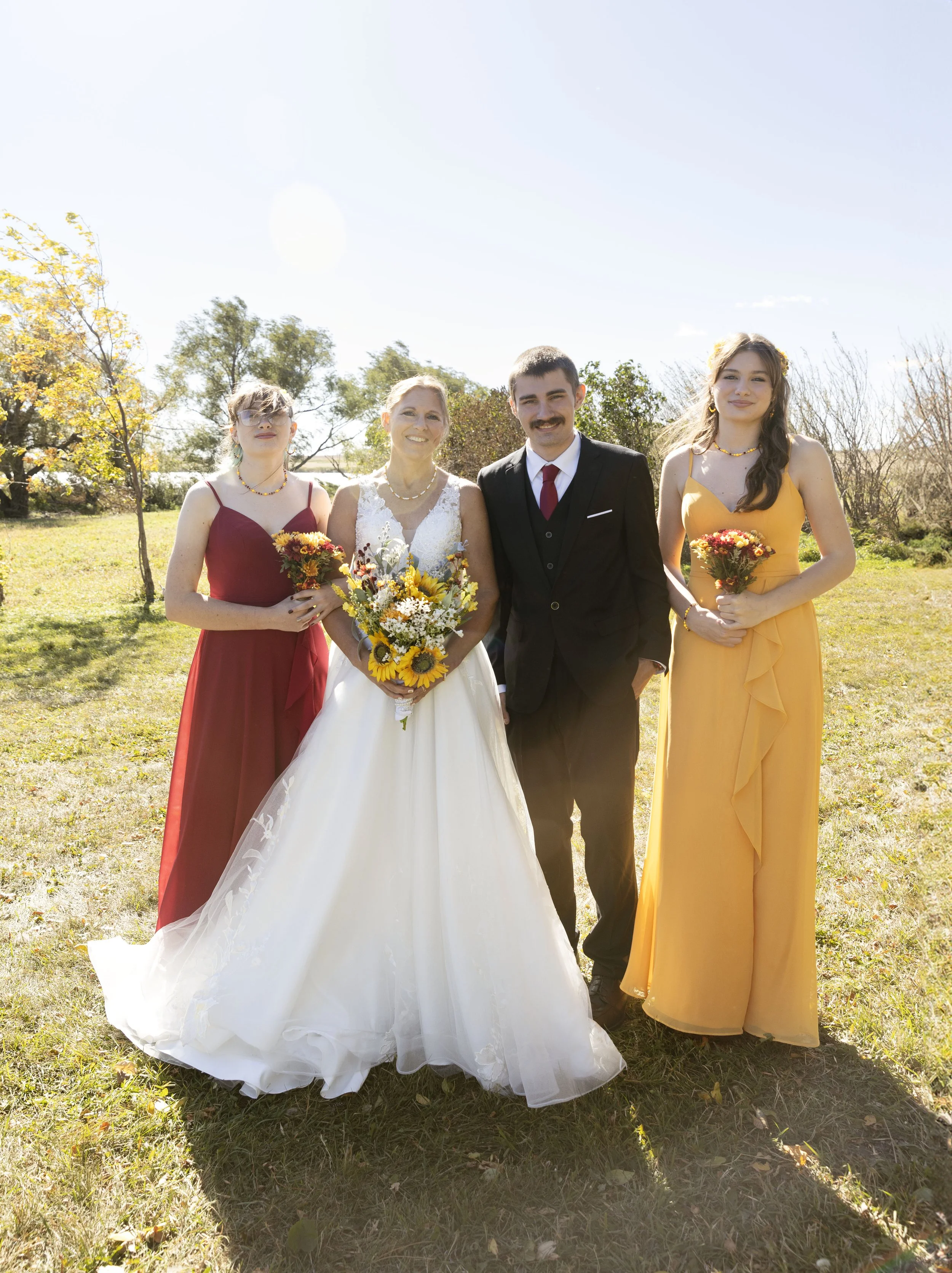 On a windy, sunny October day in 2024, Christine and Walt got married on their own land surrounded by a few friends, and family. It was fitting that sunflowers were part of the decor on such a sunny day. The wind added a sort of editorial feel to their portraits.