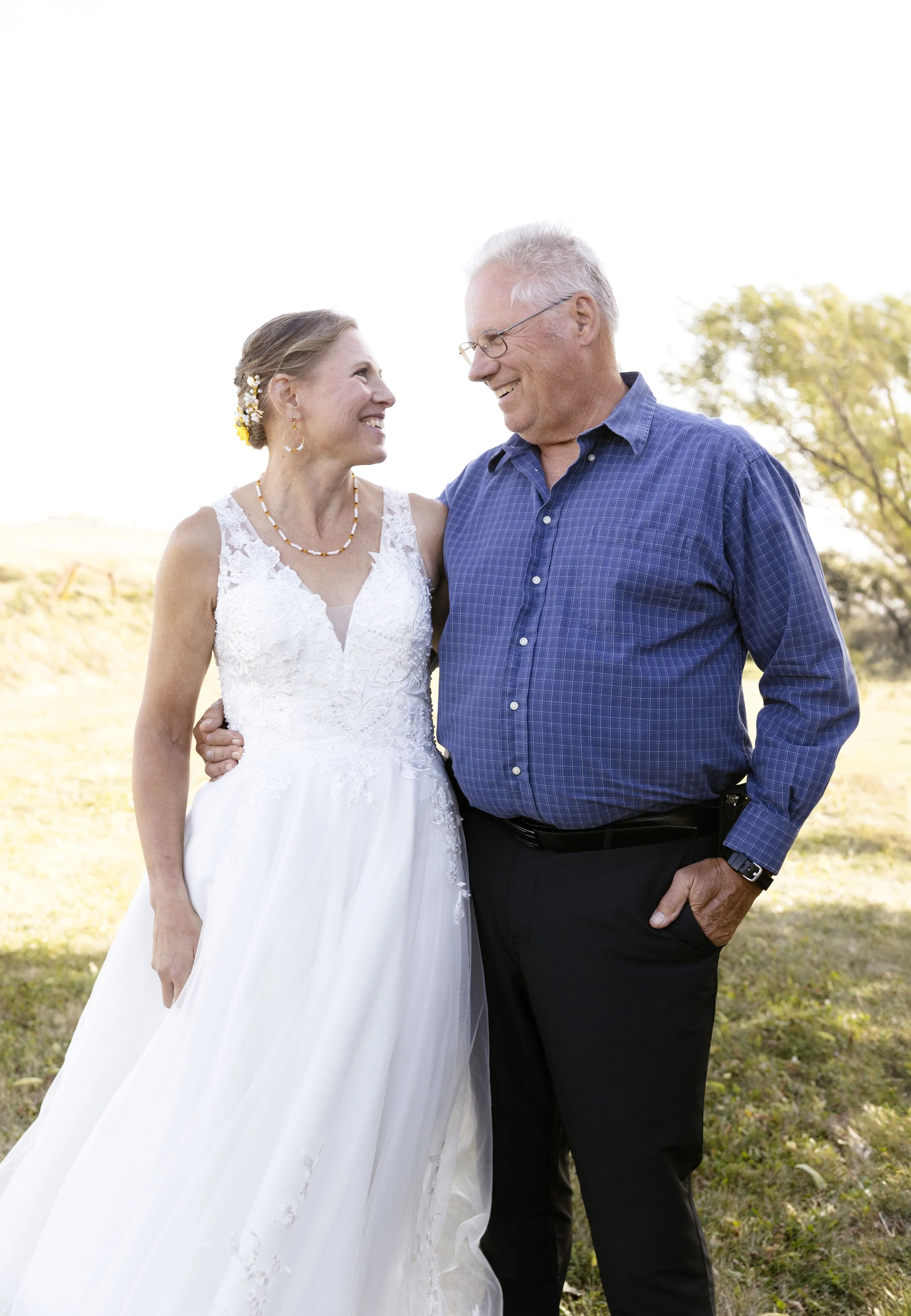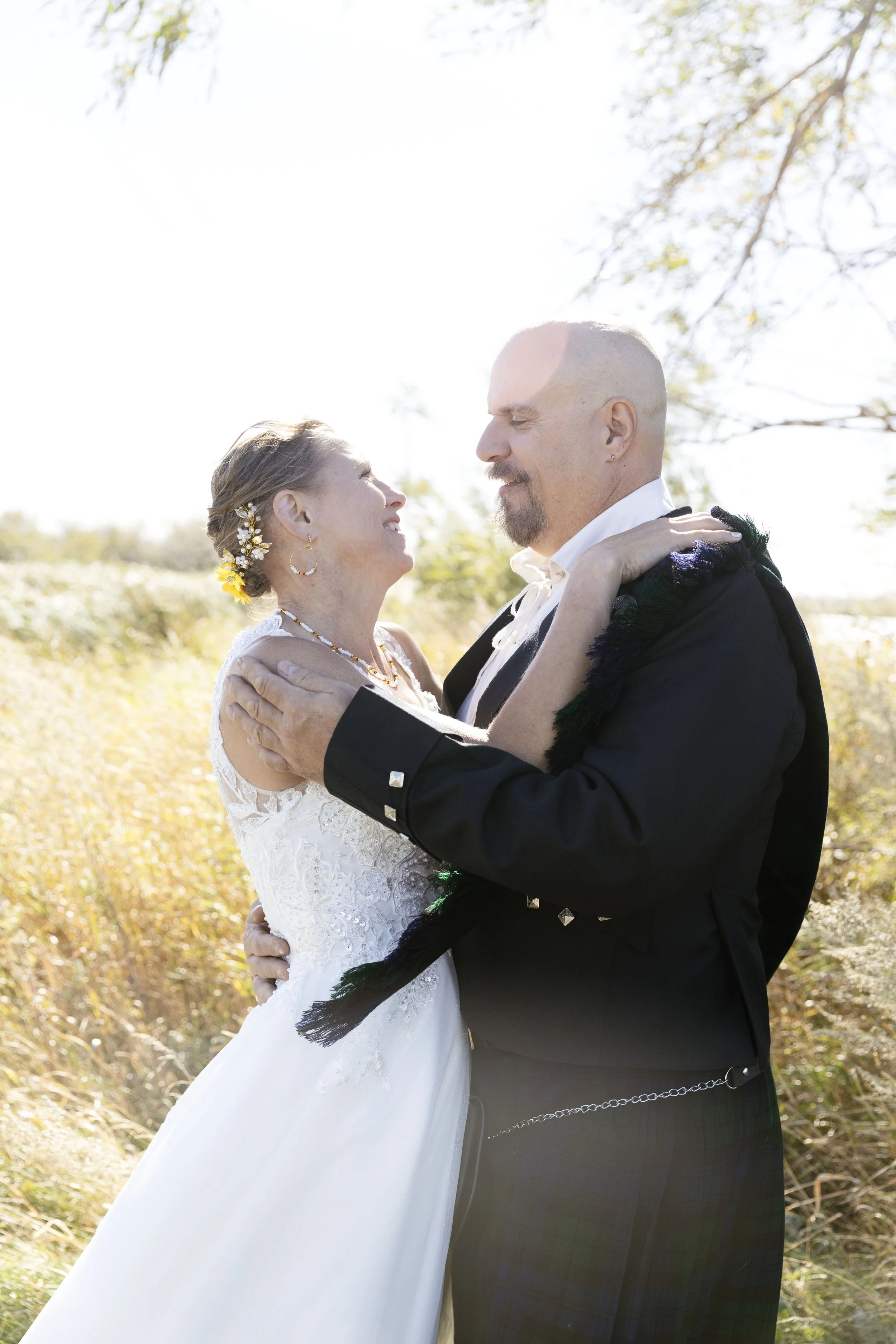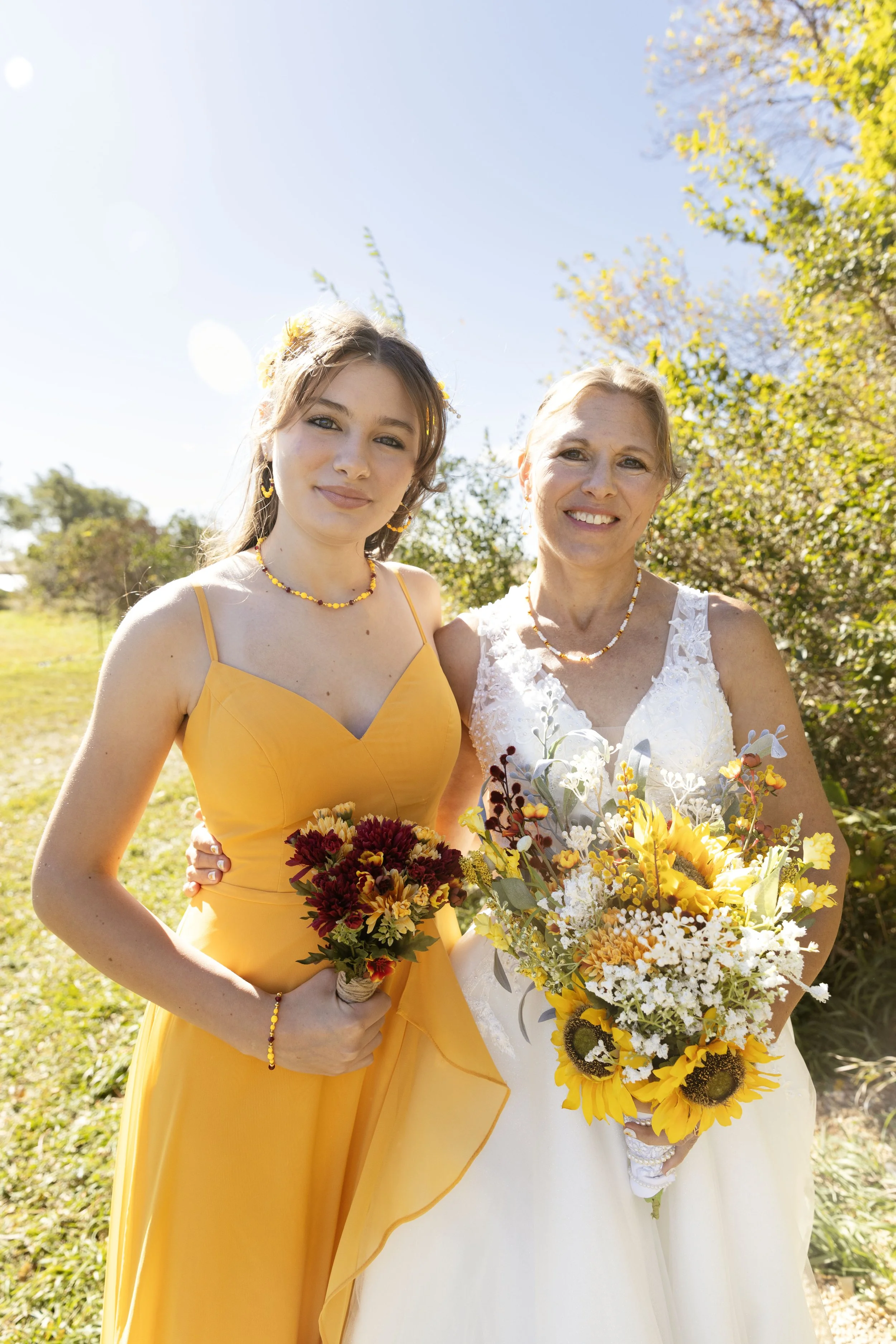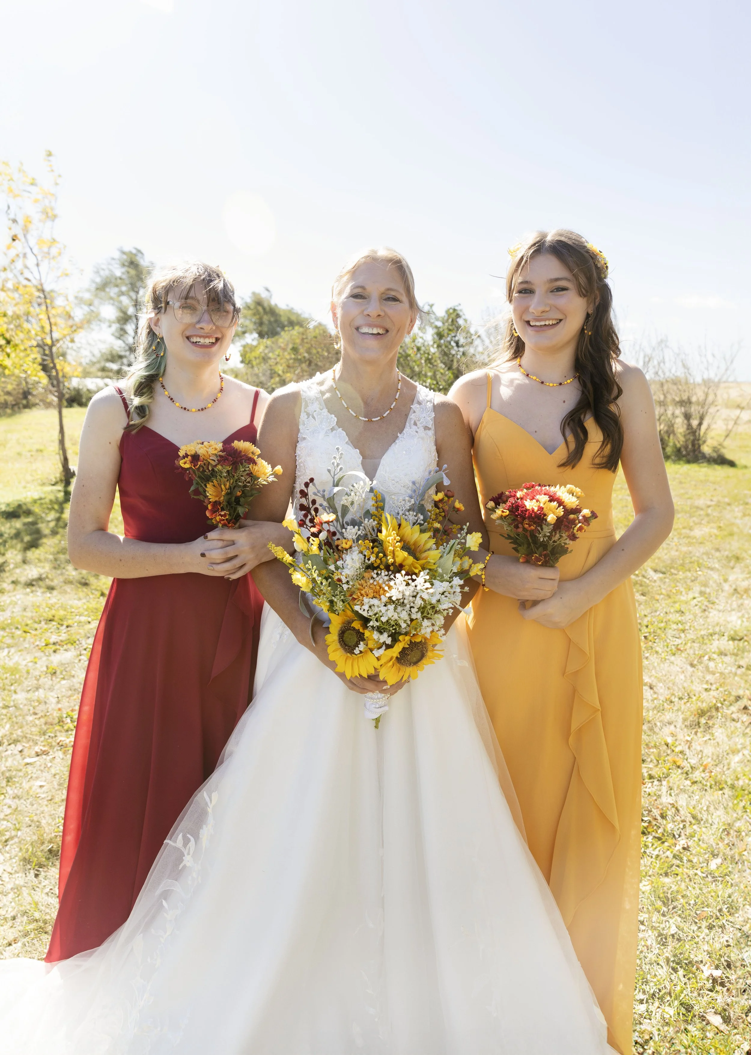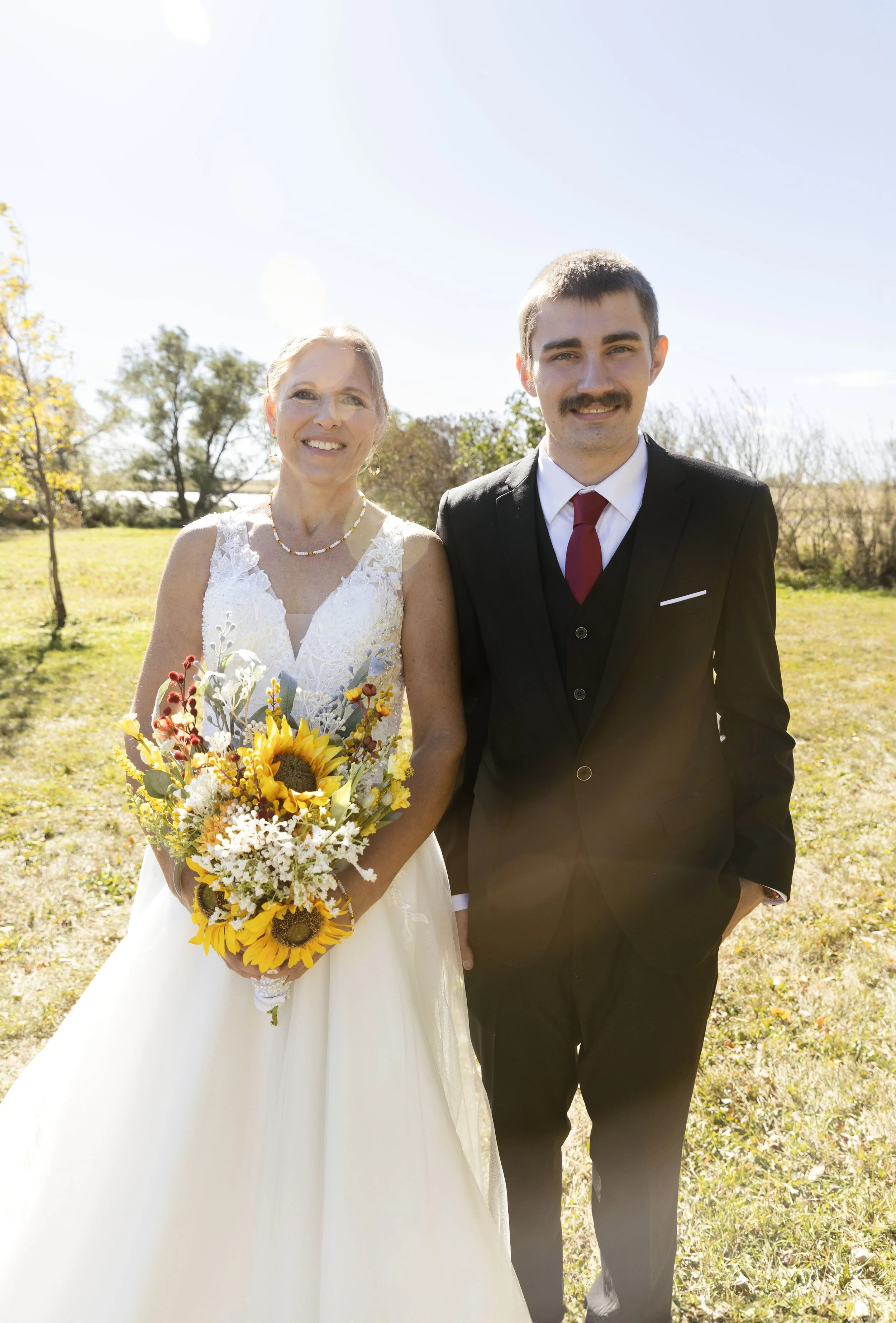 On a windy, sunny October day in 2024, Christine and Walt got married on their own land surrounded by a few friends, and family. It was fitting that sunflowers were part of the decor on such a sunny day. The wind added a sort of editorial feel to their portraits.