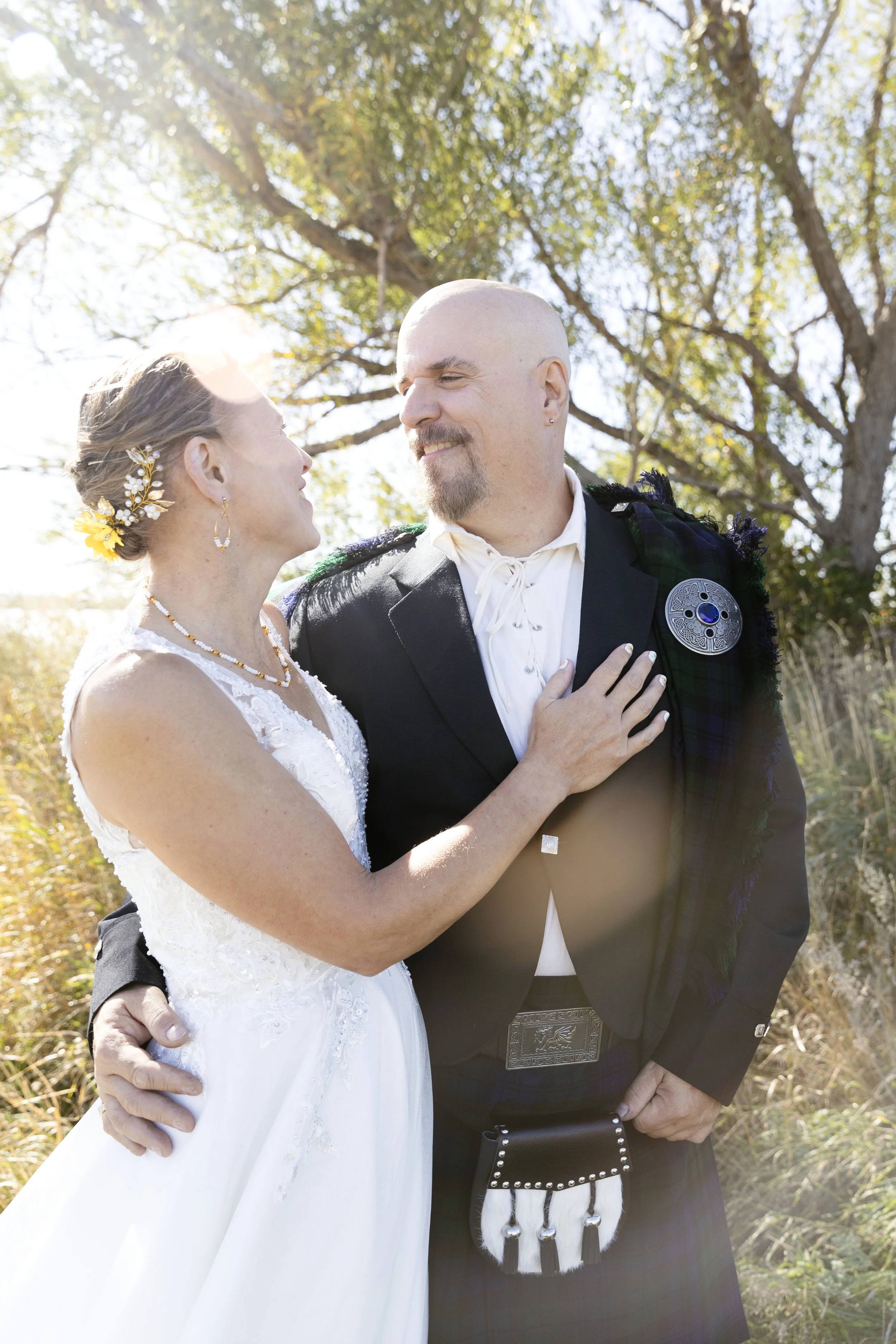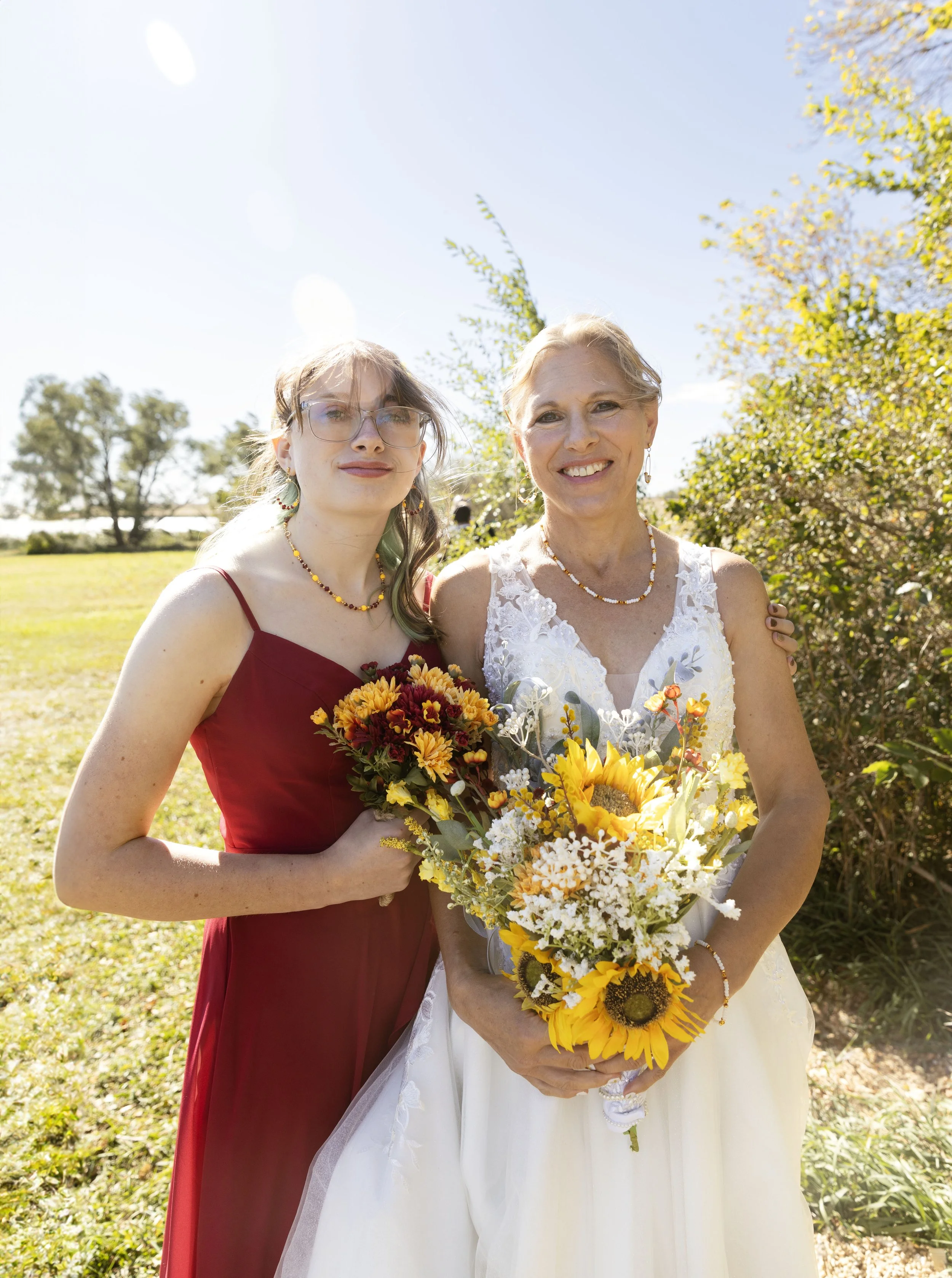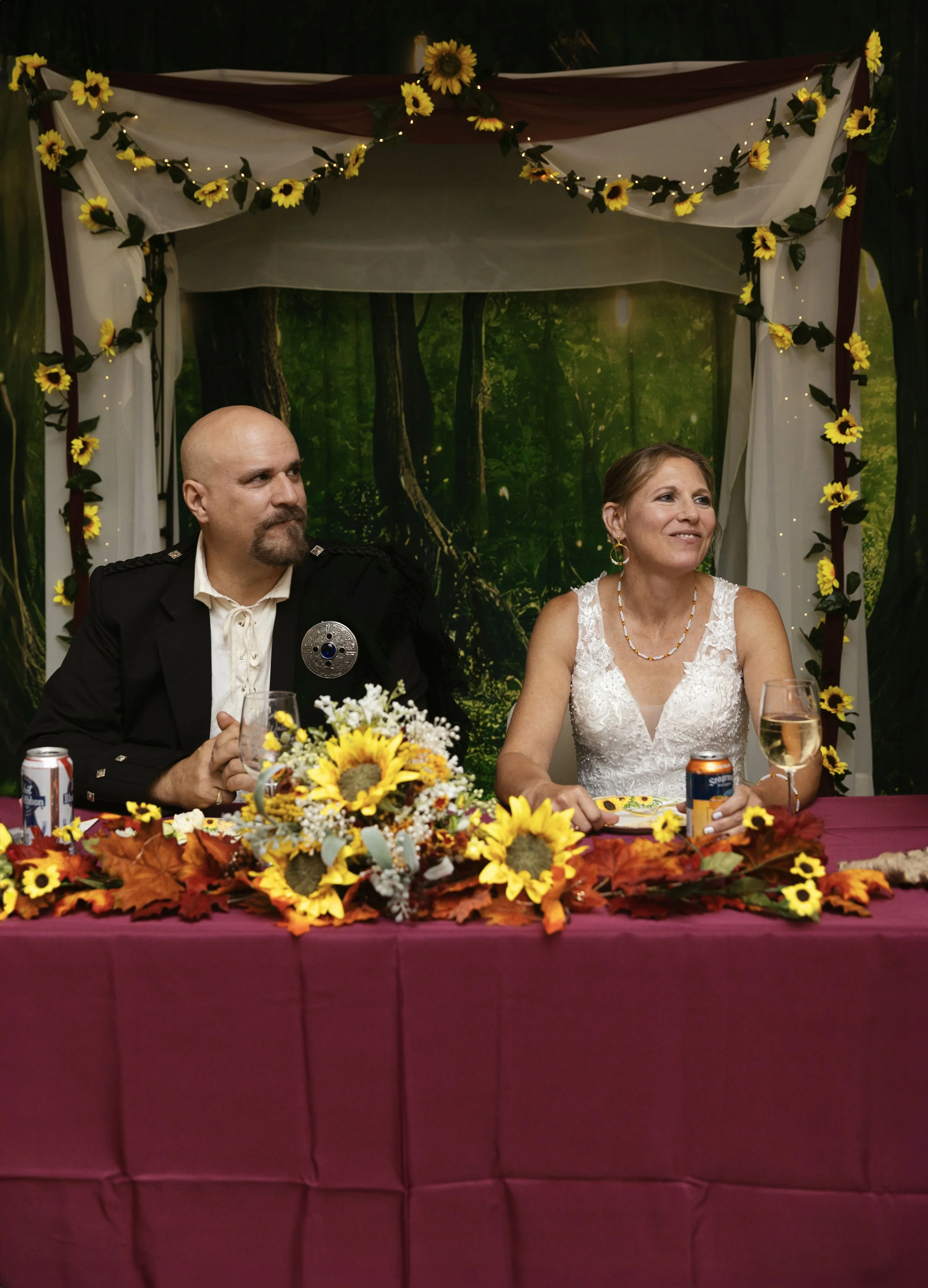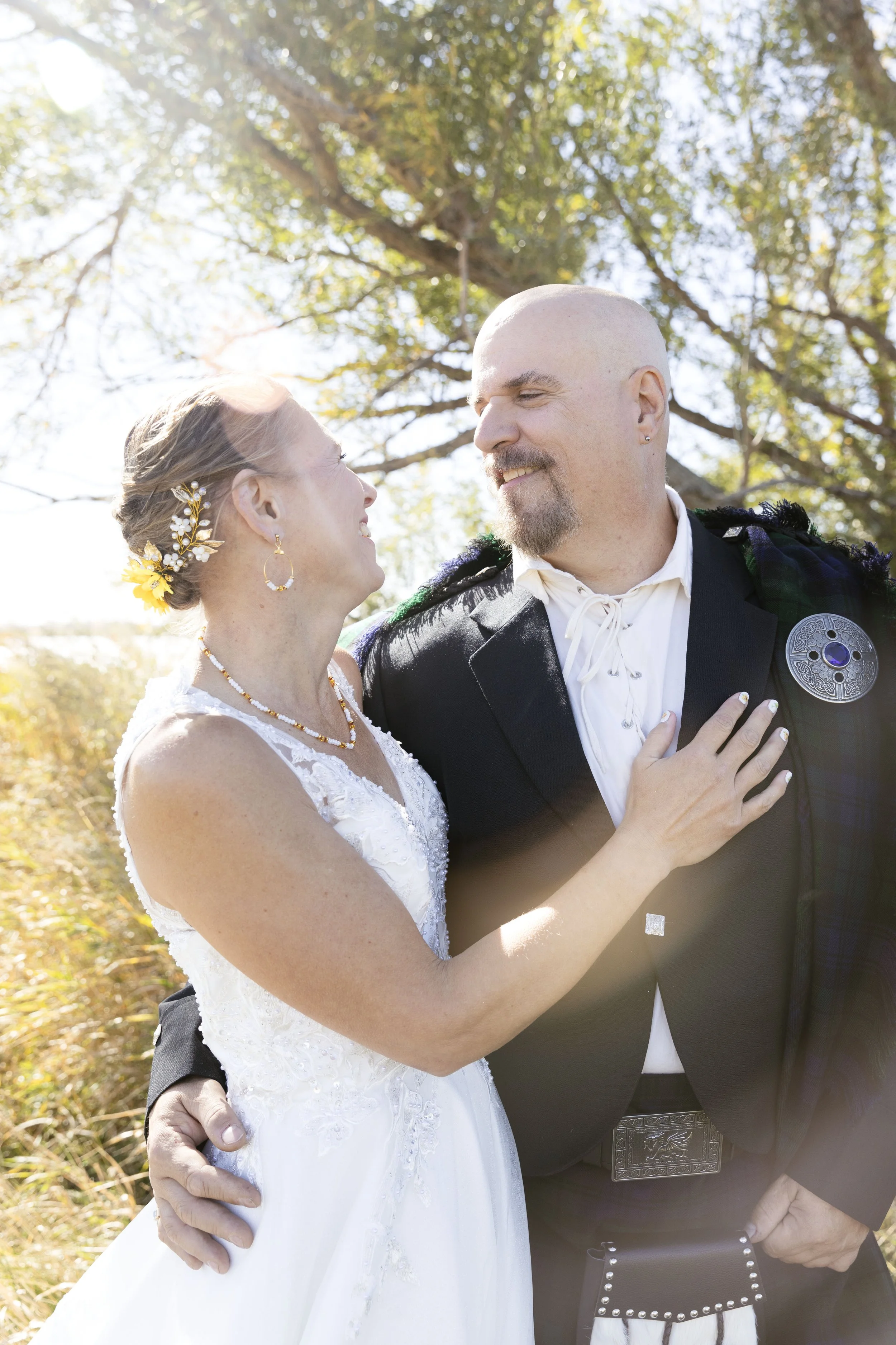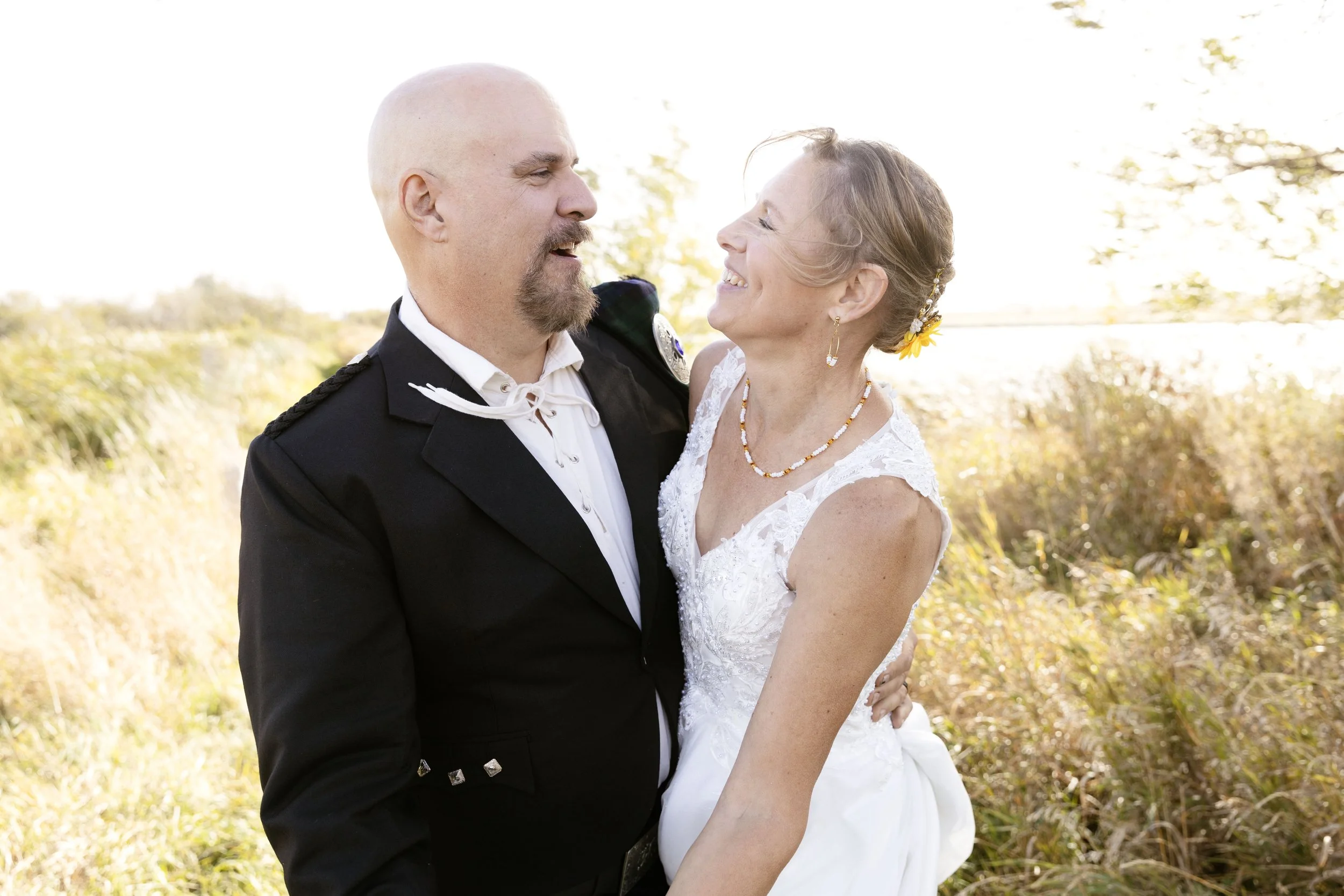 On a windy, sunny October day in 2024, Christine and Walt got married on their own land surrounded by a few friends, and family. It was fitting that sunflowers were part of the decor on such a sunny day. The wind added a sort of editorial feel to their portraits.