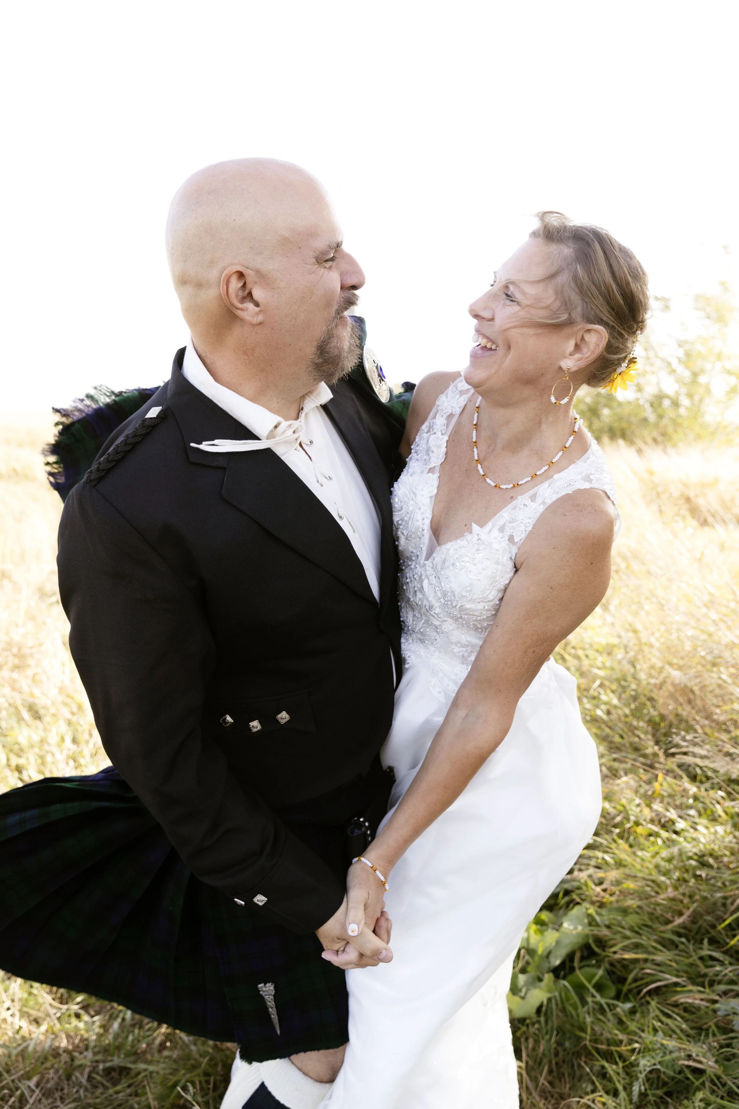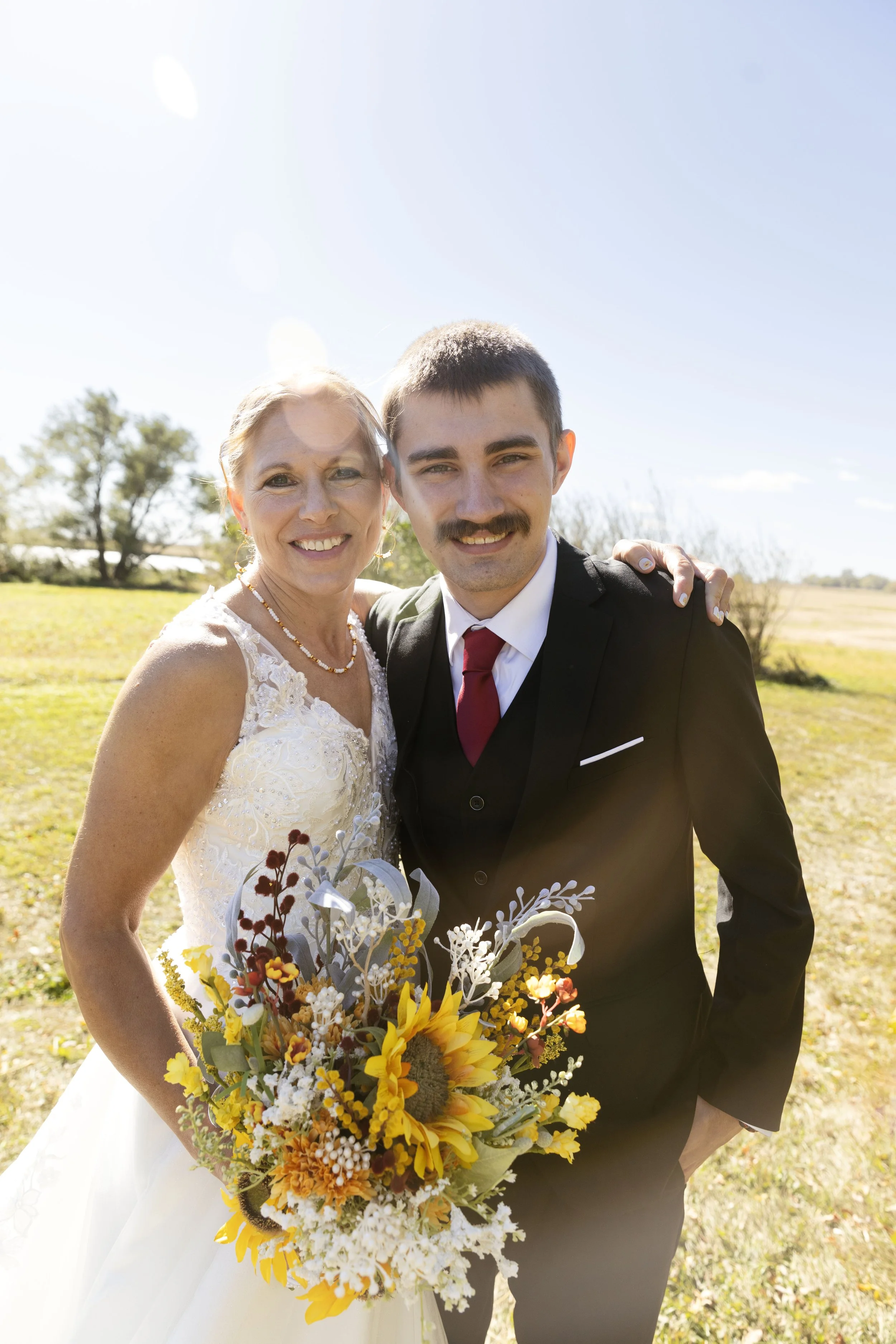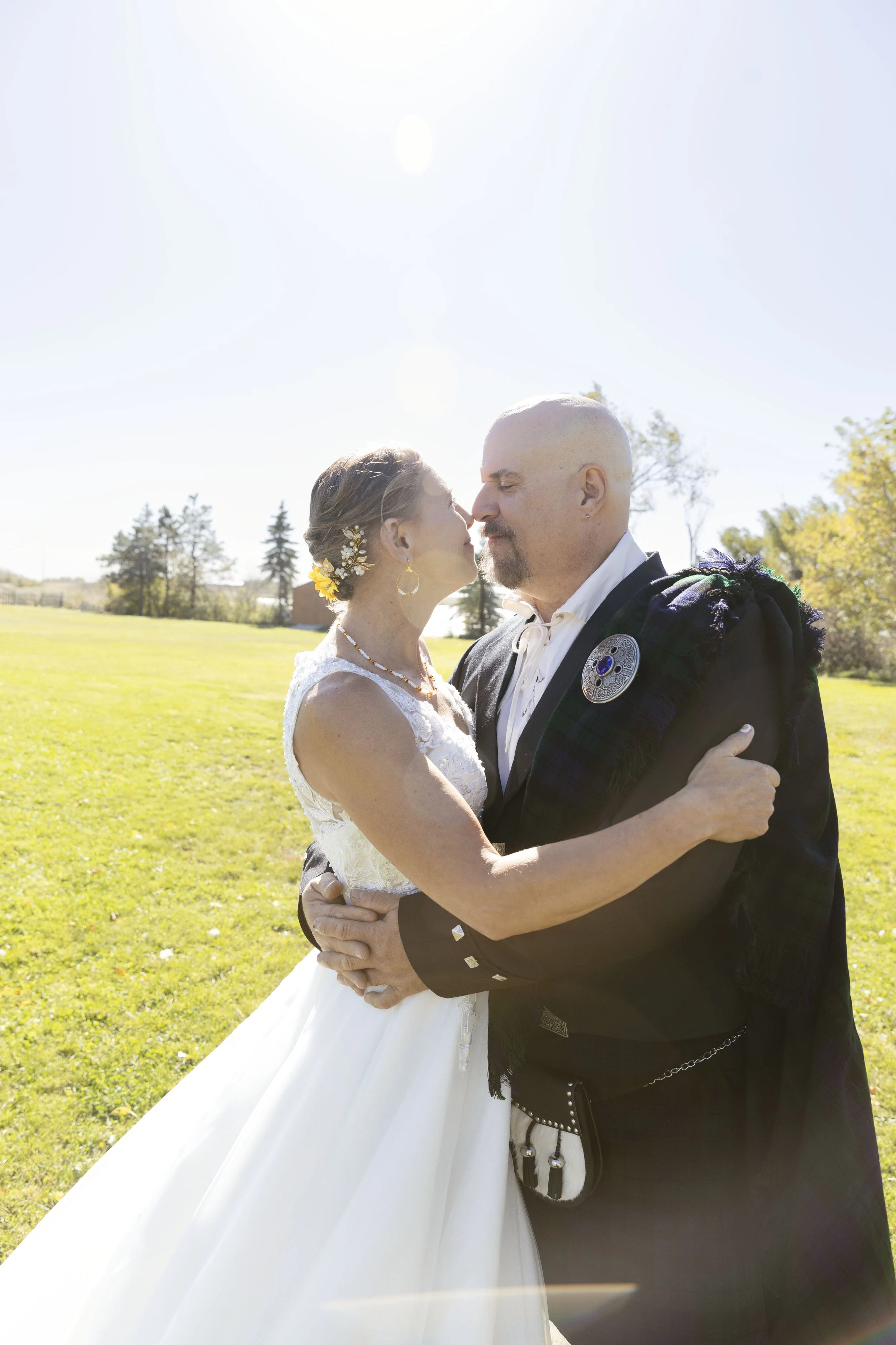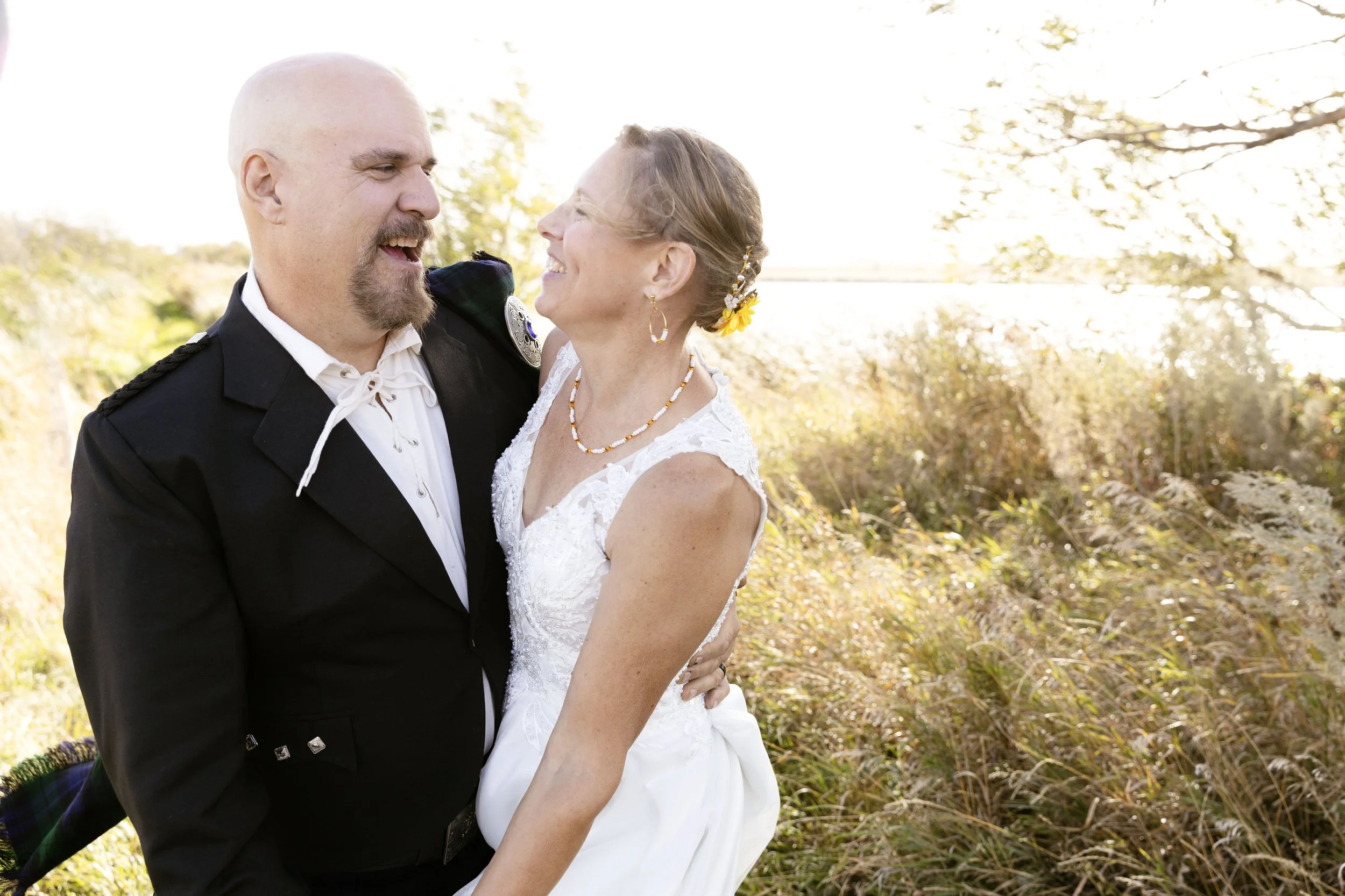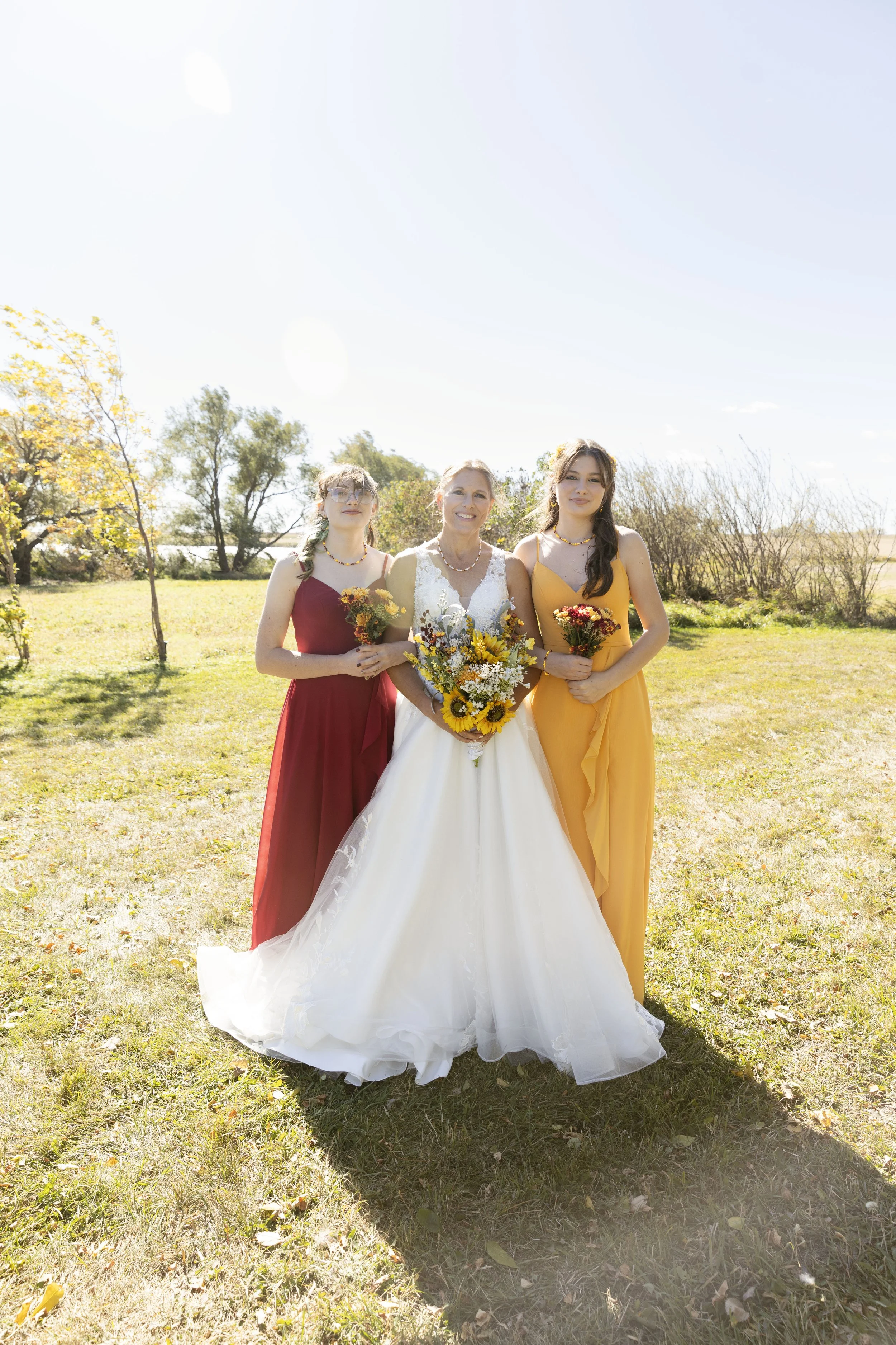 On a windy, sunny October day in 2024, Christine and Walt got married on their own land surrounded by a few friends, and family. It was fitting that sunflowers were part of the decor on such a sunny day. The wind added a sort of editorial feel to their portraits.