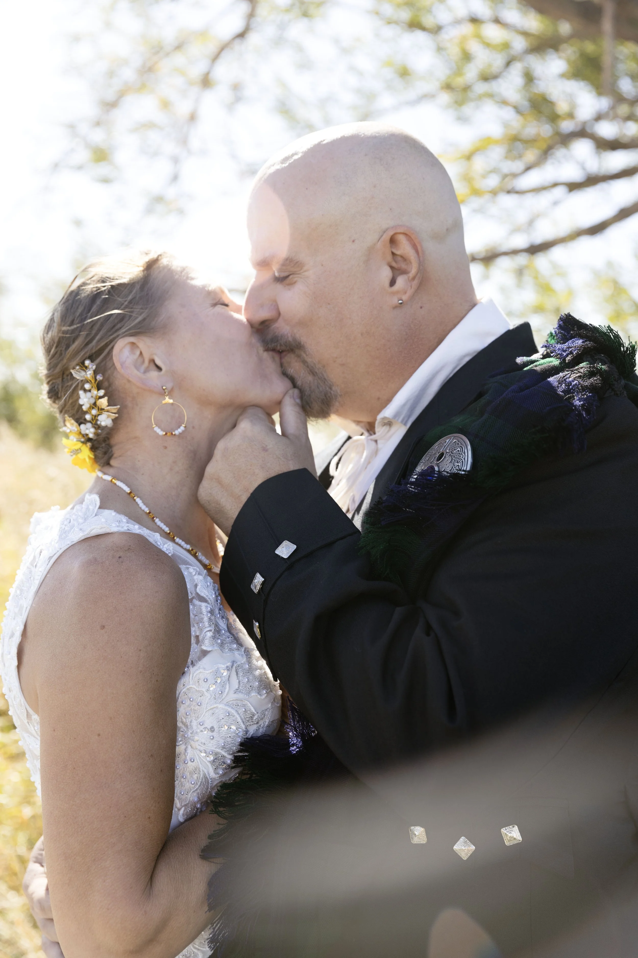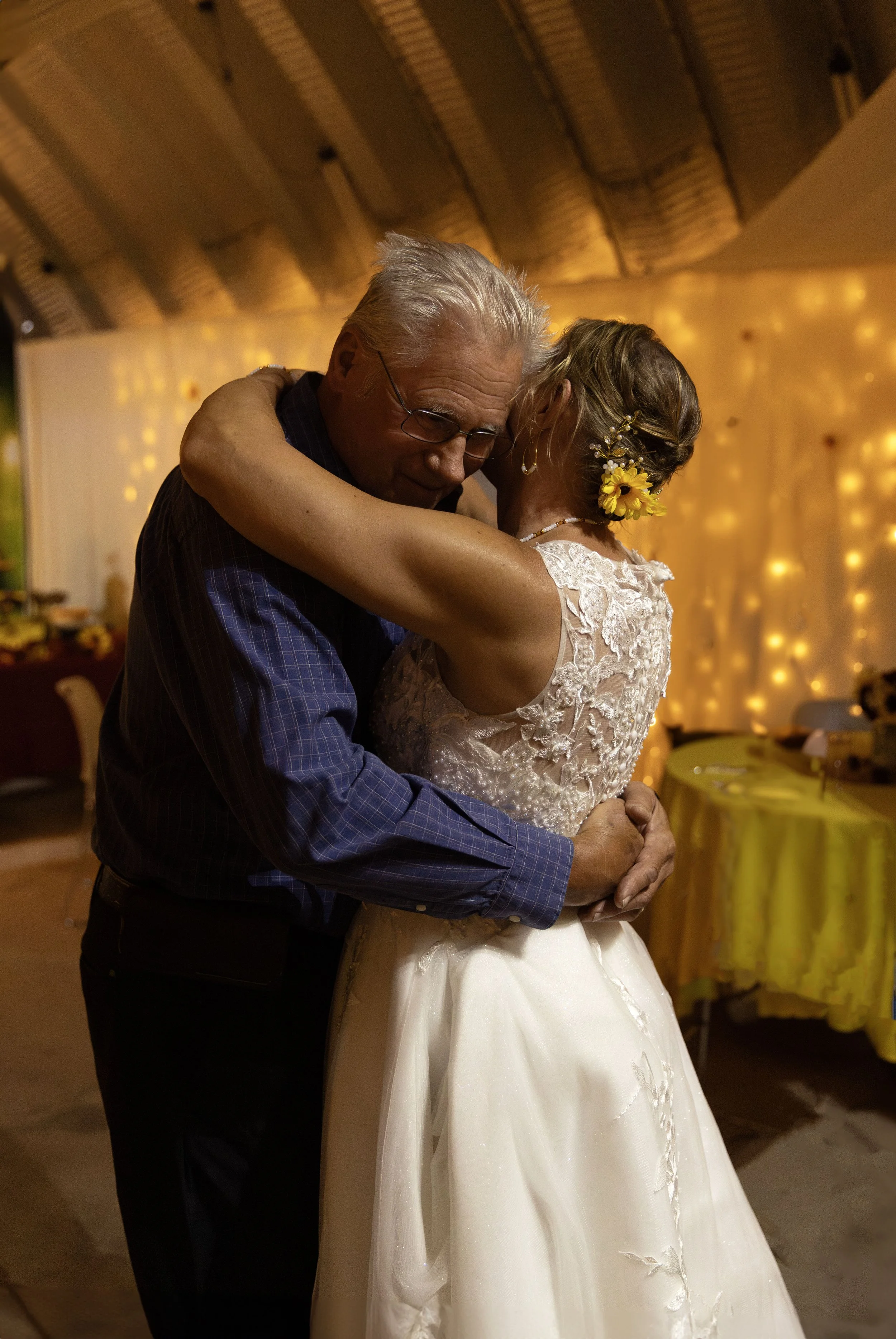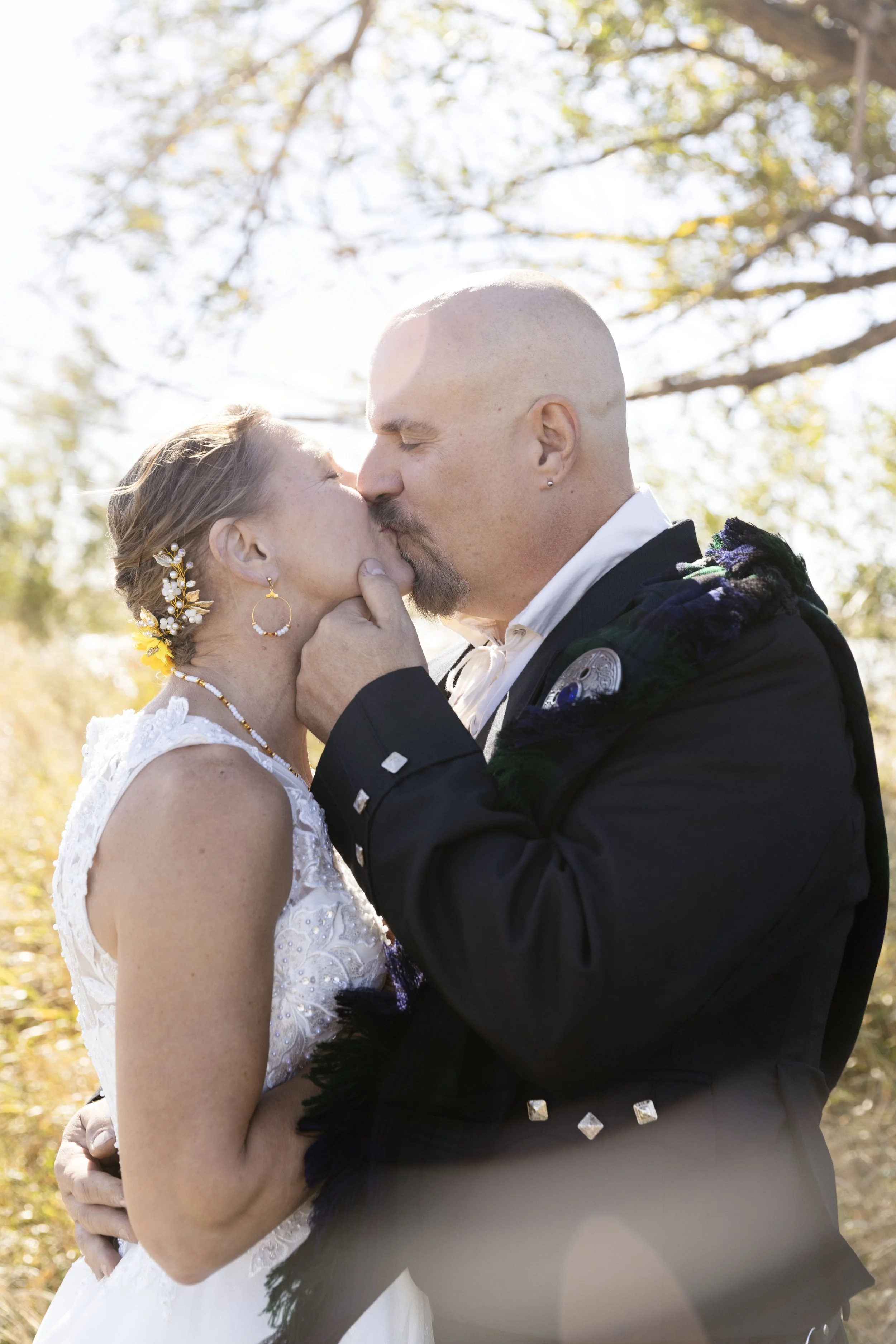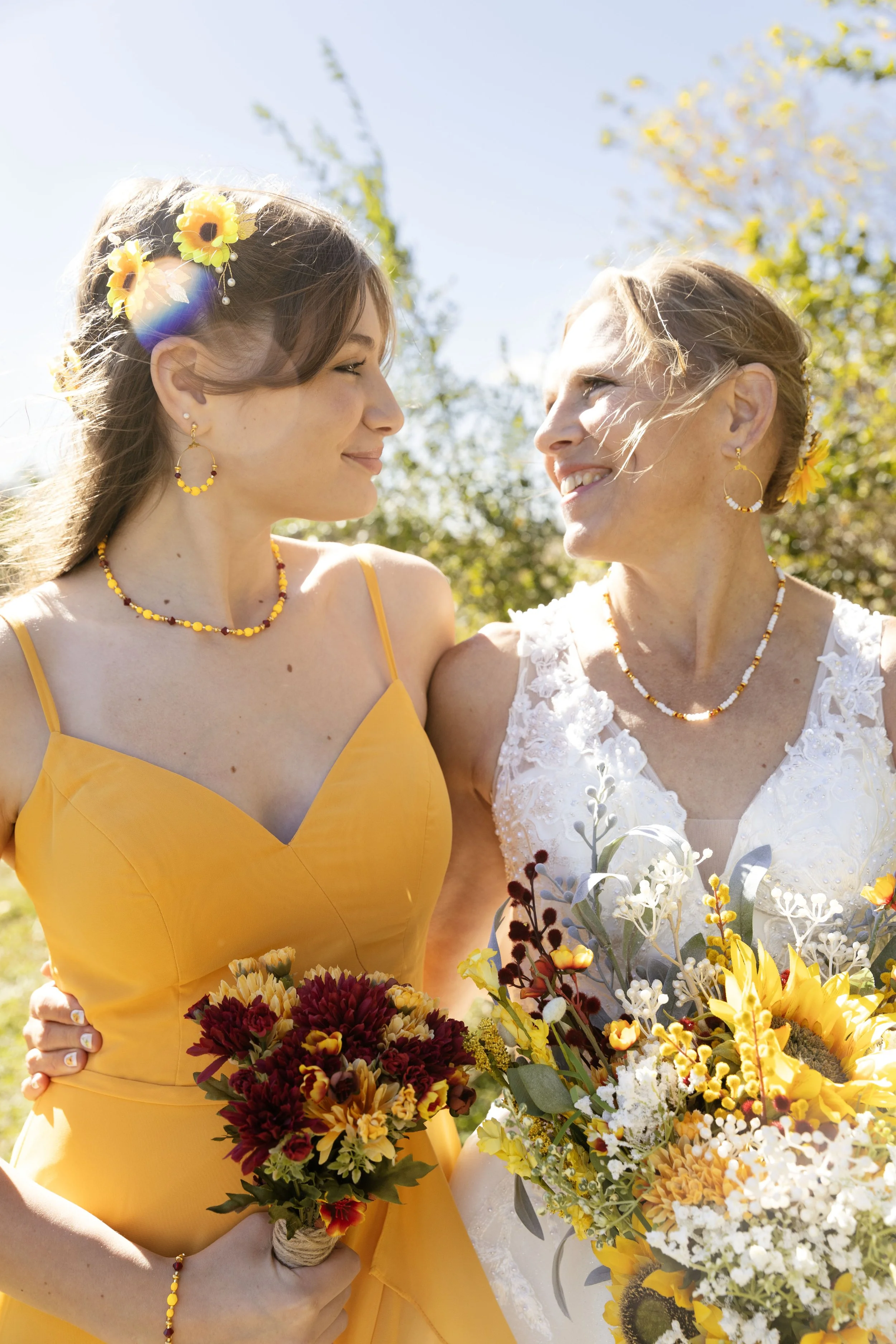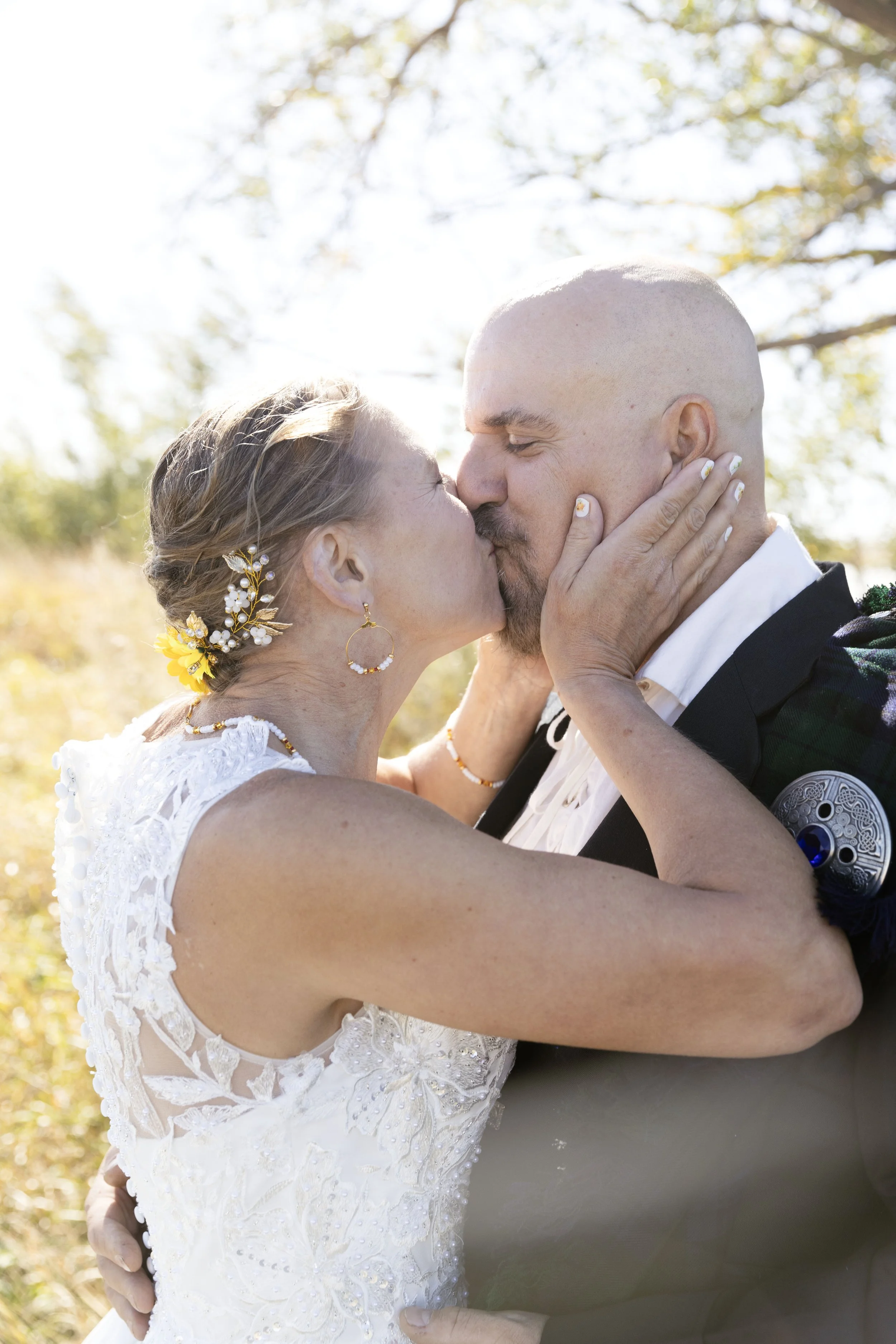 On a windy, sunny October day in 2024, Christine and Walt got married on their own land surrounded by a few friends, and family. It was fitting that sunflowers were part of the decor on such a sunny day. The wind added a sort of editorial feel to their portraits.