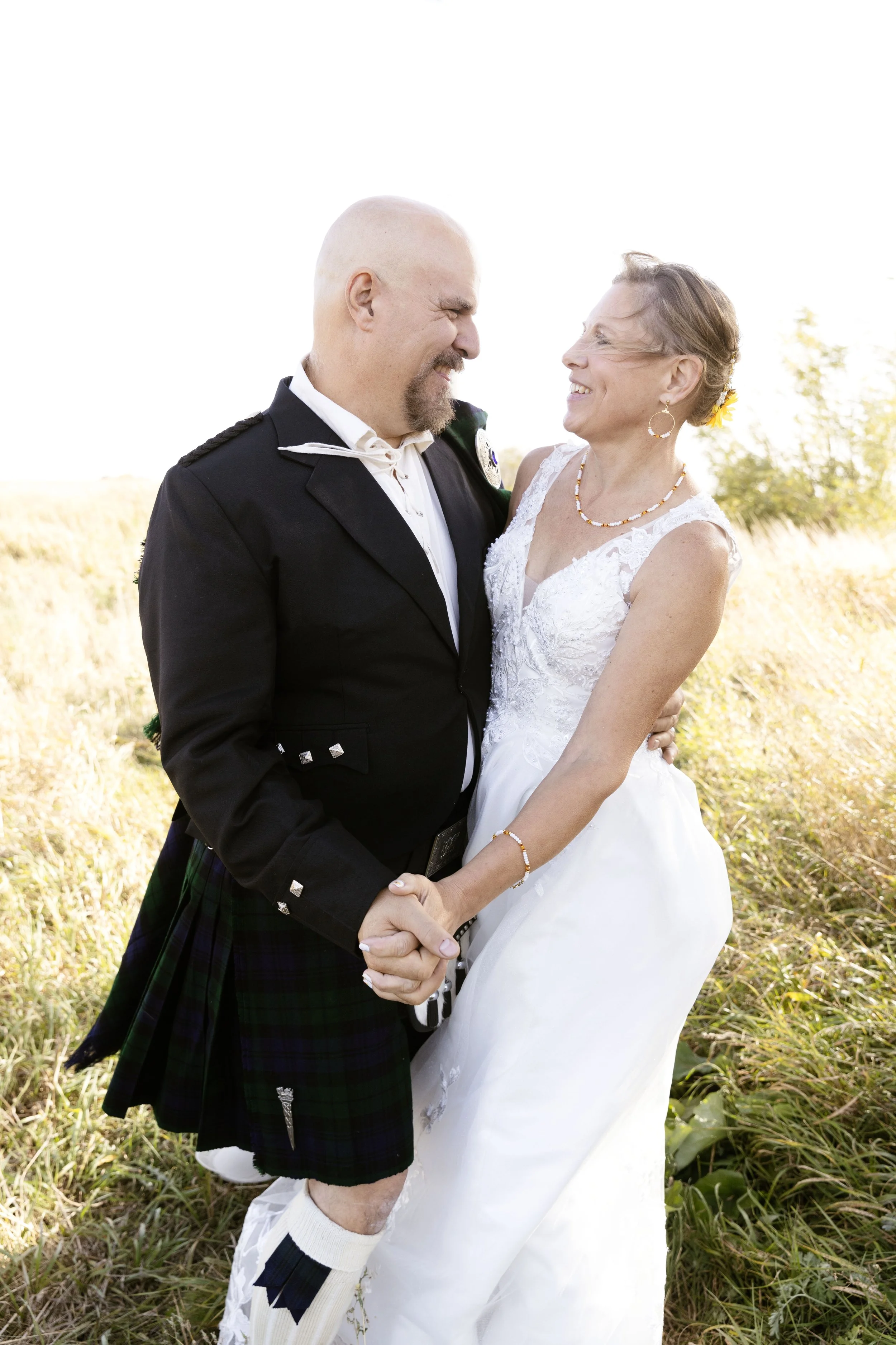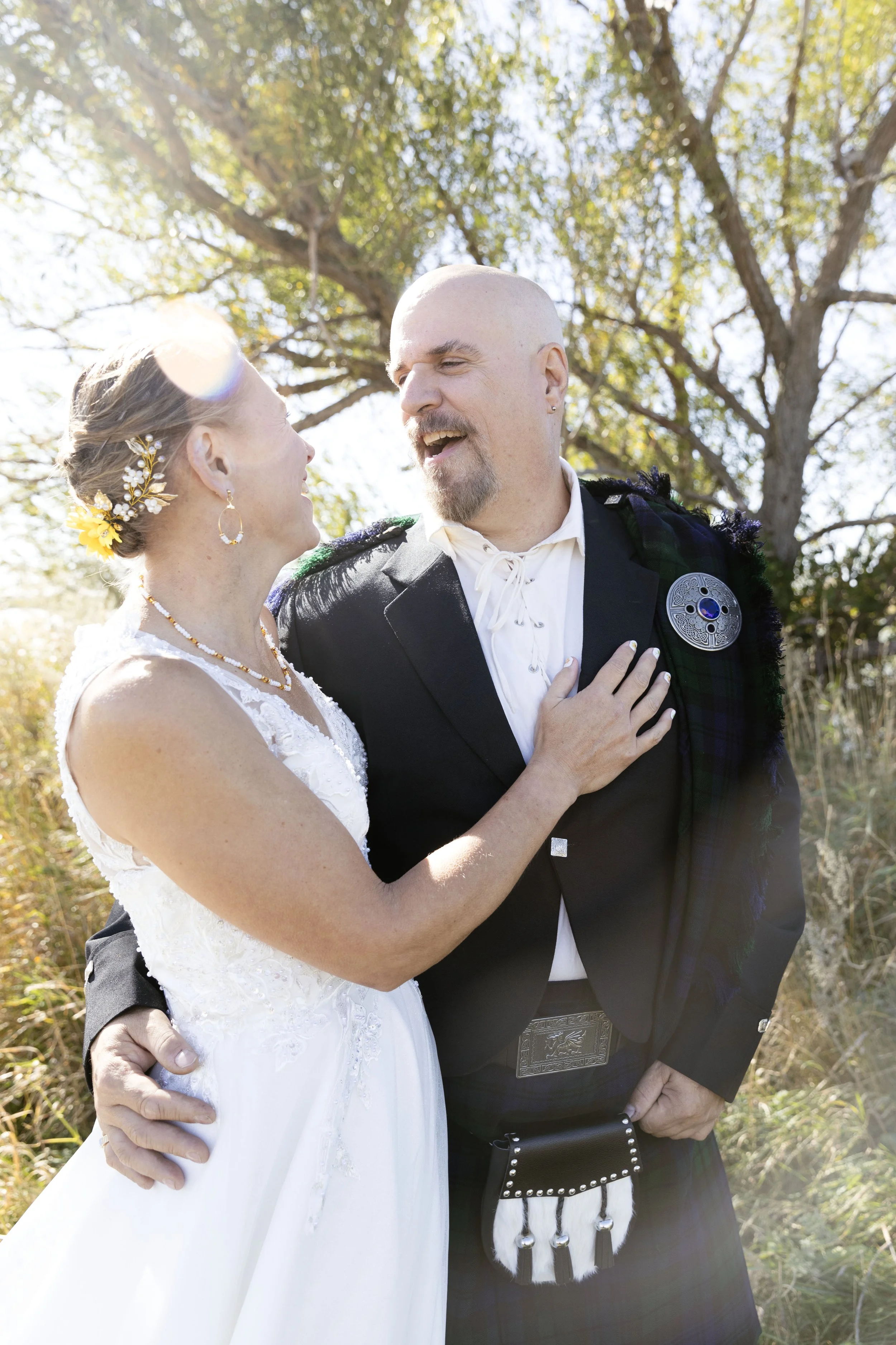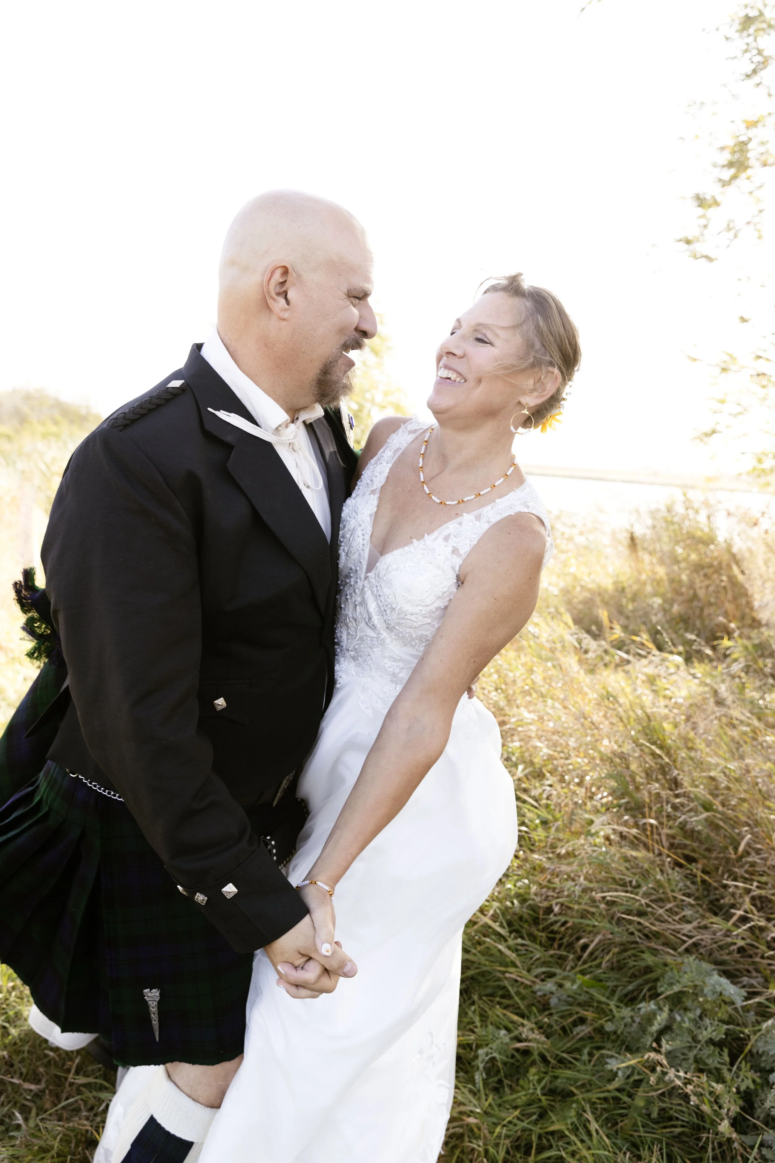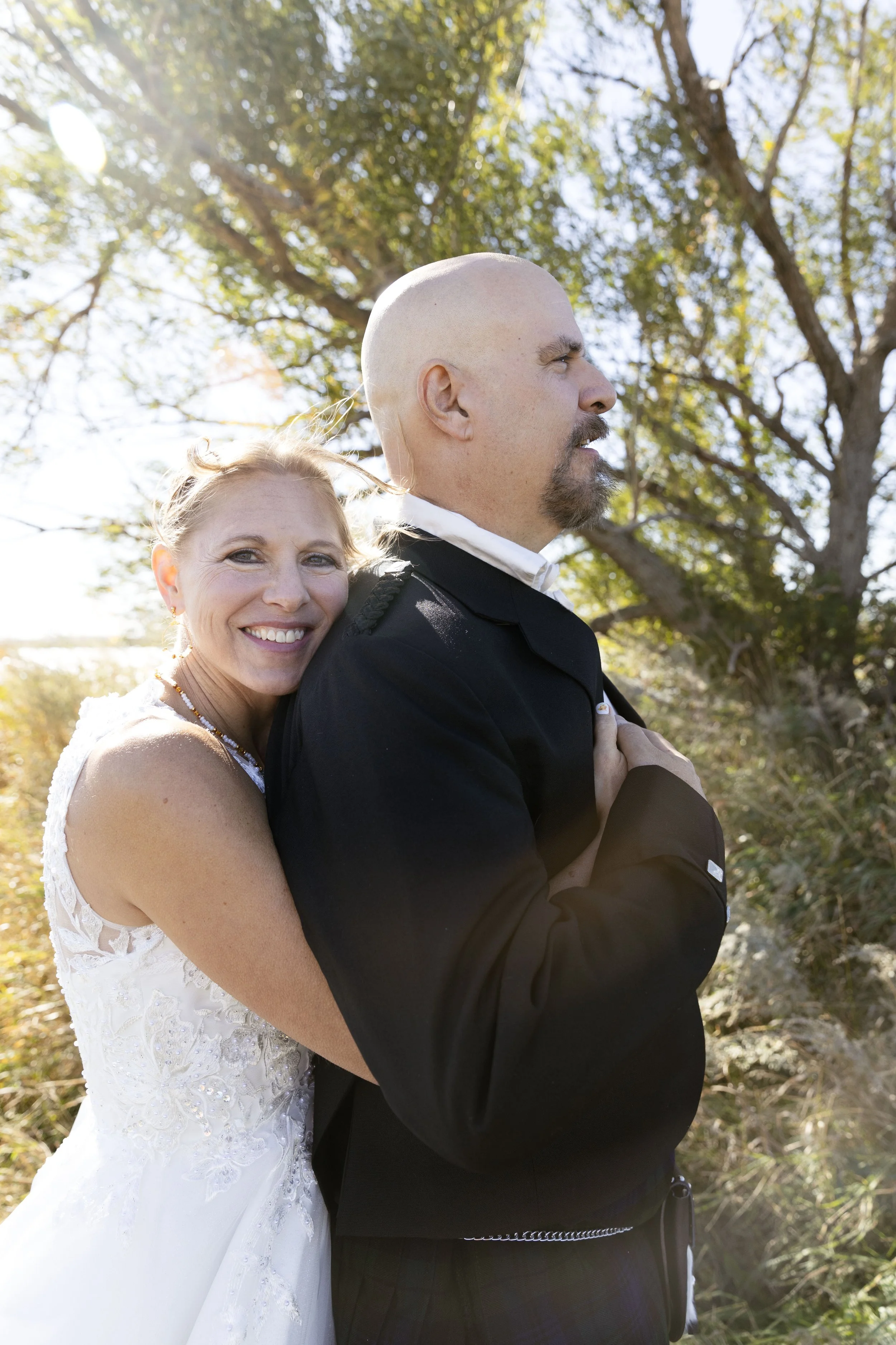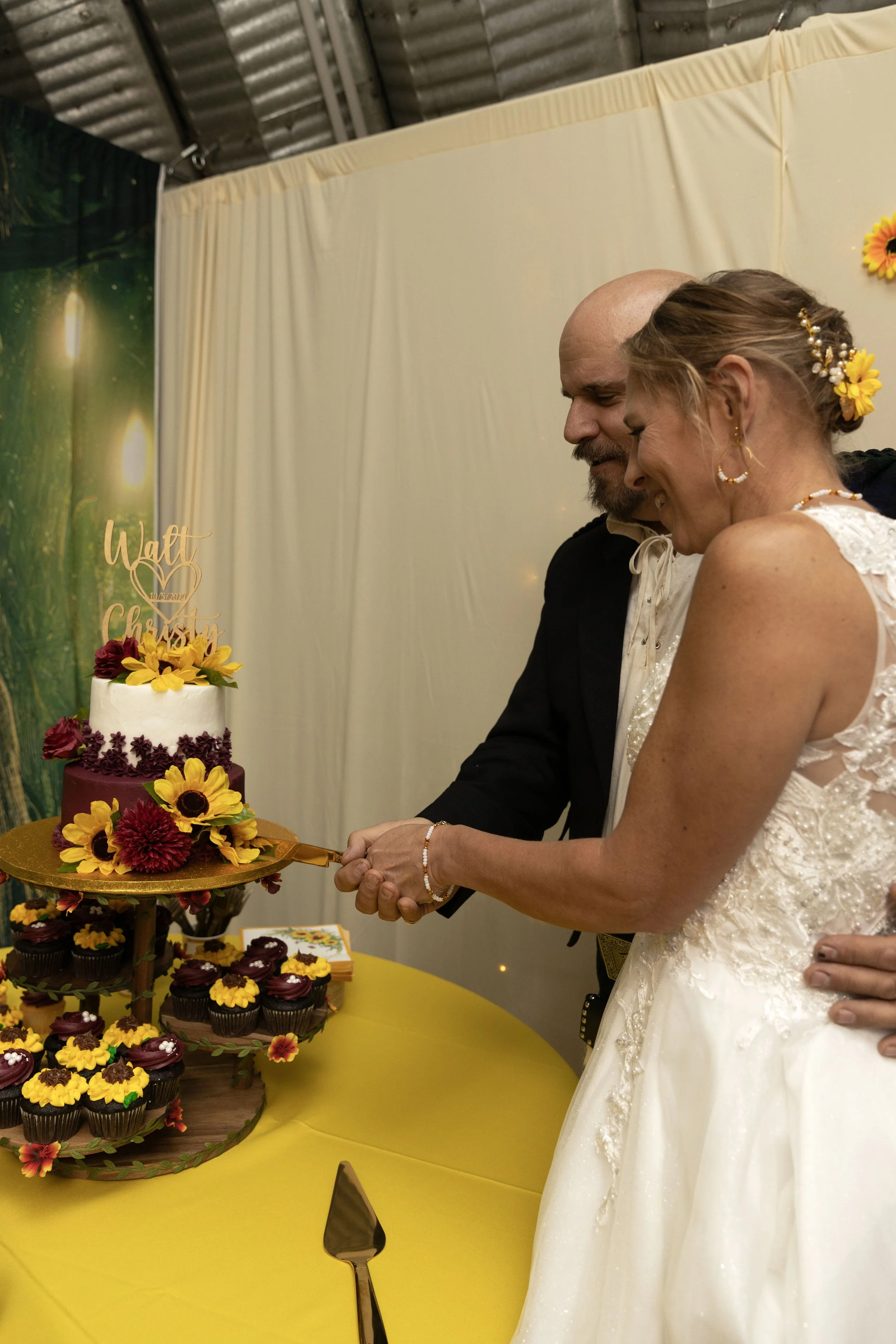 On a windy, sunny October day in 2024, Christine and Walt got married on their own land surrounded by a few friends, and family. It was fitting that sunflowers were part of the decor on such a sunny day. The wind added a sort of editorial feel to their portraits.