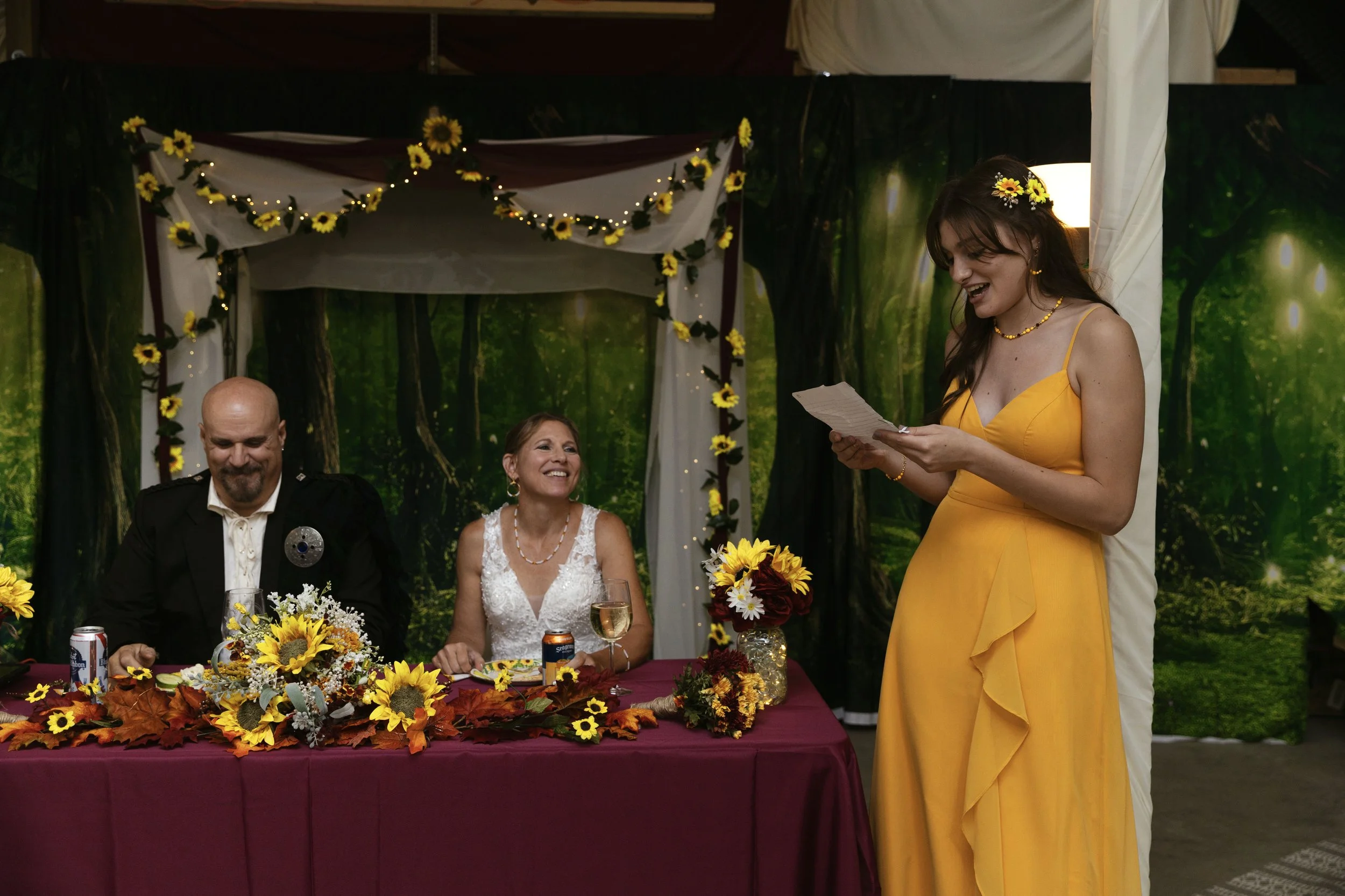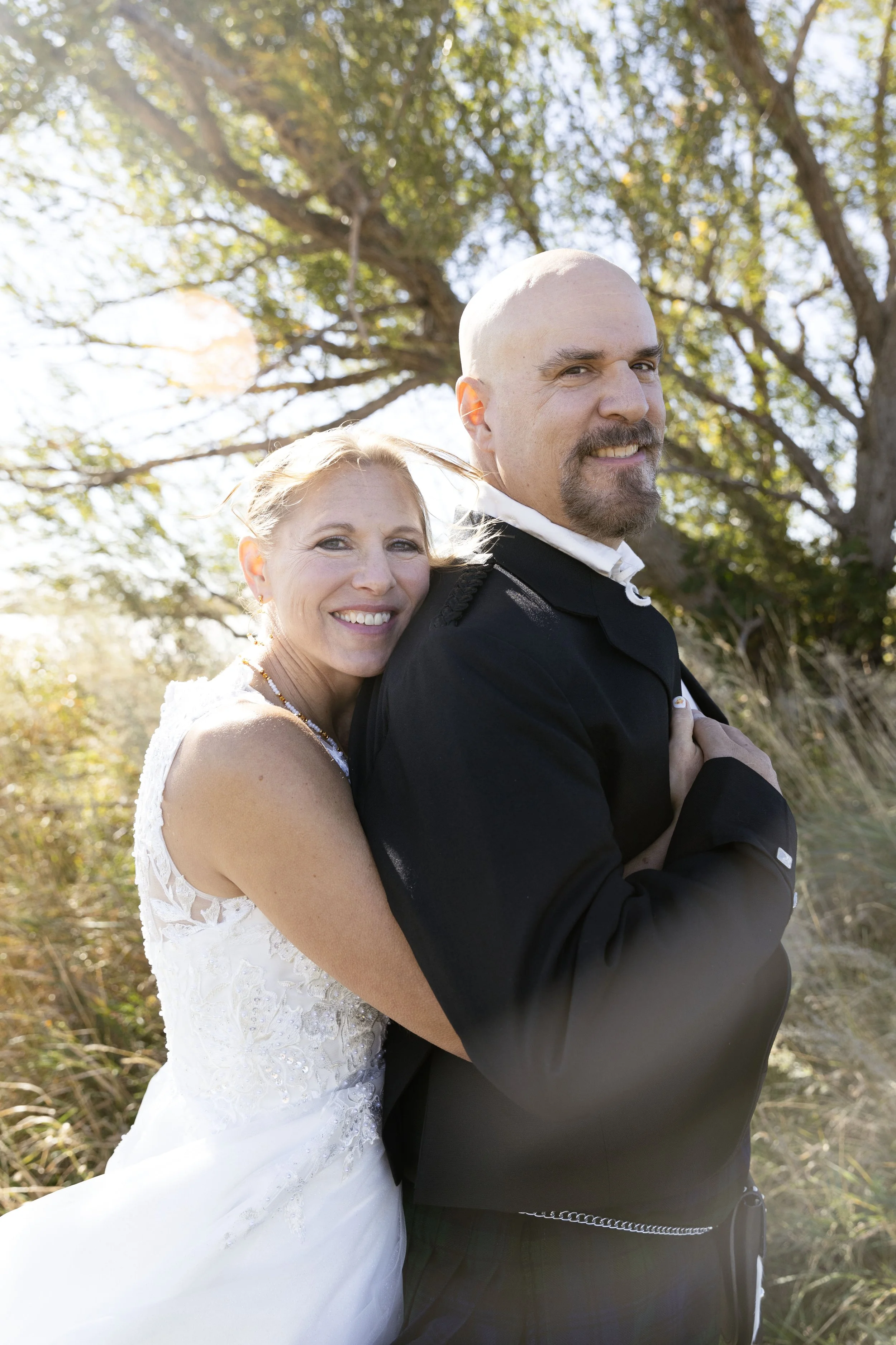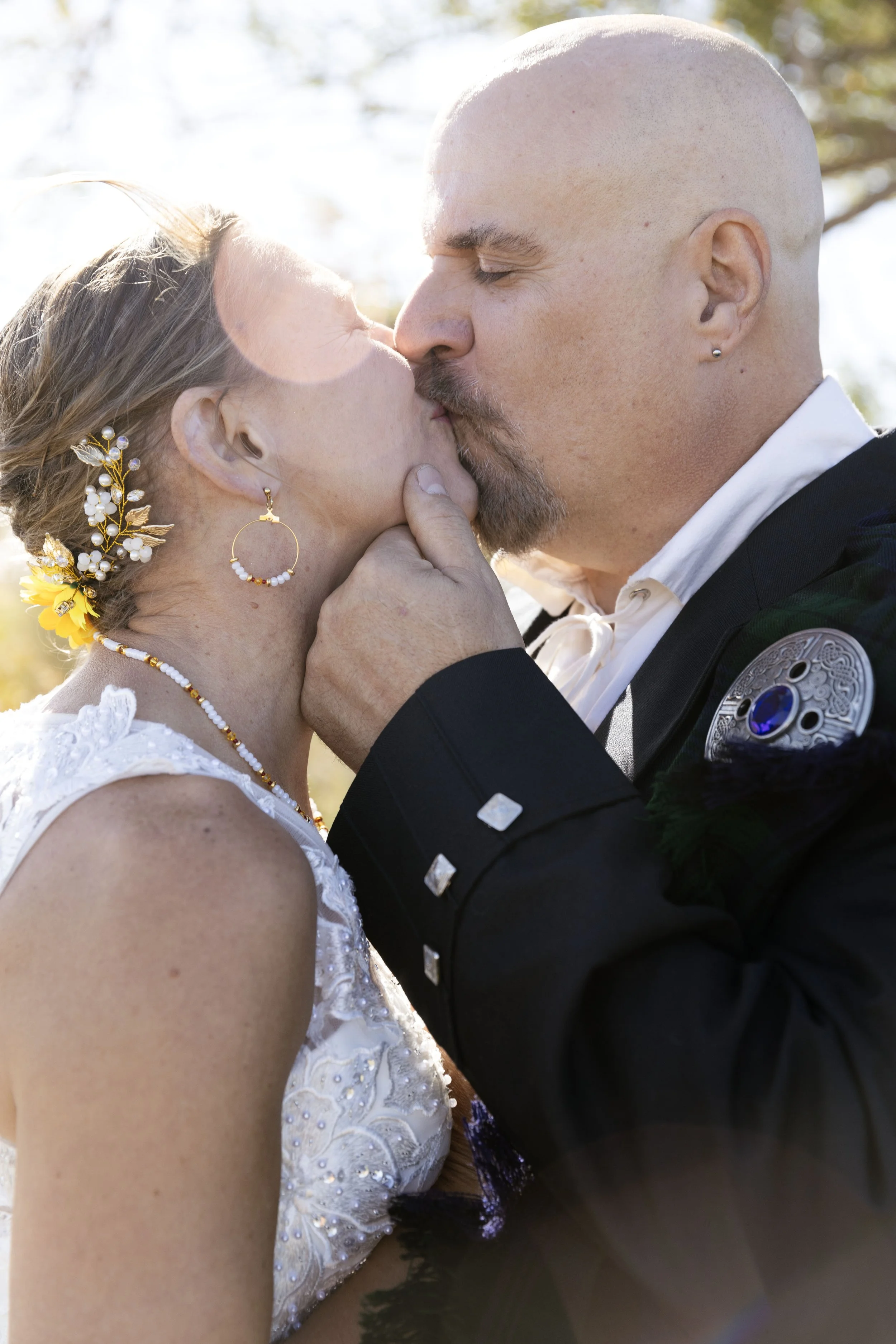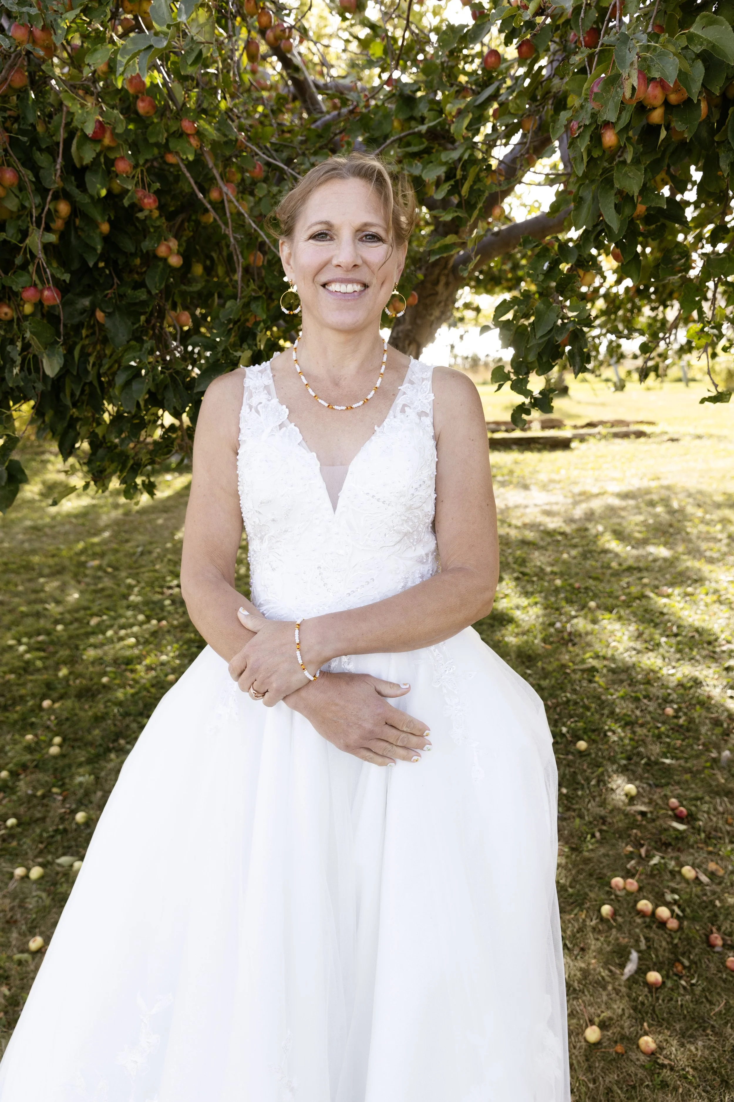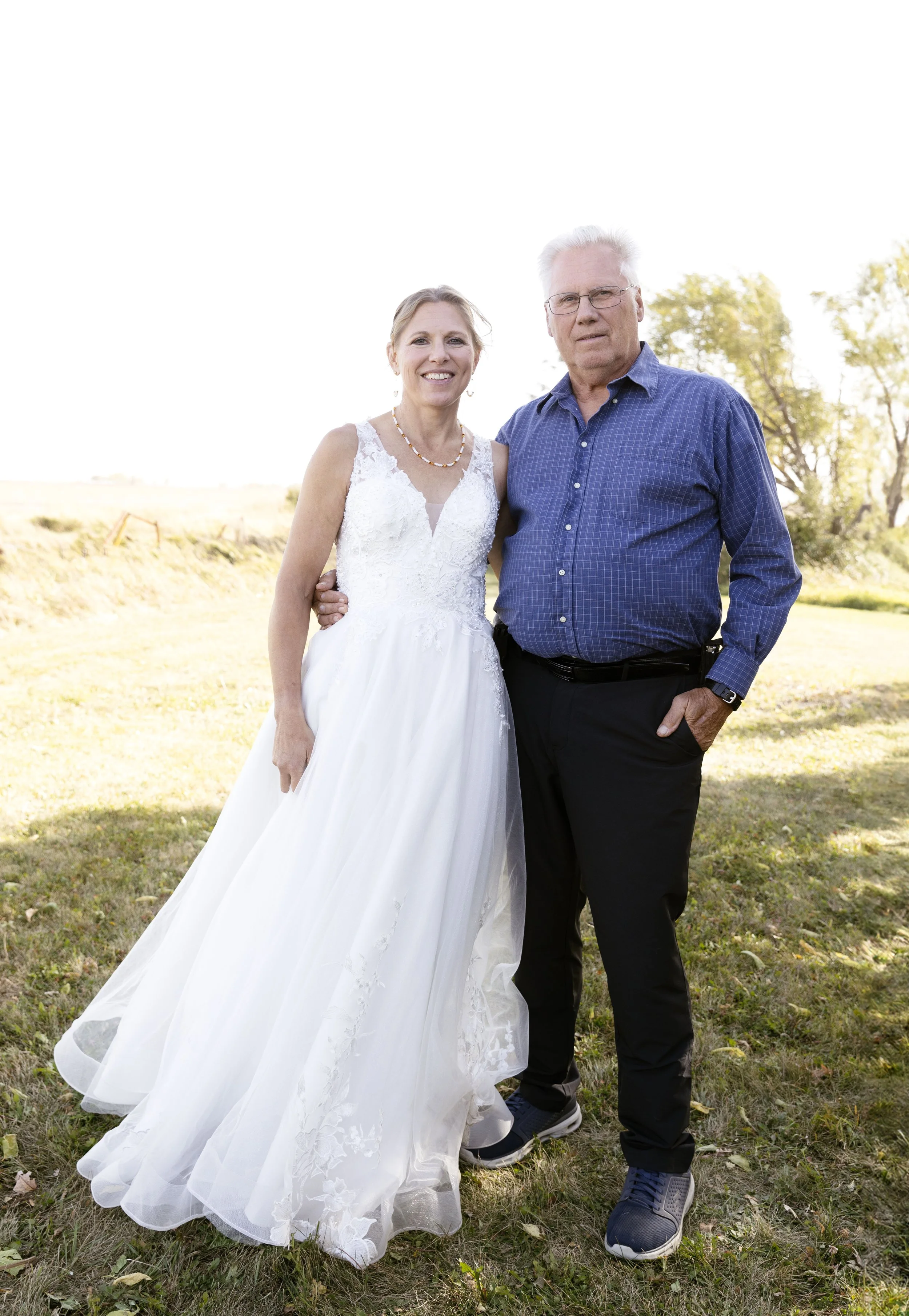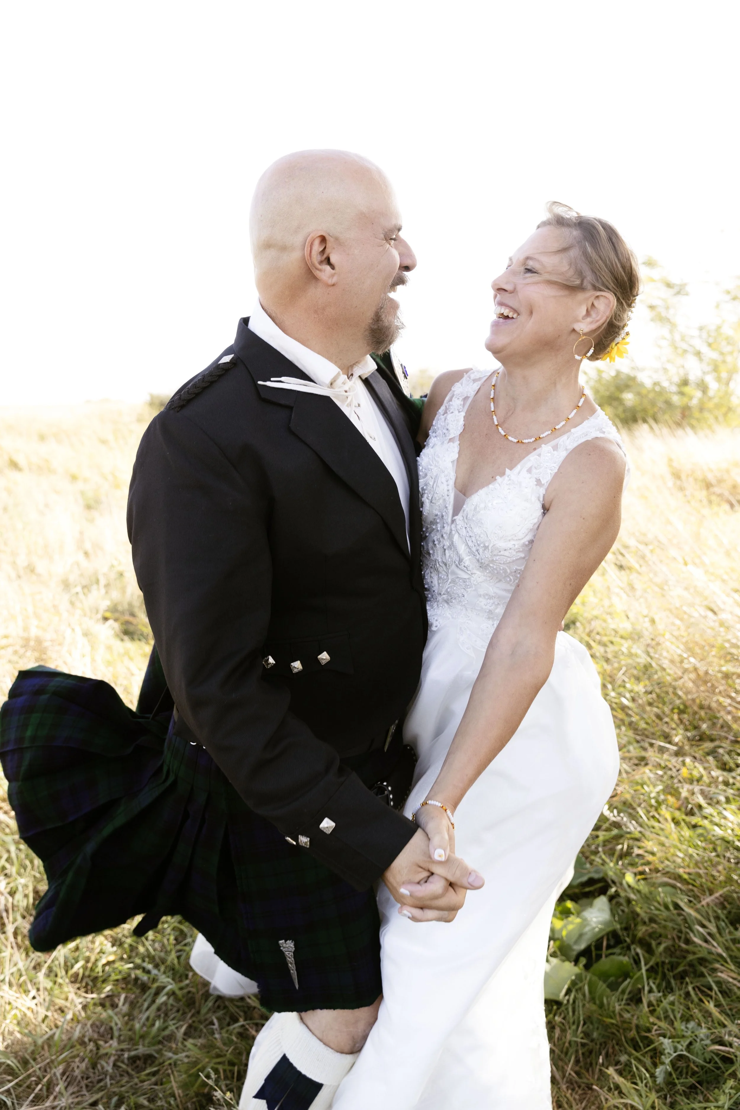 On a windy, sunny October day in 2024, Christine and Walt got married on their own land surrounded by a few friends, and family. It was fitting that sunflowers were part of the decor on such a sunny day. The wind added a sort of editorial feel to their portraits.