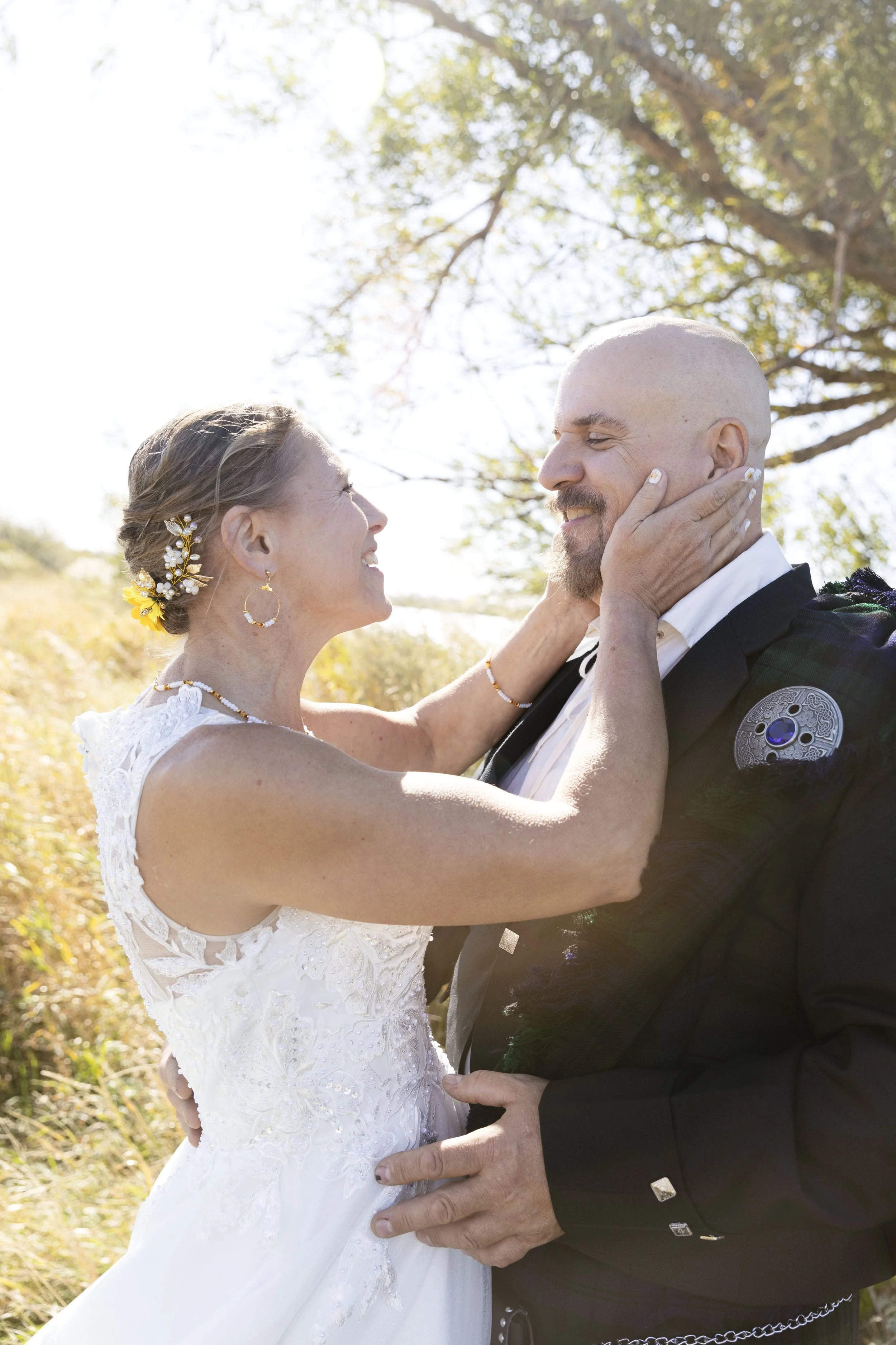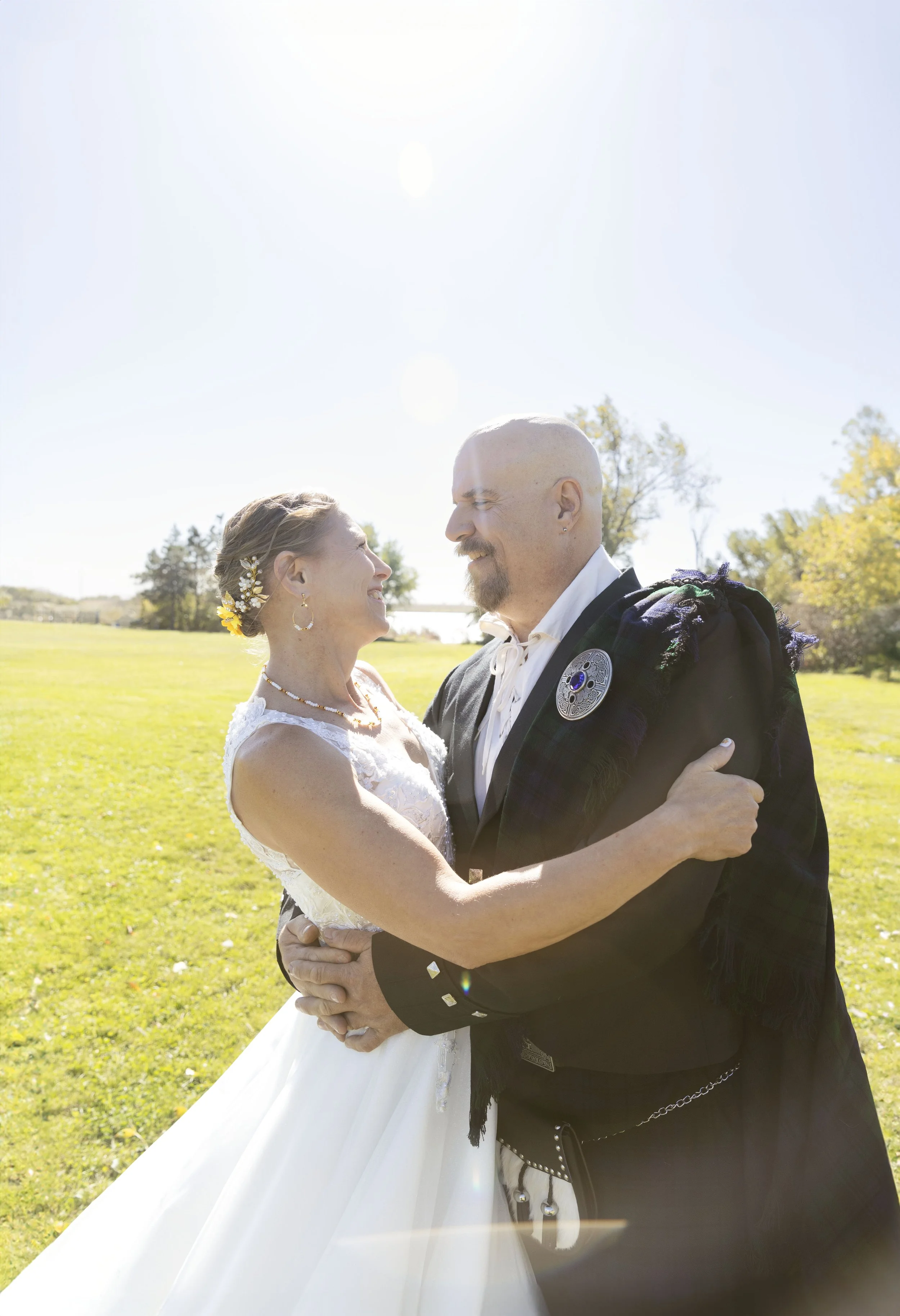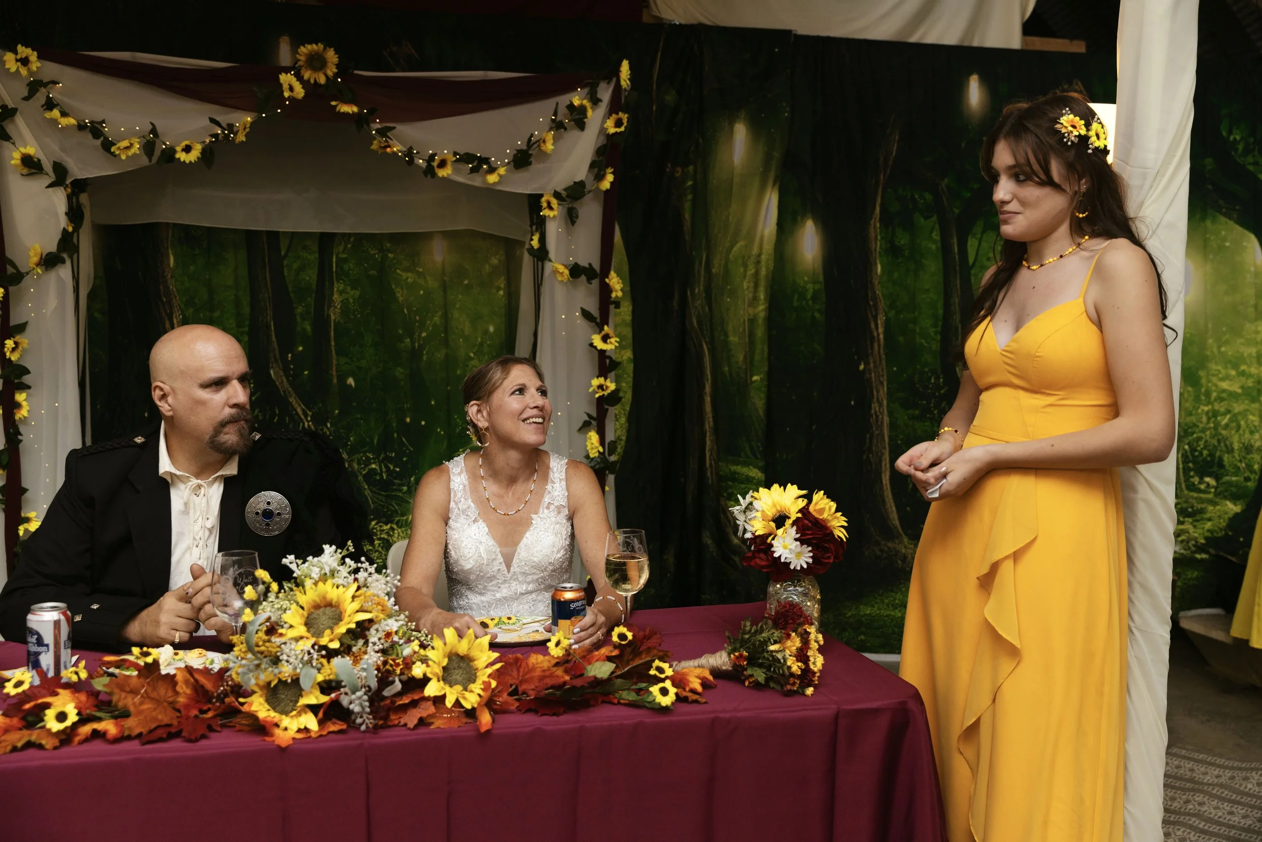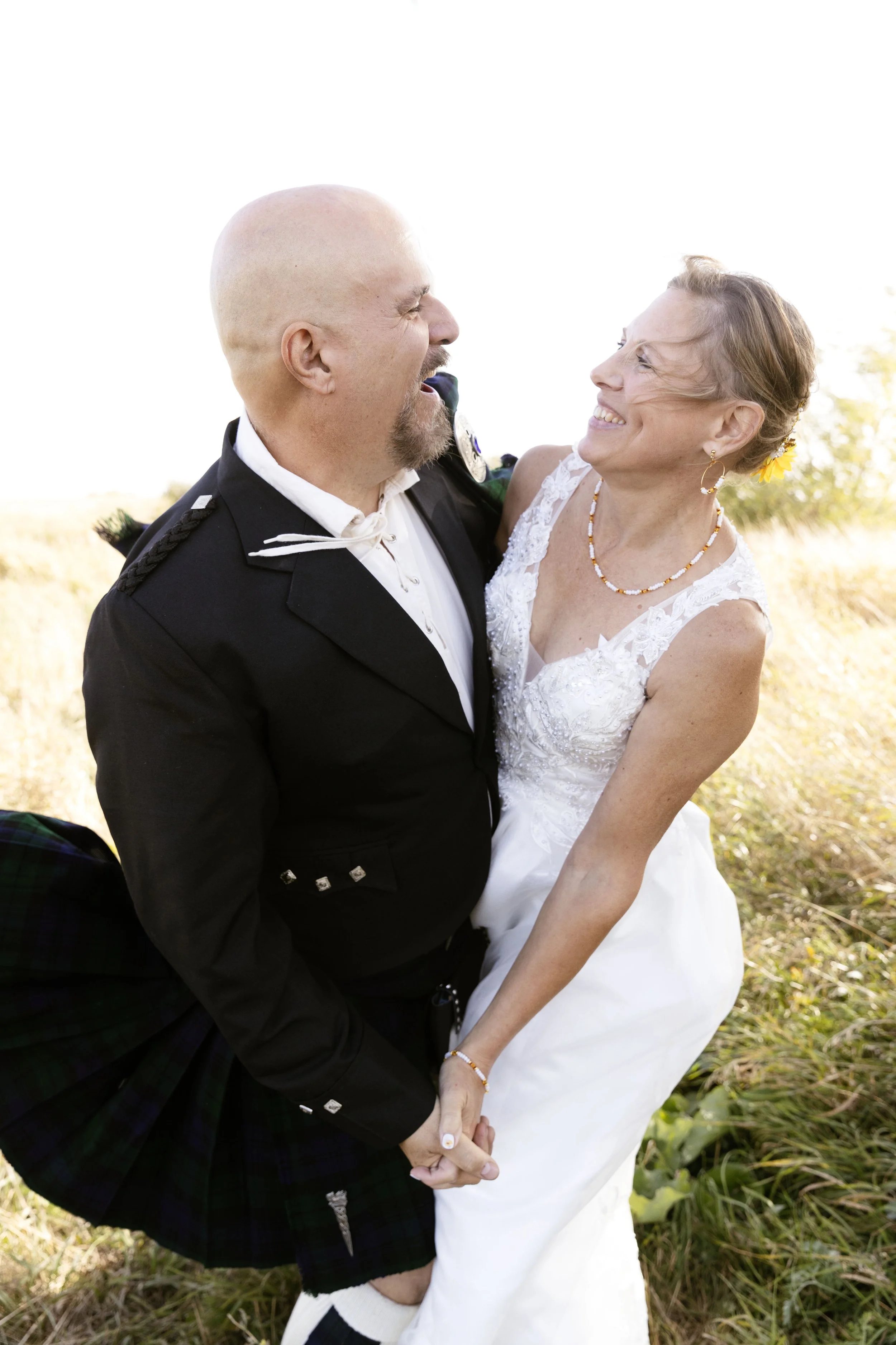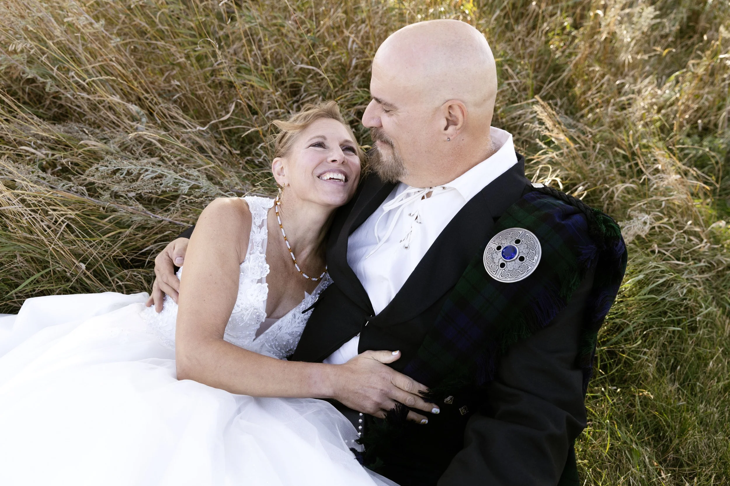 On a windy, sunny October day in 2024, Christine and Walt got married on their own land surrounded by a few friends, and family. It was fitting that sunflowers were part of the decor on such a sunny day. The wind added a sort of editorial feel to their portraits.