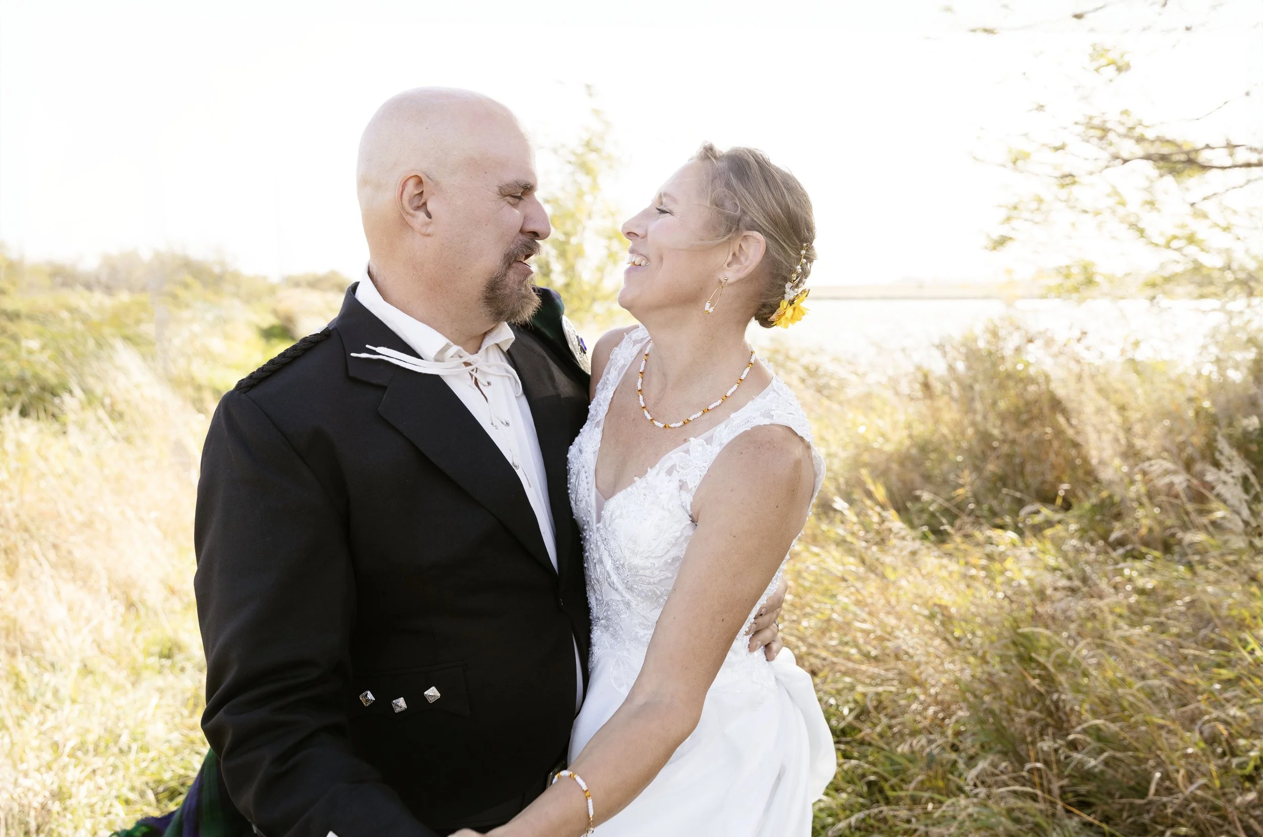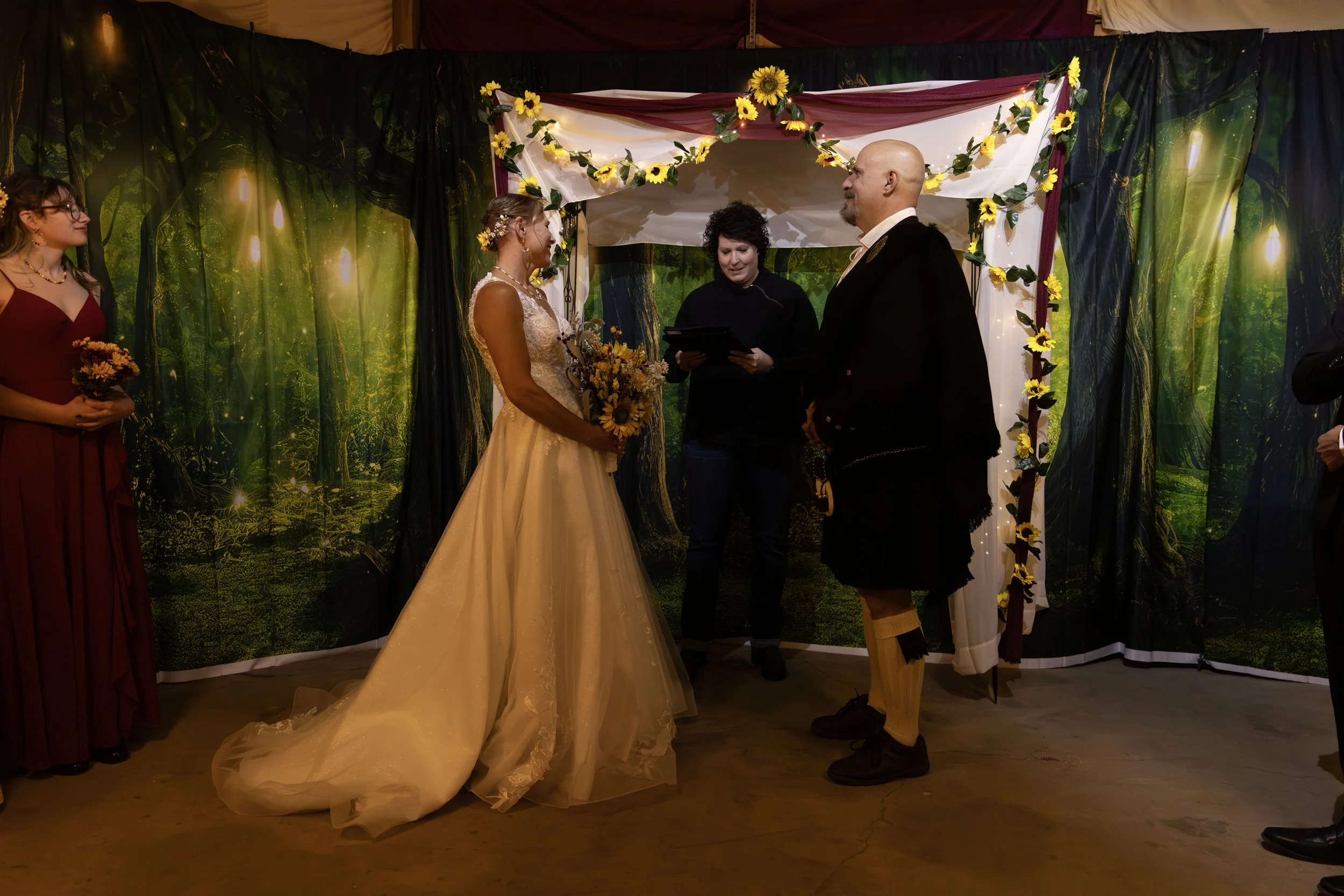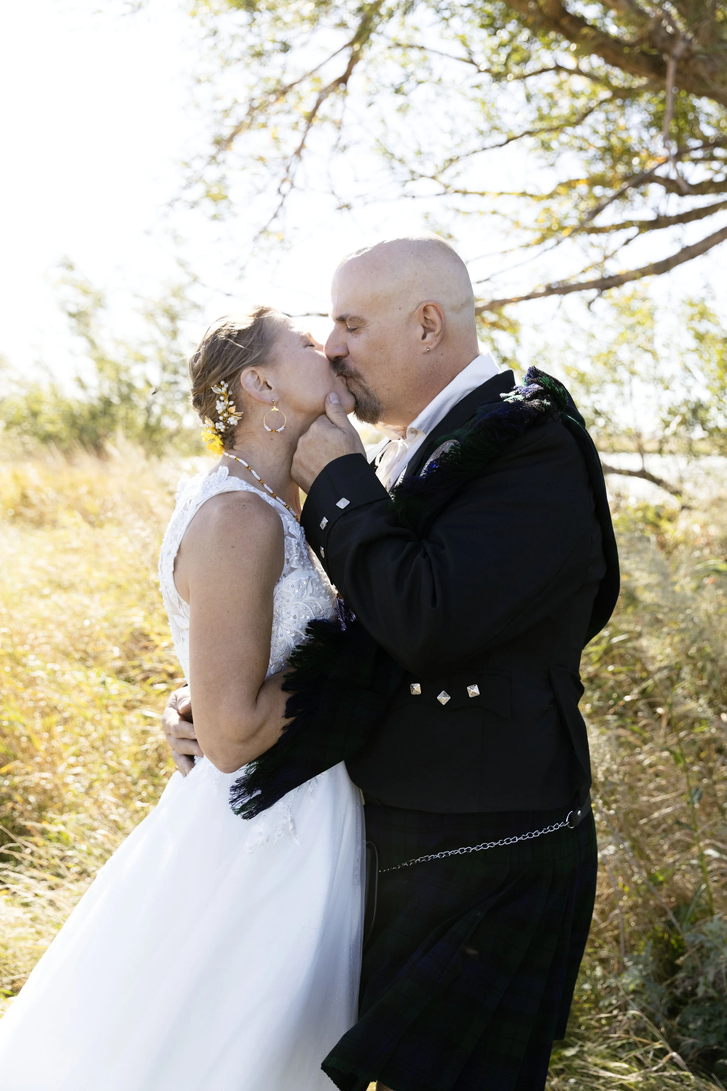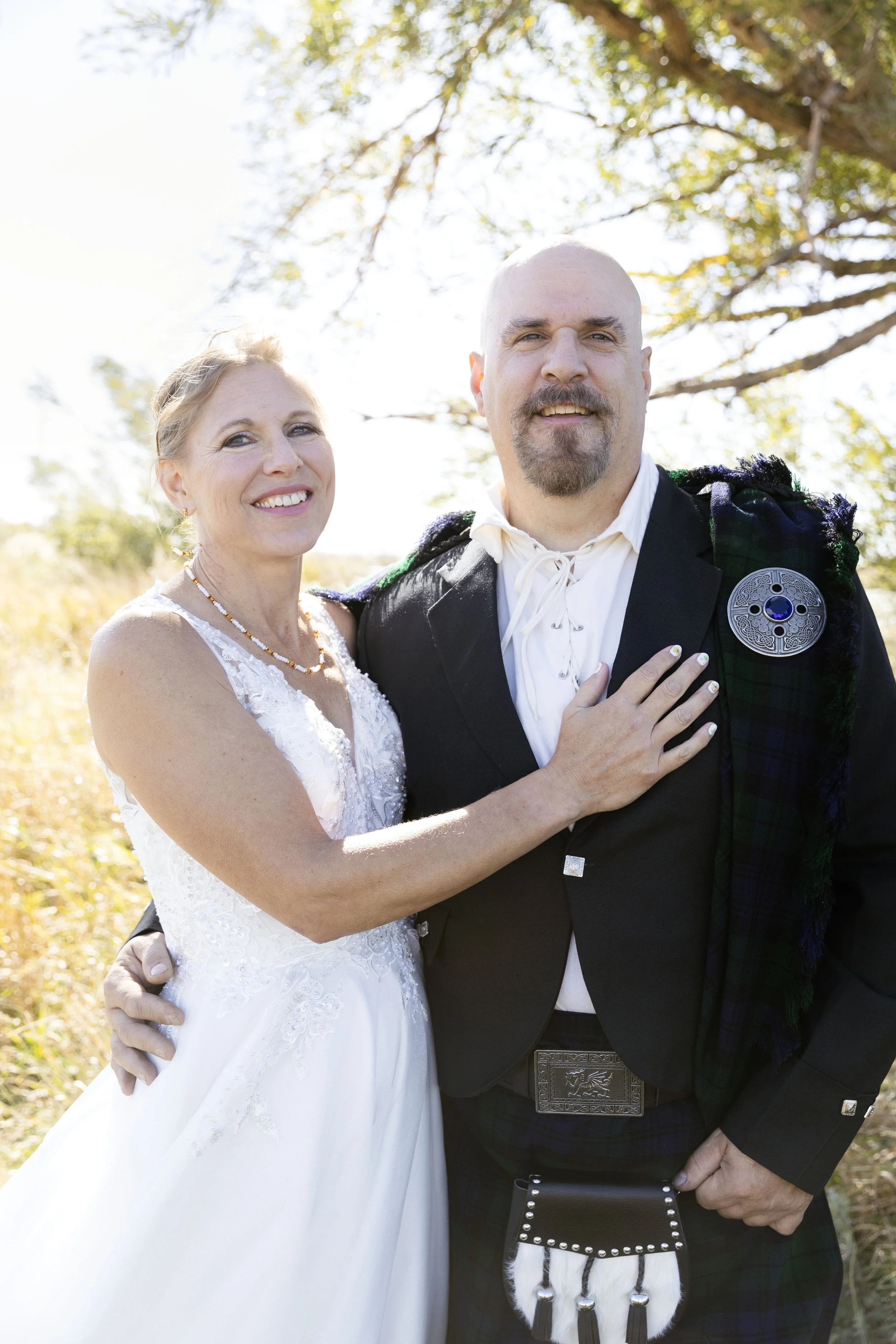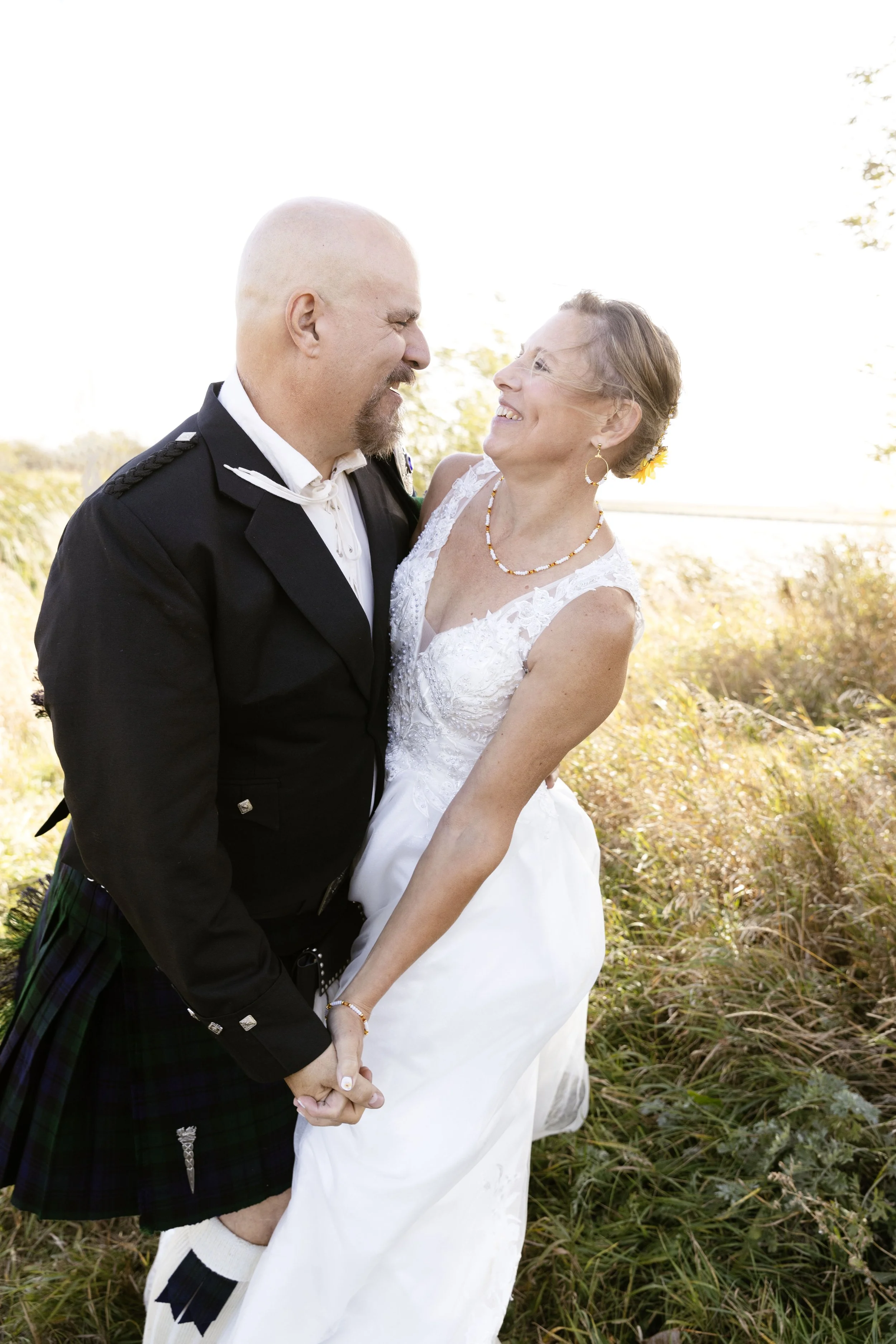 On a windy, sunny October day in 2024, Christine and Walt got married on their own land surrounded by a few friends, and family. It was fitting that sunflowers were part of the decor on such a sunny day. The wind added a sort of editorial feel to their portraits.