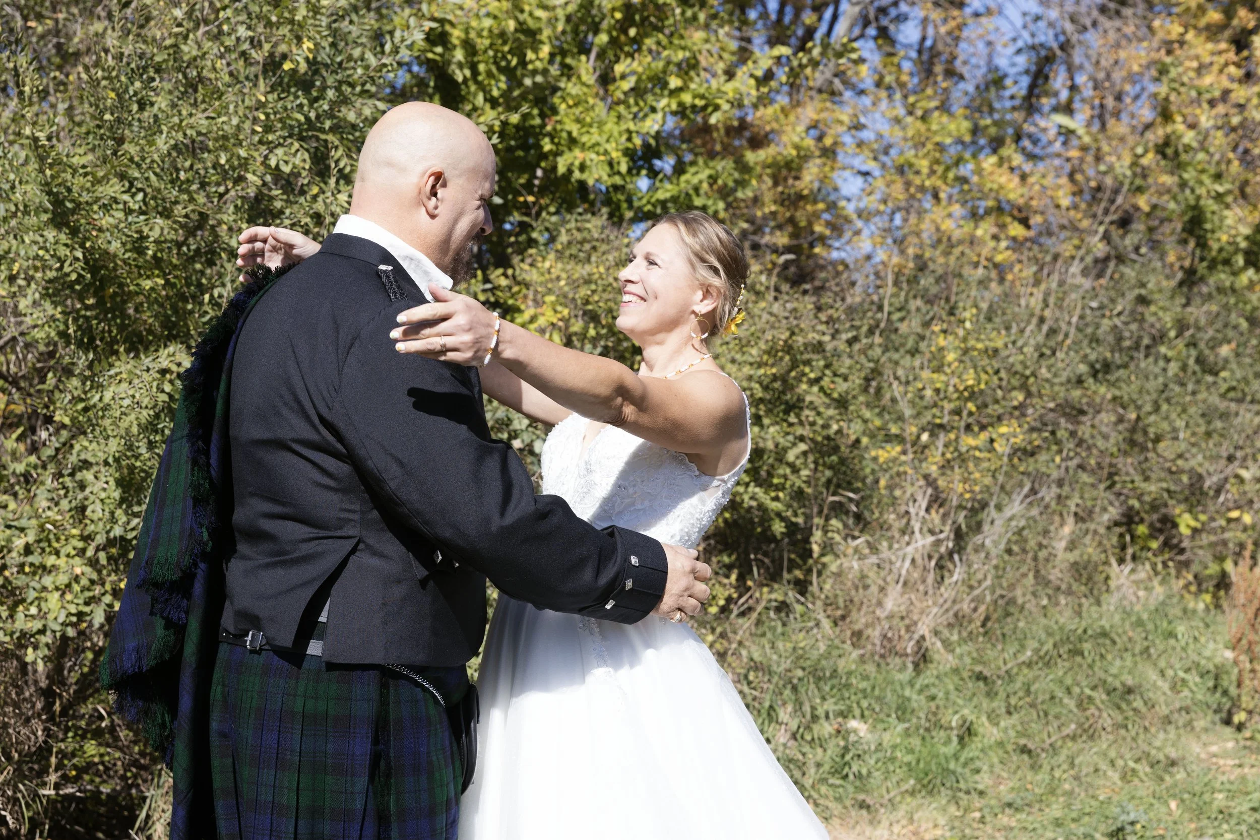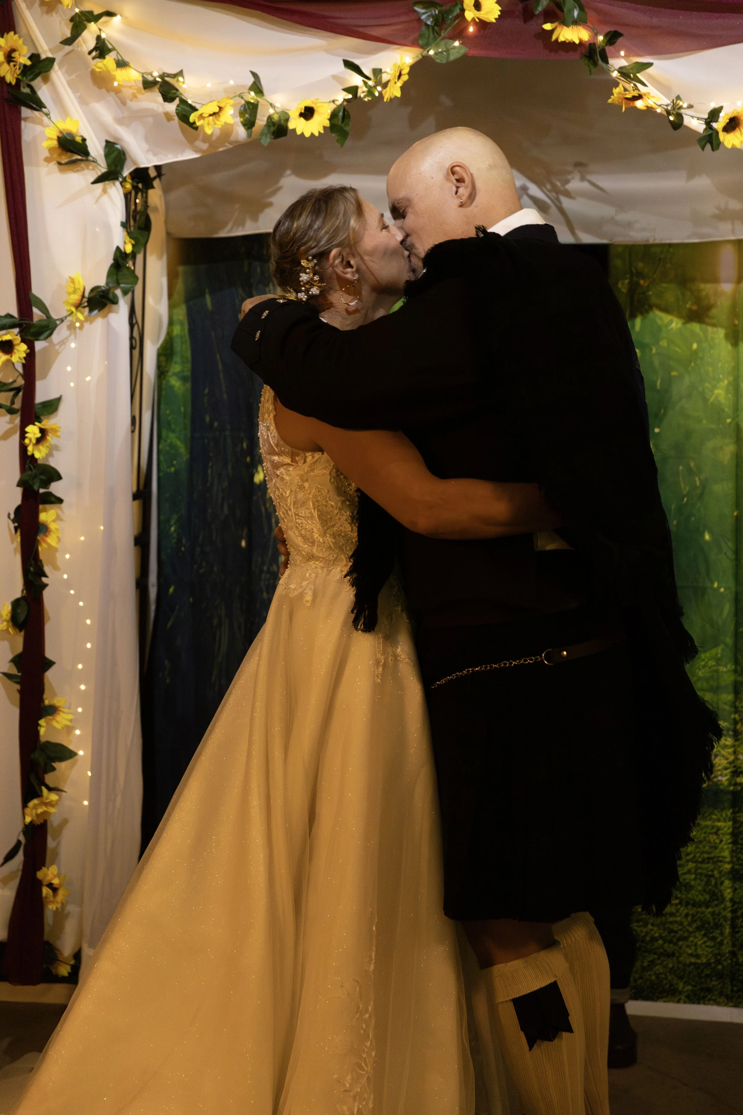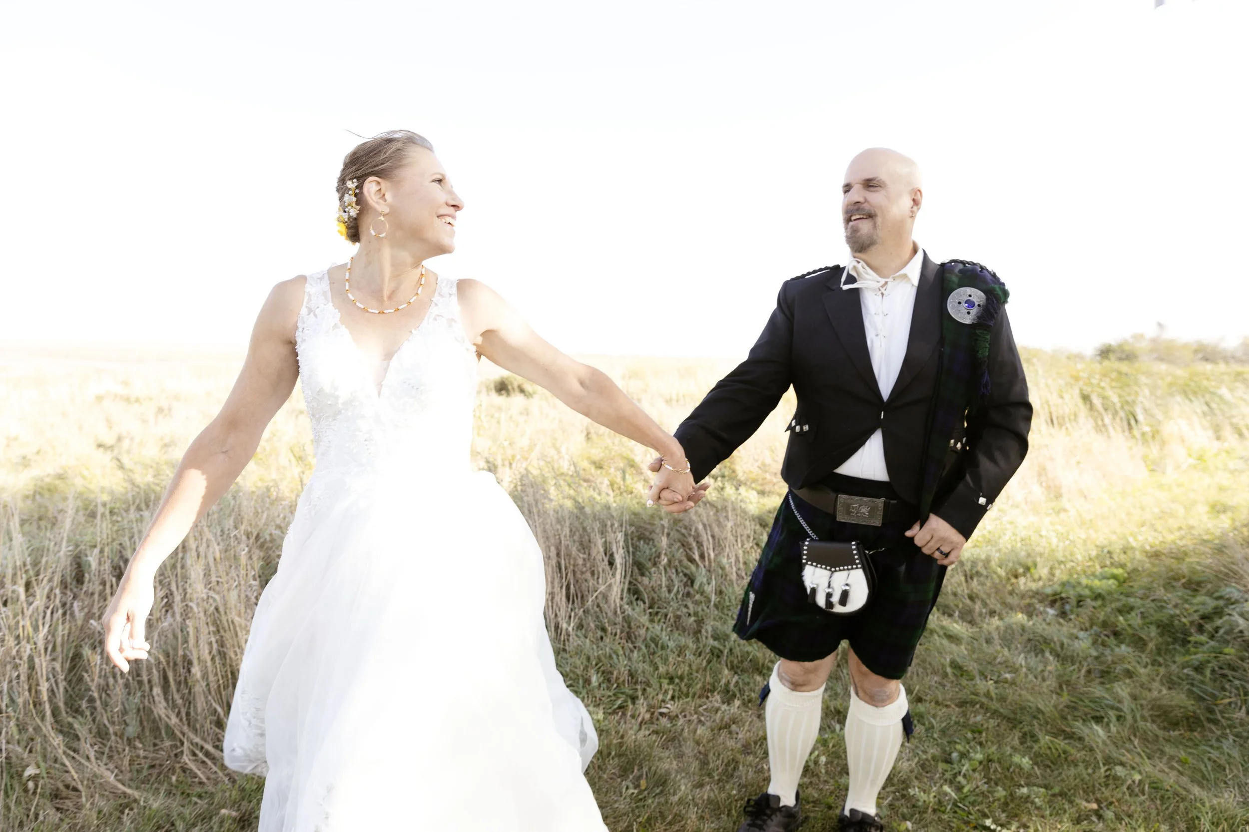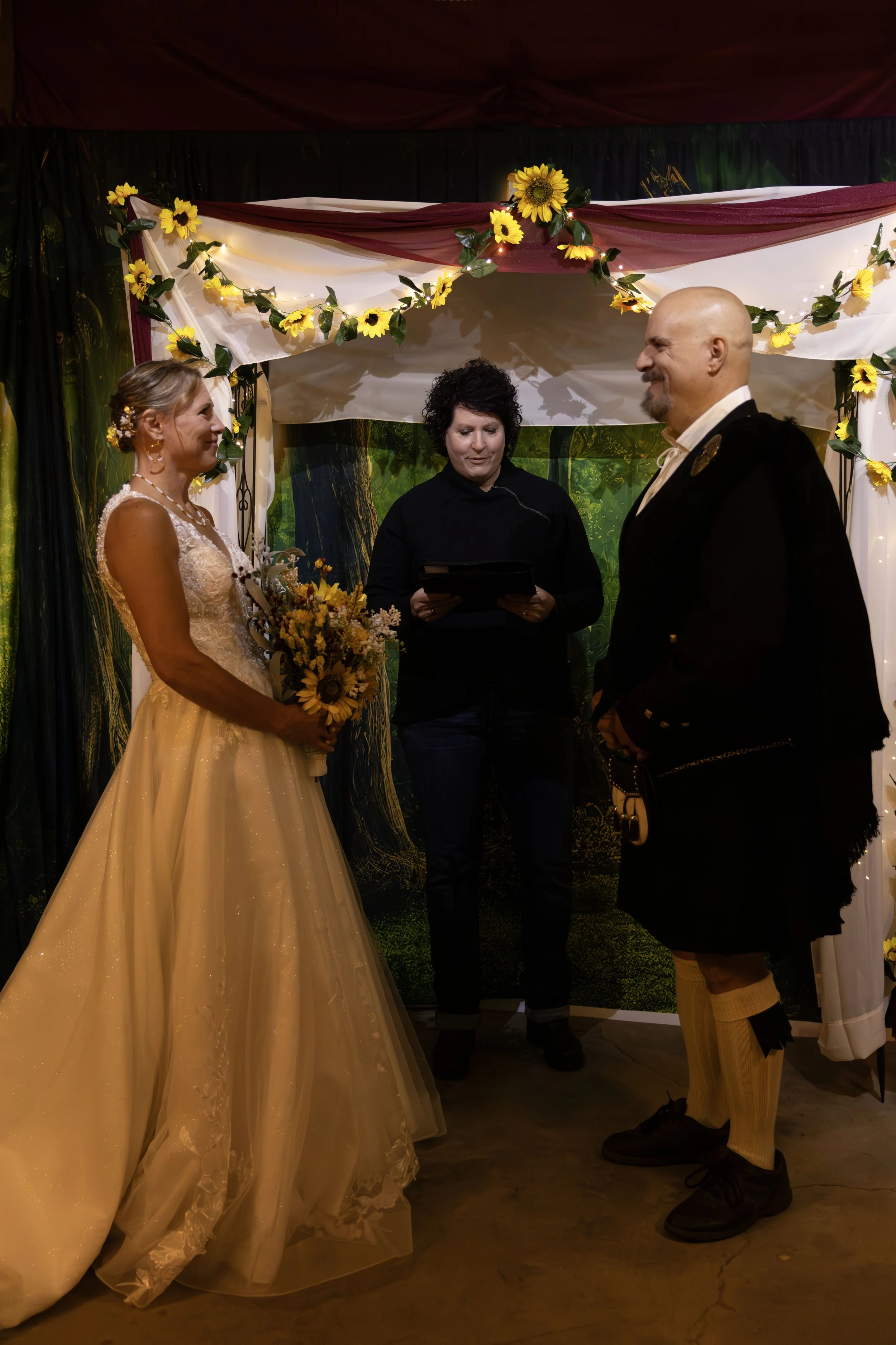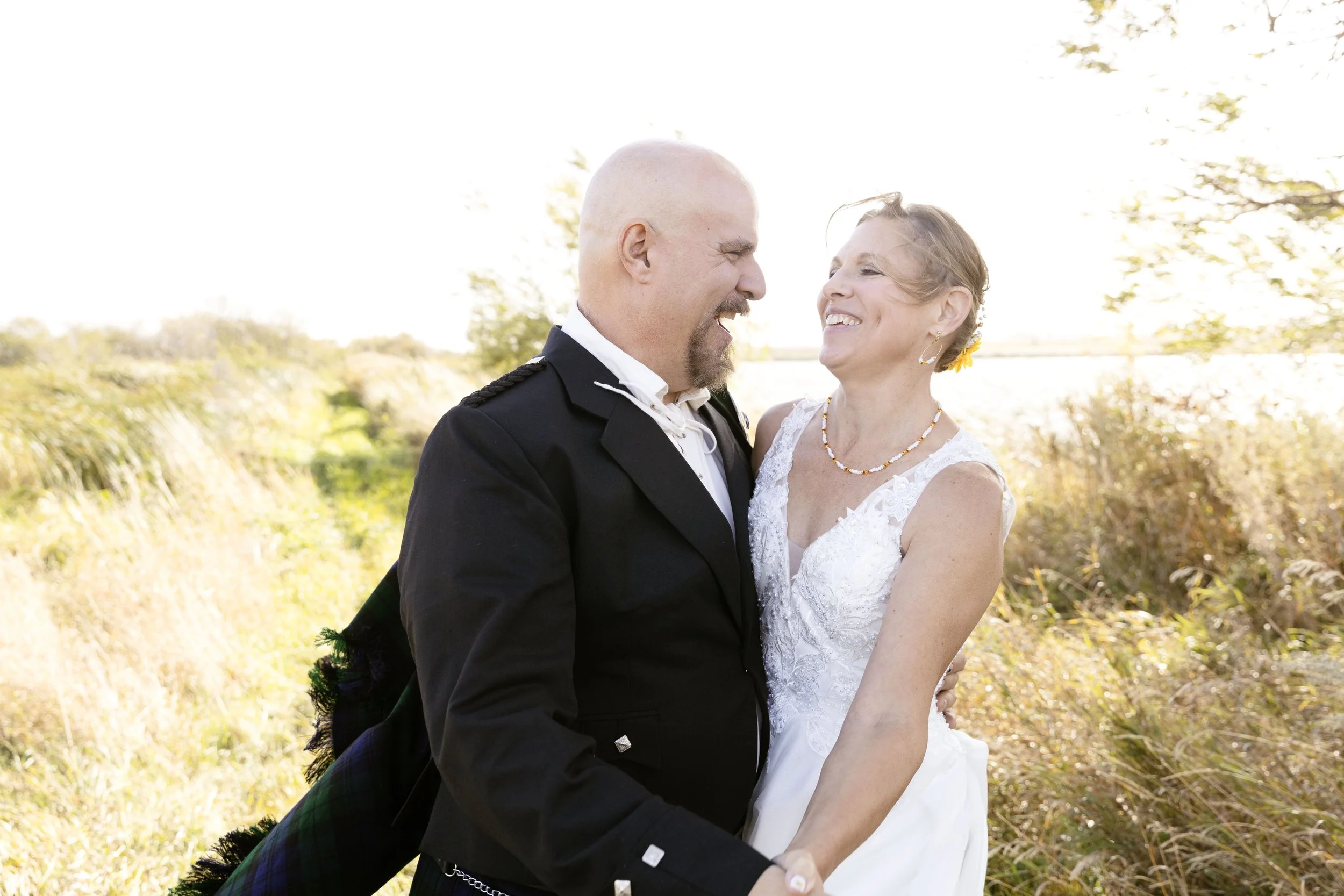 On a windy, sunny October day in 2024, Christine and Walt got married on their own land surrounded by a few friends, and family. It was fitting that sunflowers were part of the decor on such a sunny day. The wind added a sort of editorial feel to their portraits.