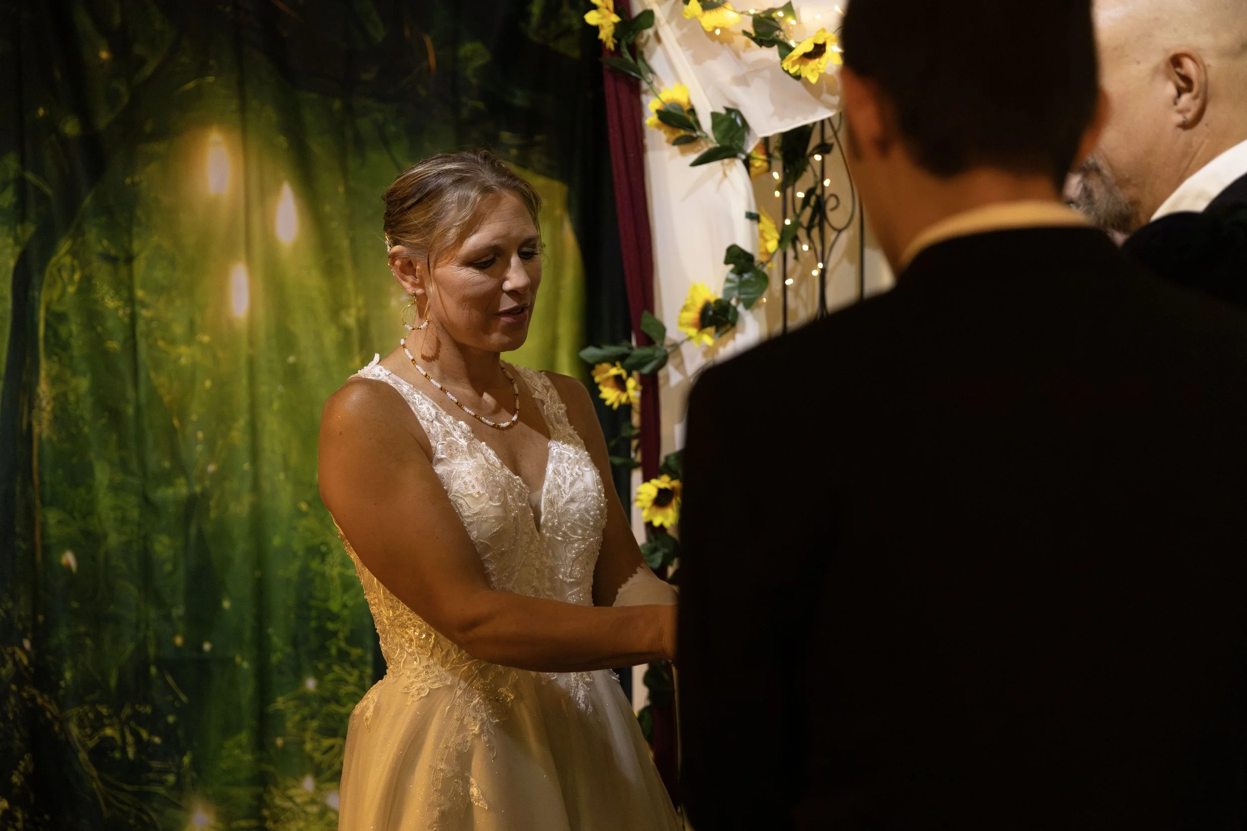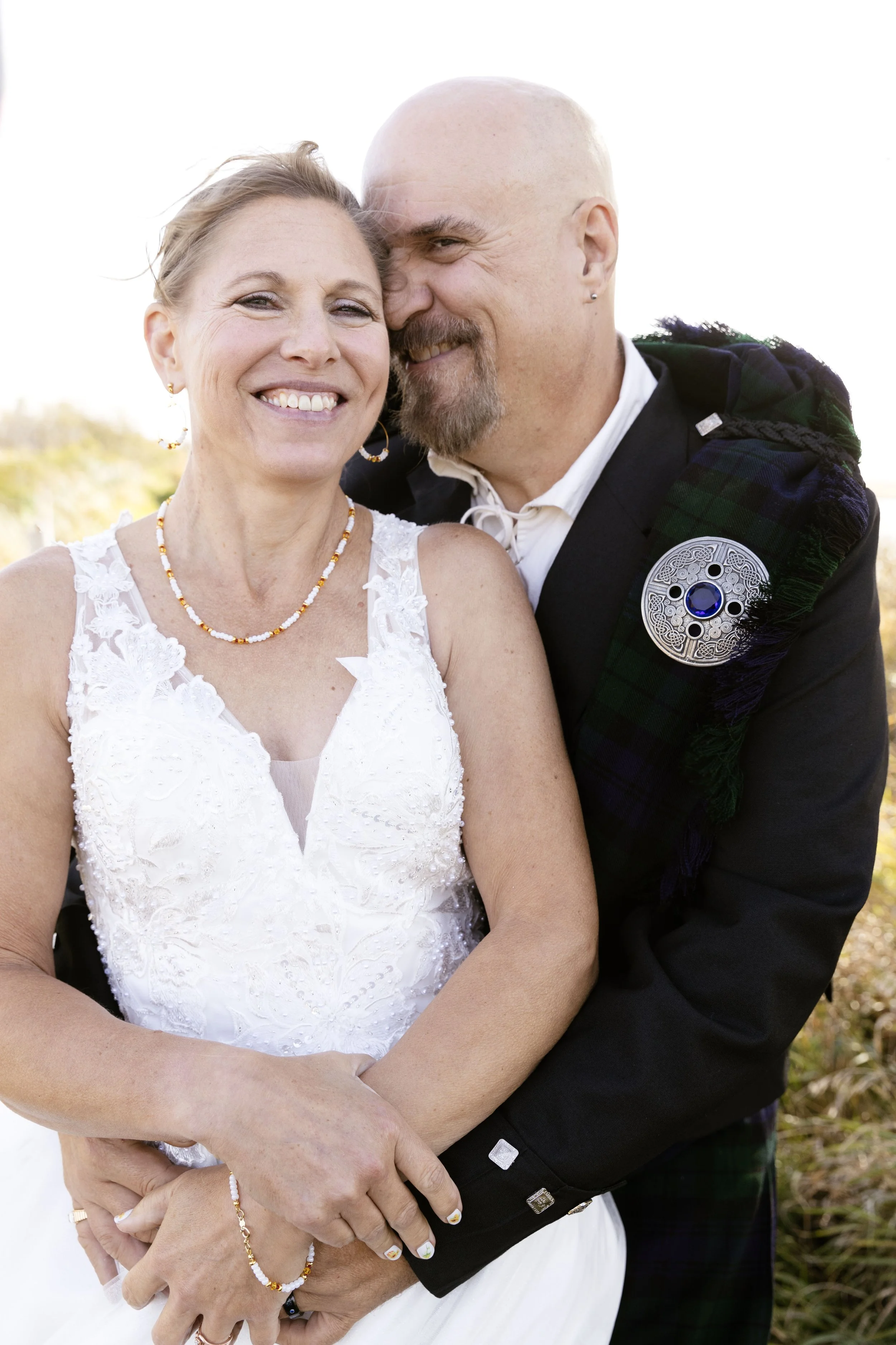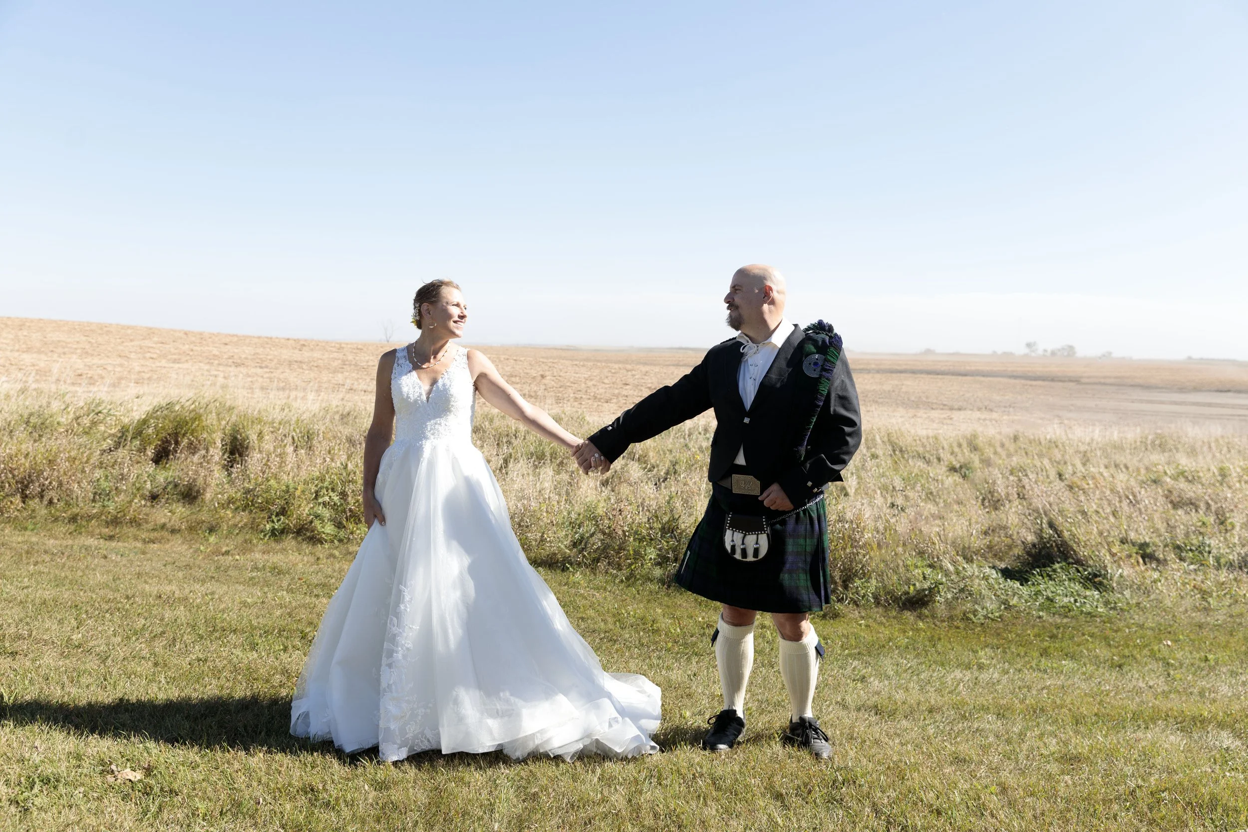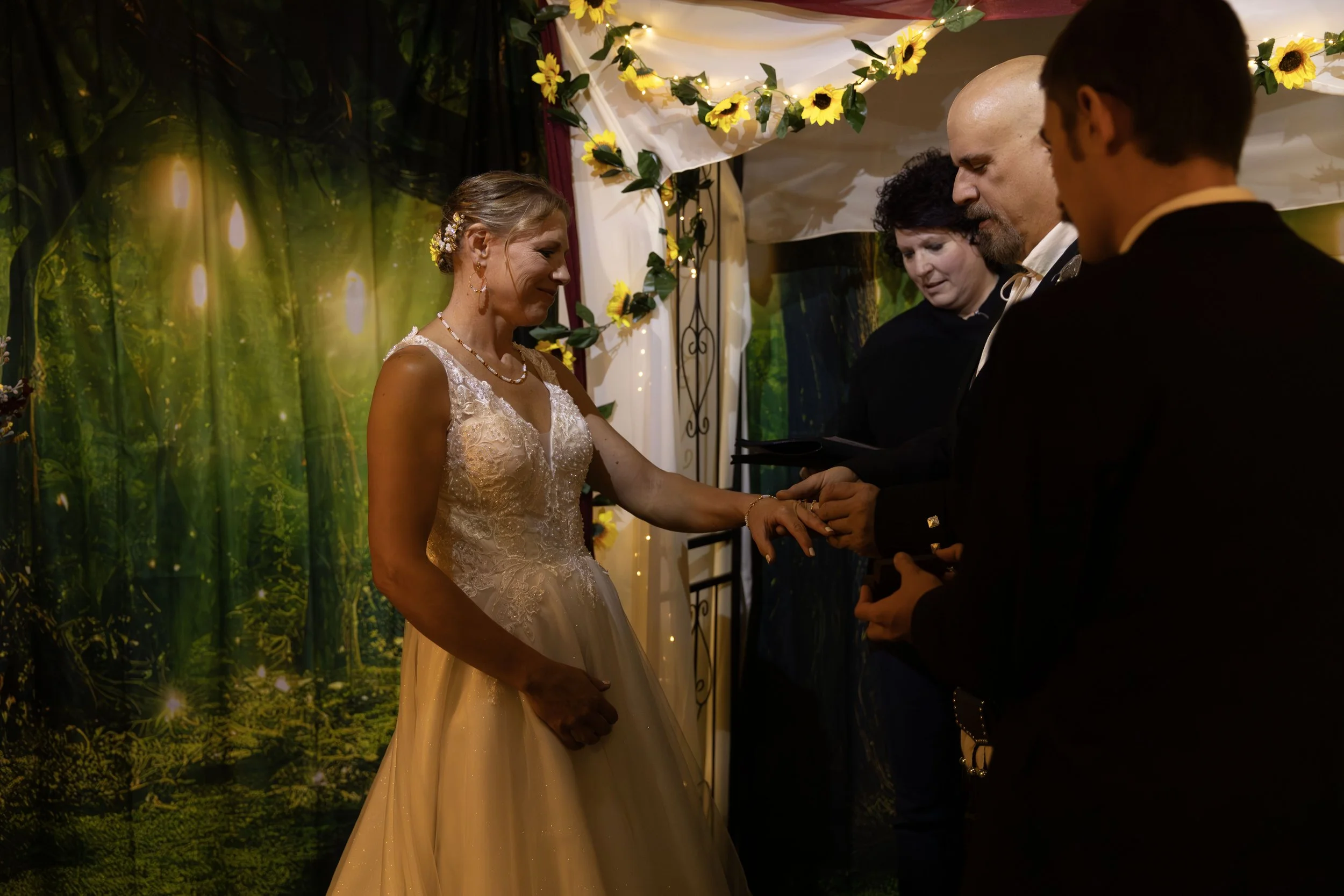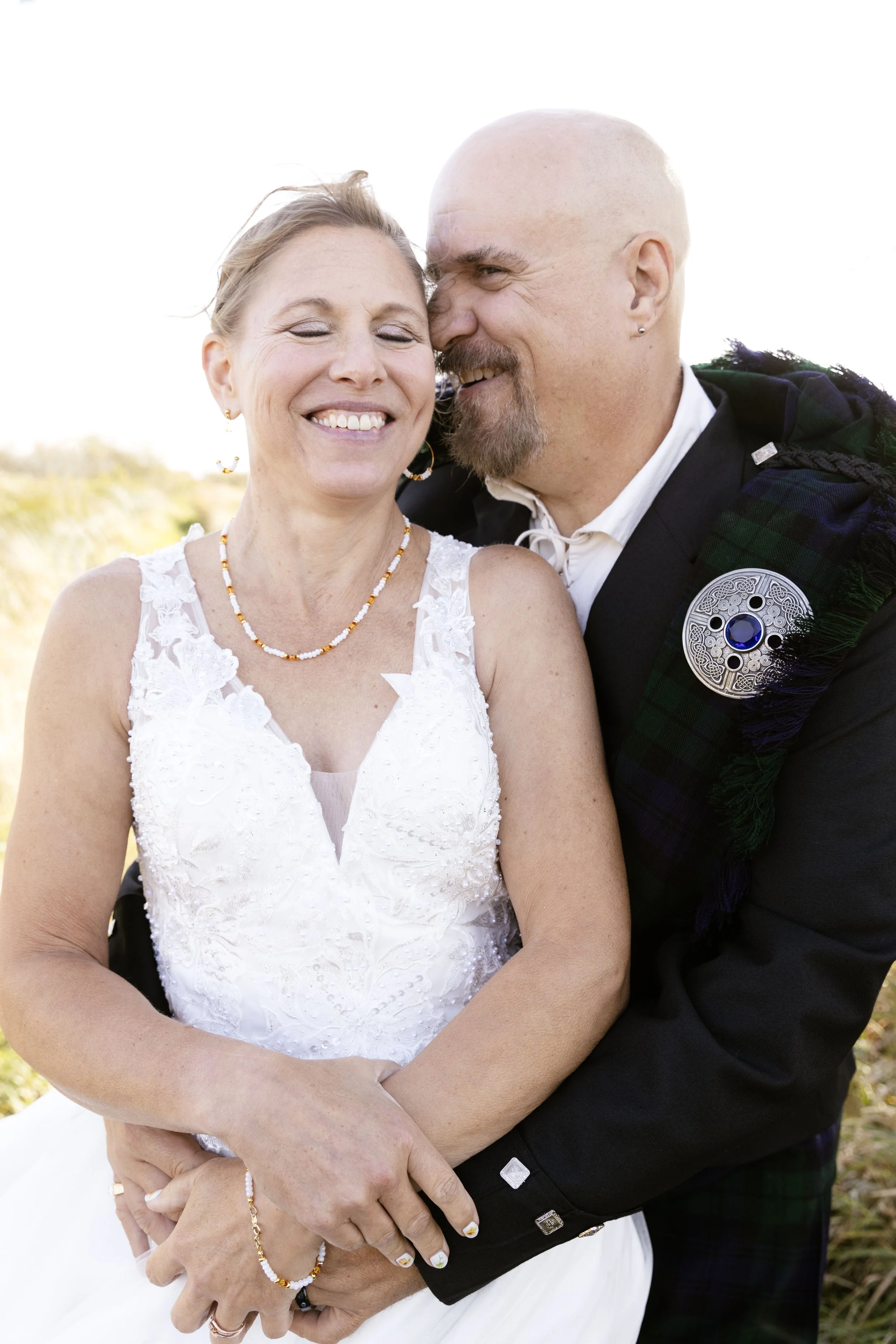 On a windy, sunny October day in 2024, Christine and Walt got married on their own land surrounded by a few friends, and family. It was fitting that sunflowers were part of the decor on such a sunny day. The wind added a sort of editorial feel to their portraits.
